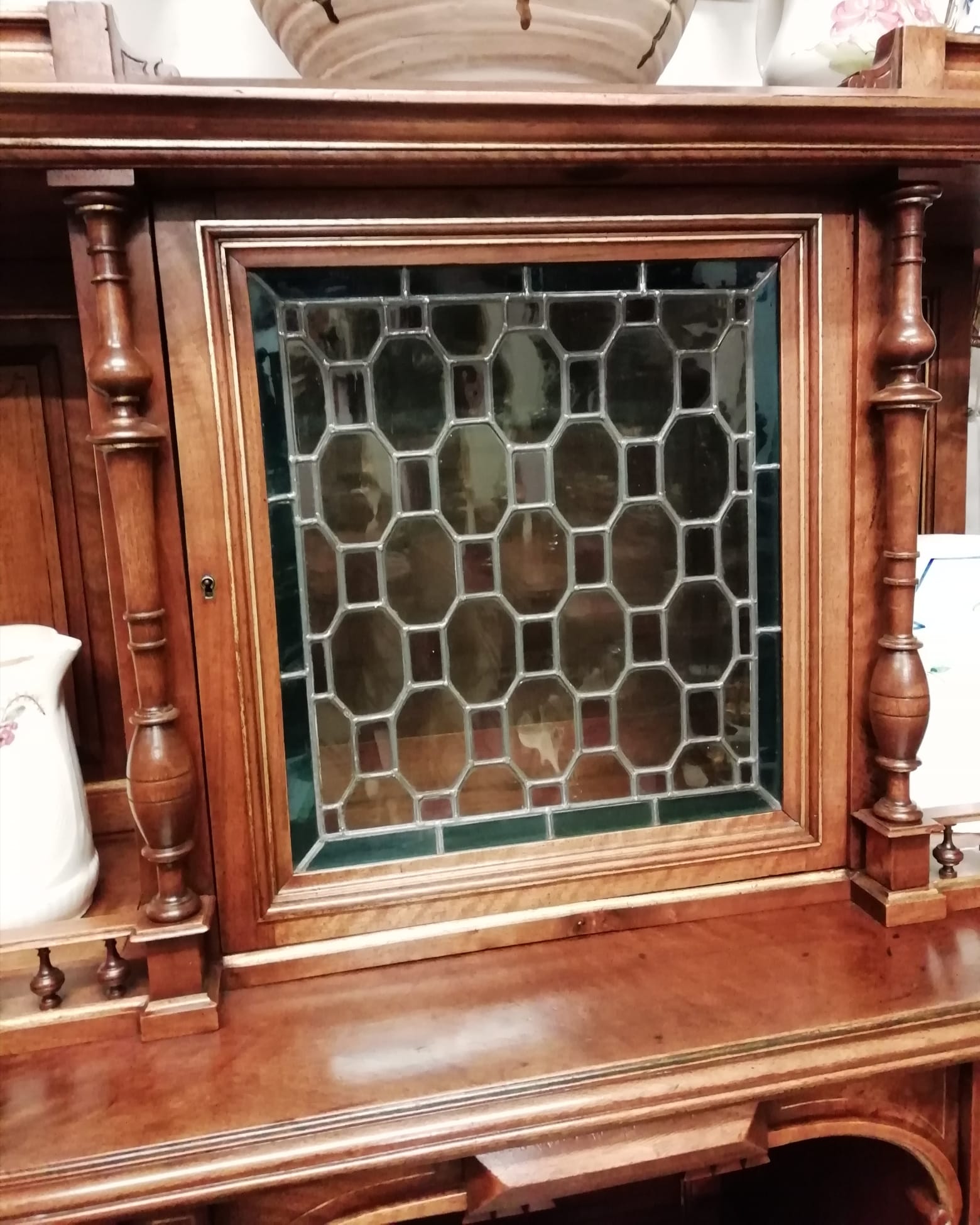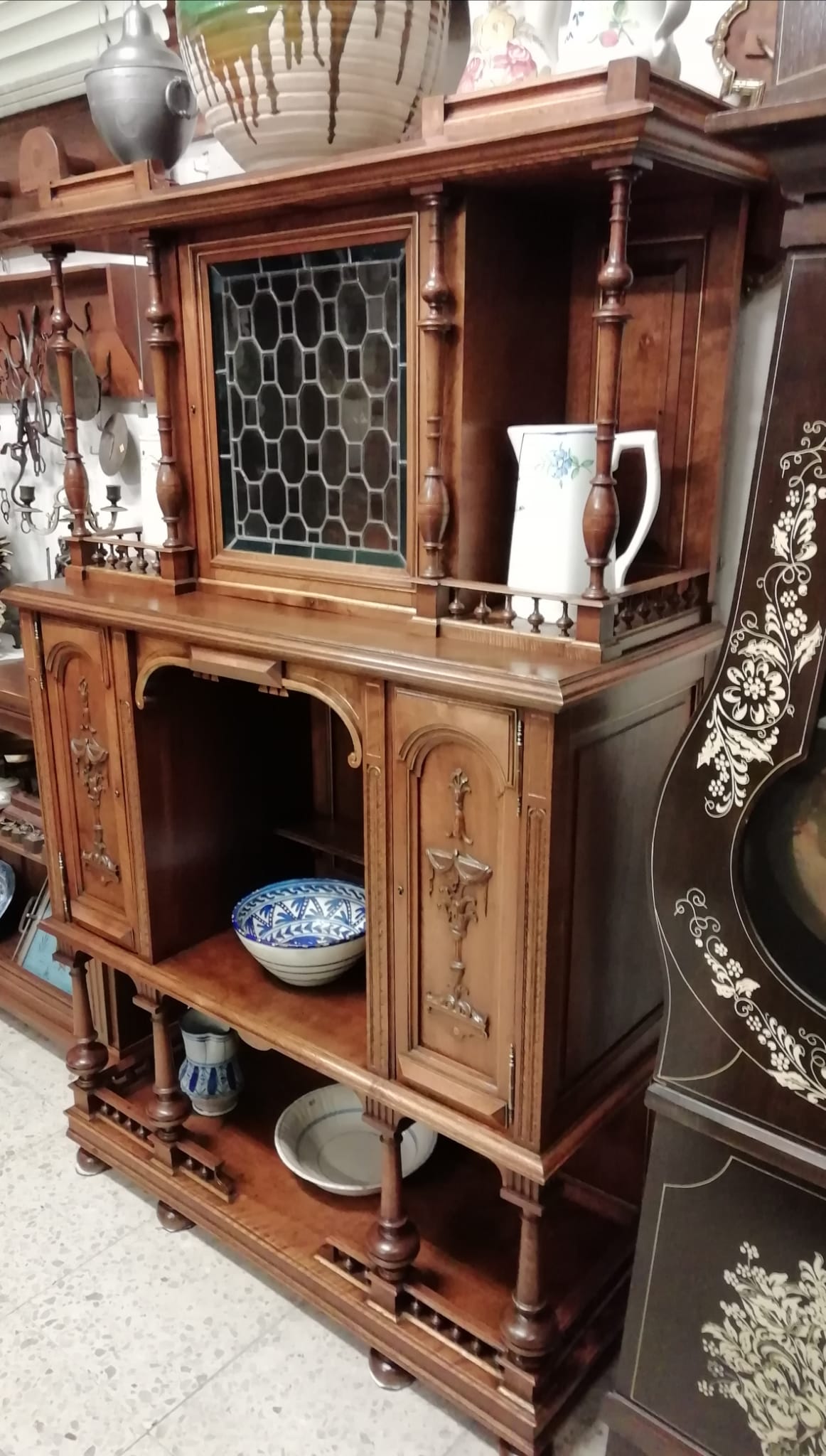 Aparador-expositor antiguo en madera de Nogal, mueble muy original y bonito de gran factura en su elaboración y acabados con pan de oro. Presenta una puerta central con vidriera emplomada y hornacinas a ambos lados de esta.