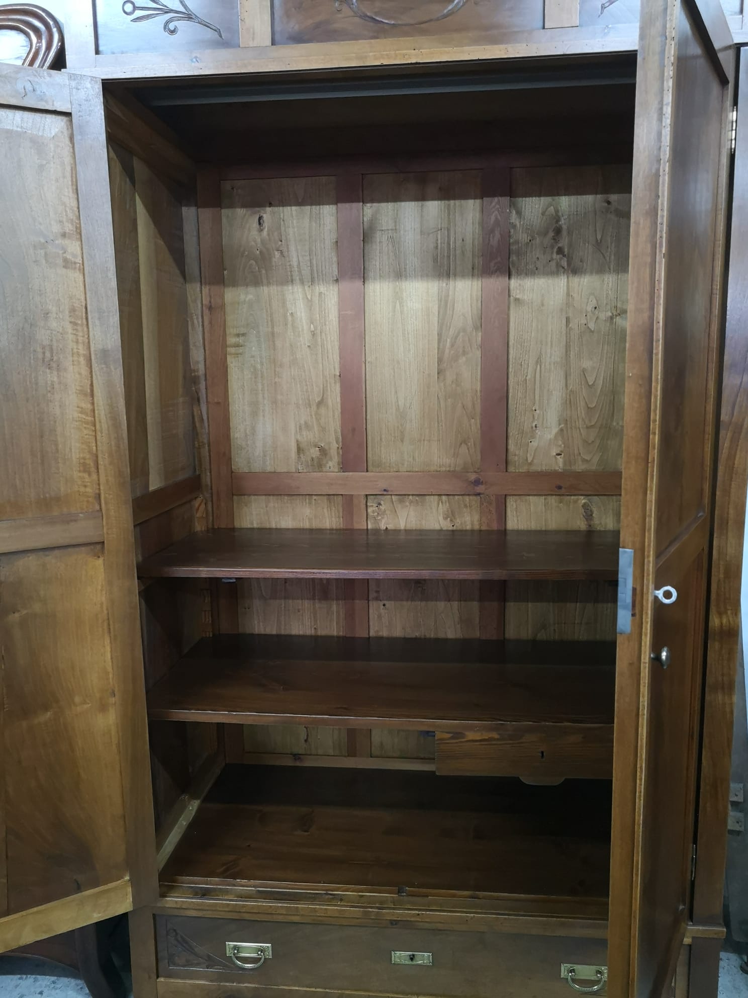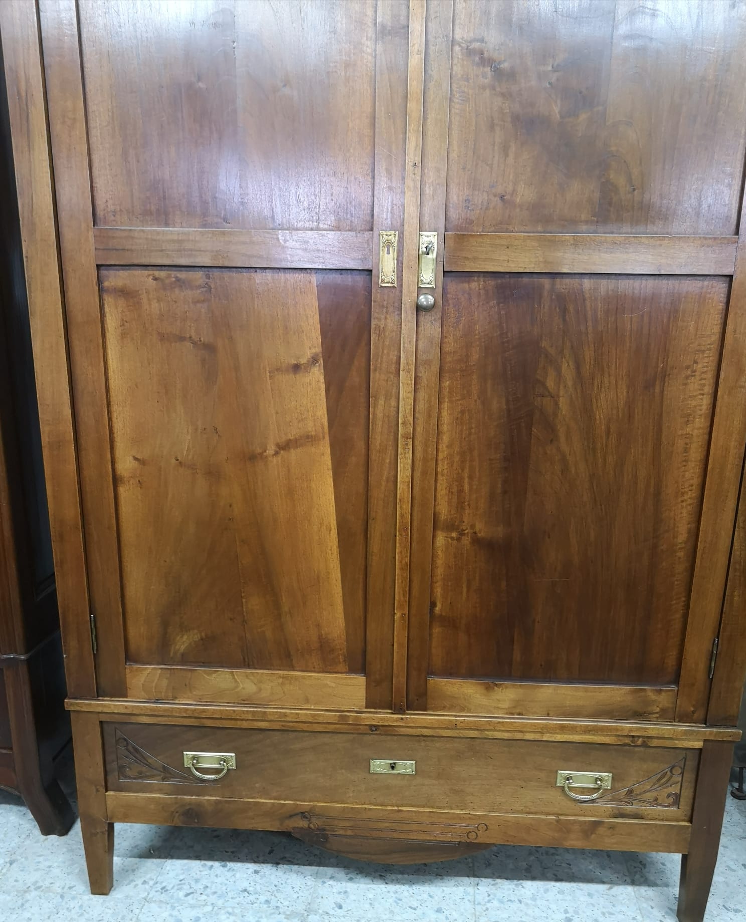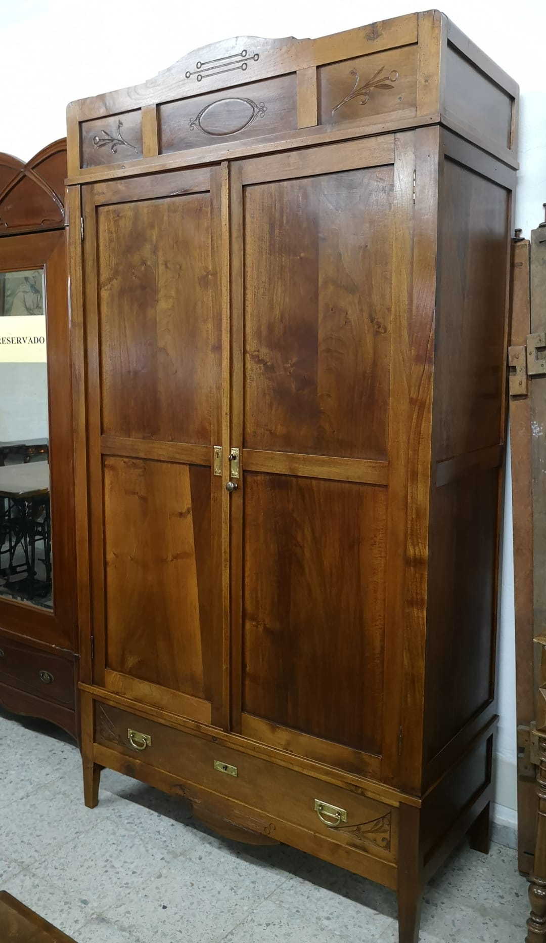 Armario ropero en madera de nogal de dos puertas totalmente restaurado. Dos baldas regulables, una con cajón interior, barra para ropa y cajón grande exterior, con llave y tirador.