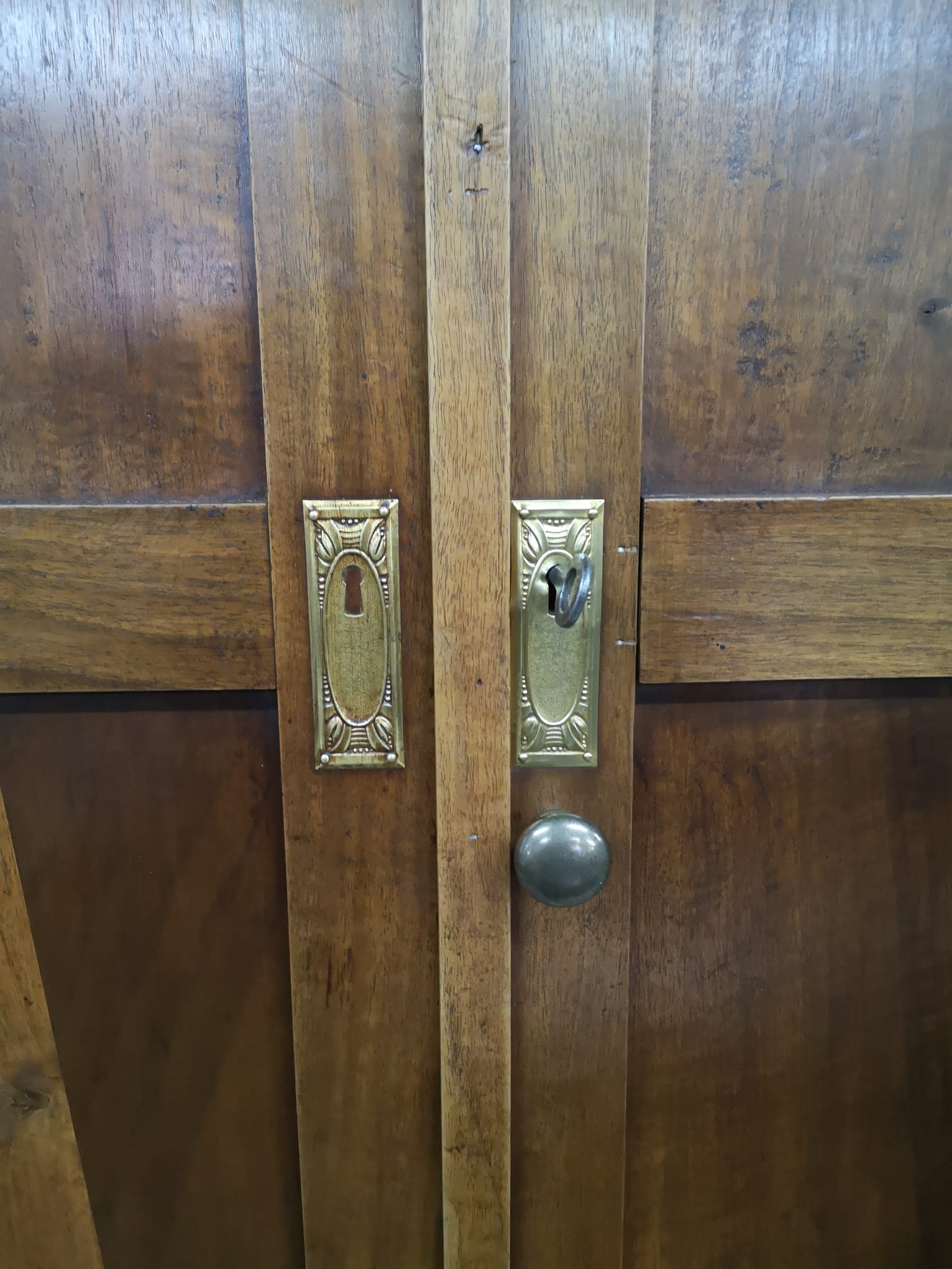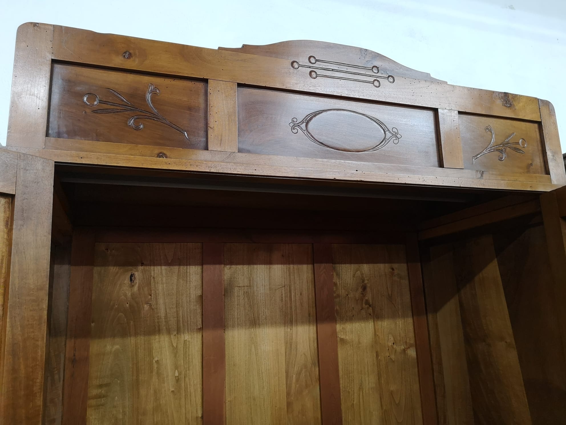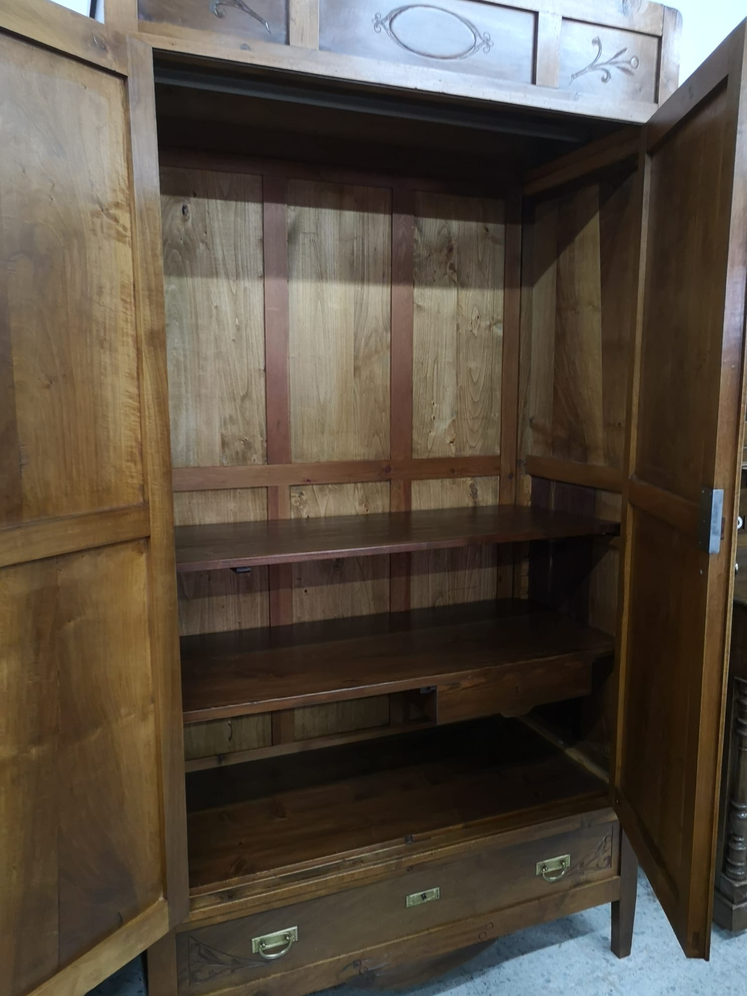 Armario ropero en madera de nogal de dos puertas totalmente restaurado. Dos baldas regulables, una con cajón interior, barra para ropa y cajón grande exterior, con llave y tirador.