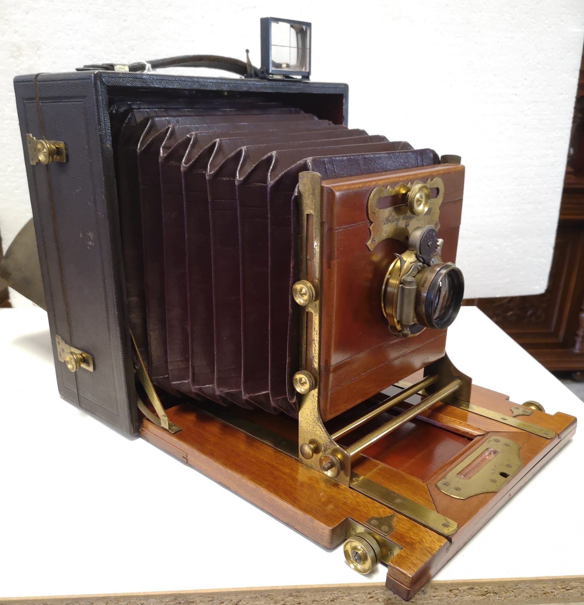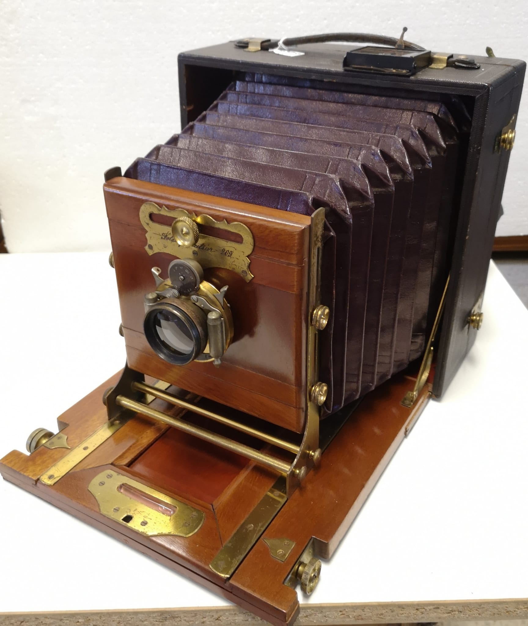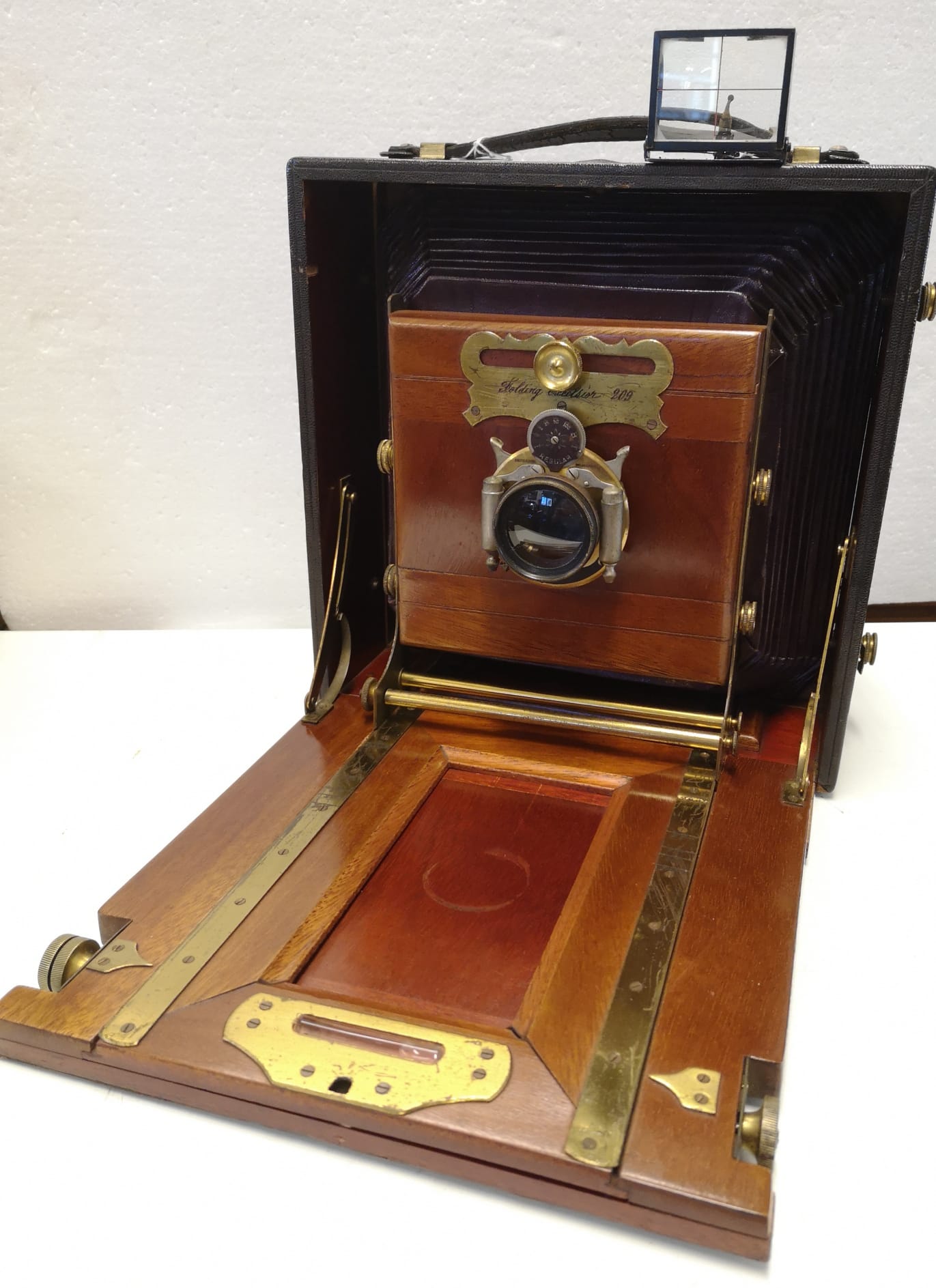 Antigua Cámara de fotos de campo, de fabricación francesa entre el año 1900 y 1901 como pone en su objetivo. Es una cámara rara y preciosa, el exterior en cuero y el interior acabado en fantástica madera de caoba, su fuelle rojo, y las partes de latón con su baño dorado original.