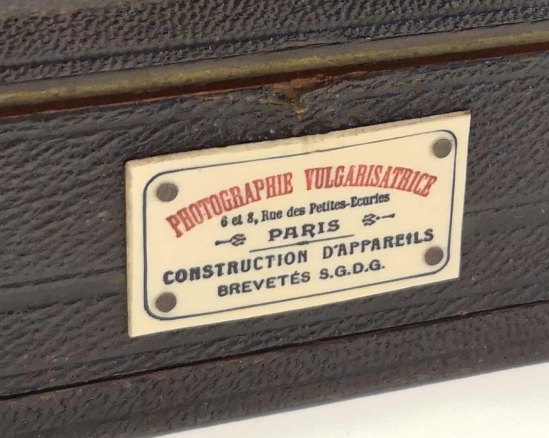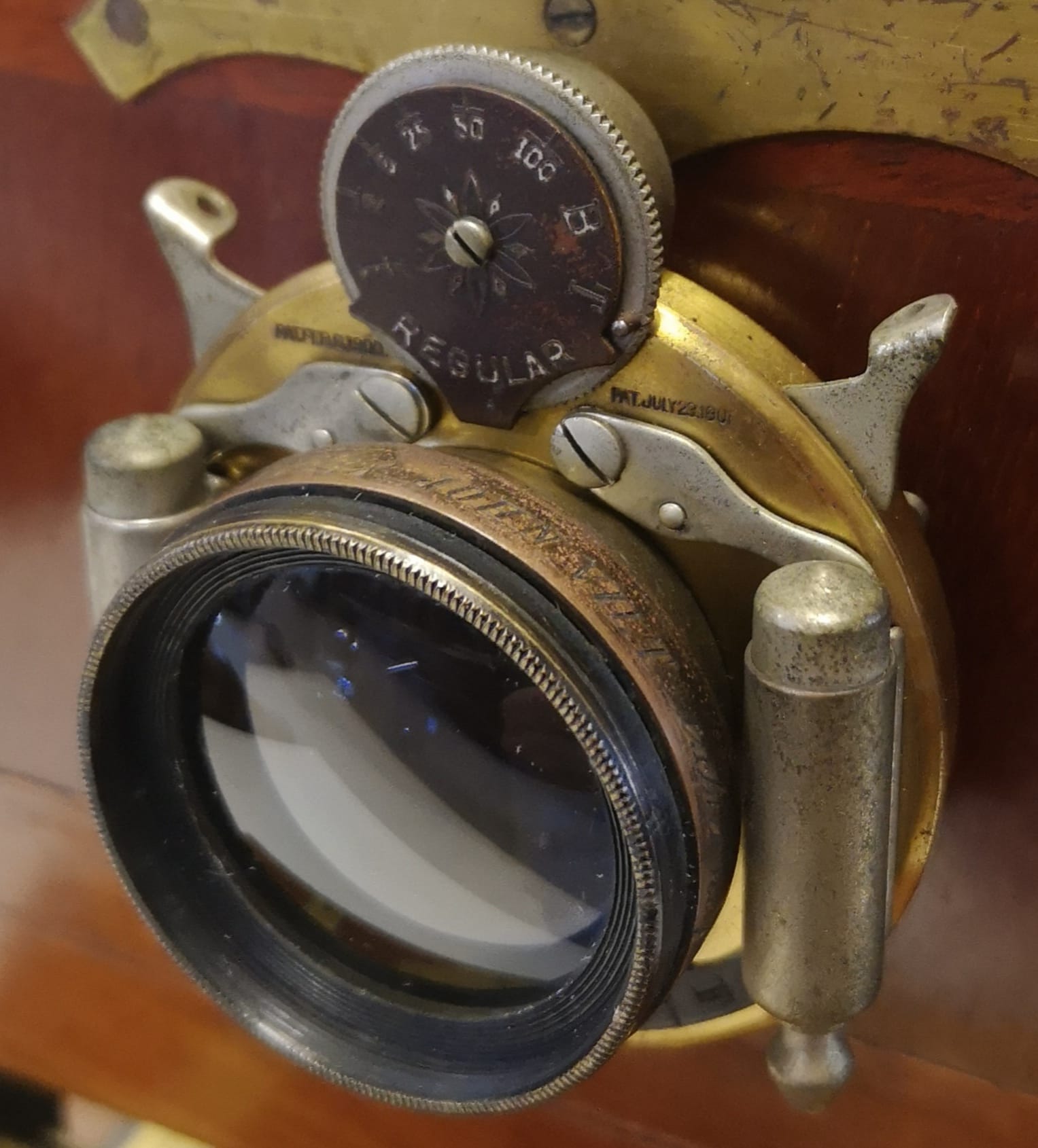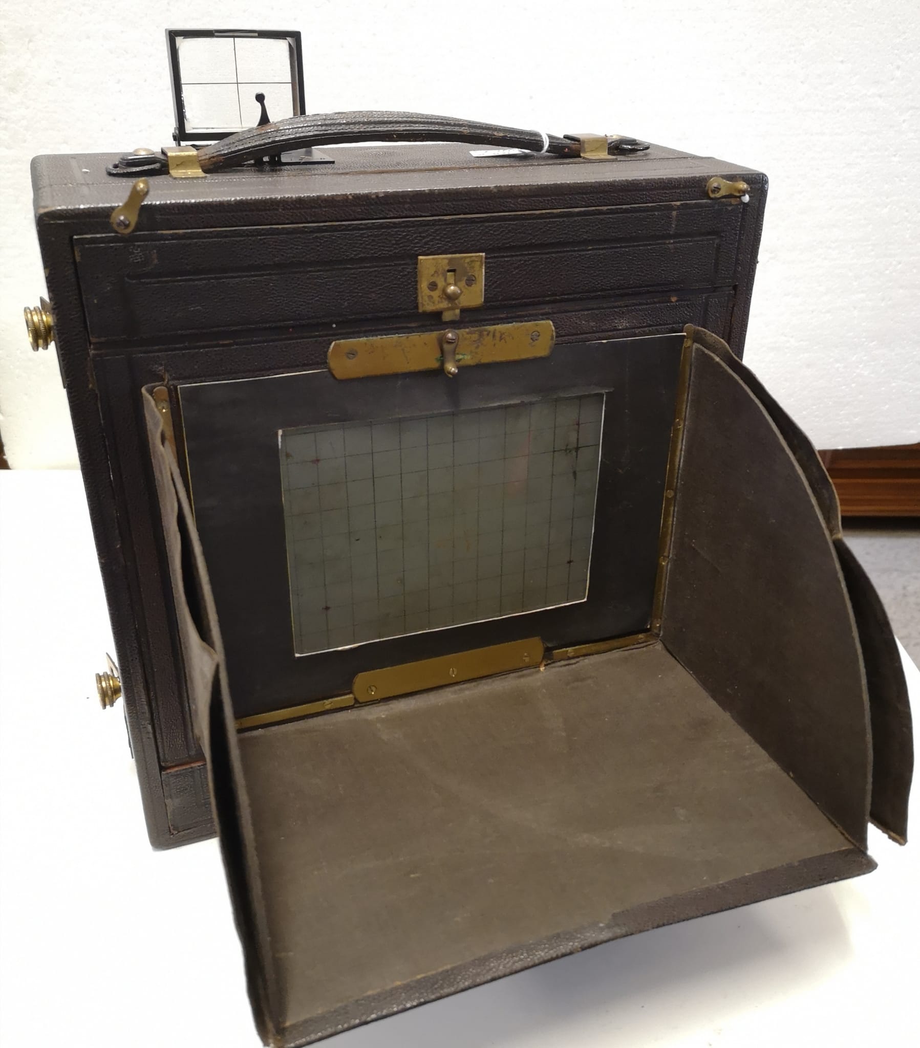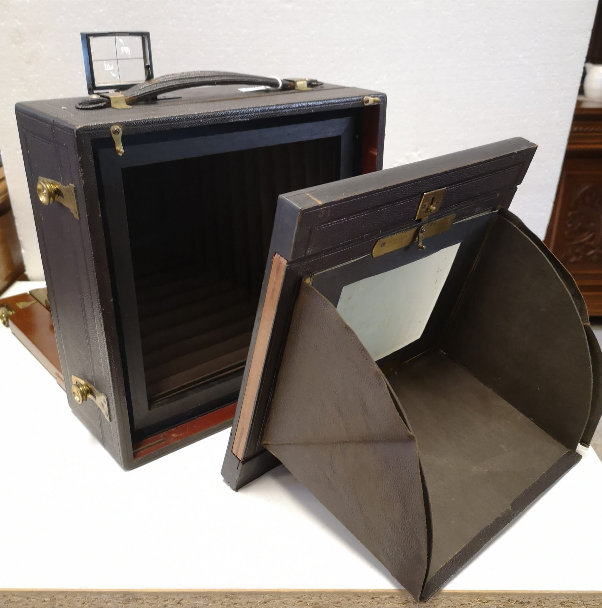 Antigua Cámara de fotos de campo, de fabricación francesa entre el año 1900 y 1901 como pone en su objetivo. Es una cámara rara y preciosa, el exterior en cuero y el interior acabado en fantástica madera de caoba, su fuelle rojo, y las partes de latón con su baño dorado original.