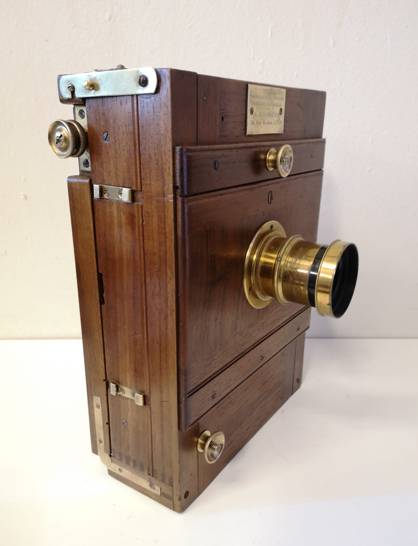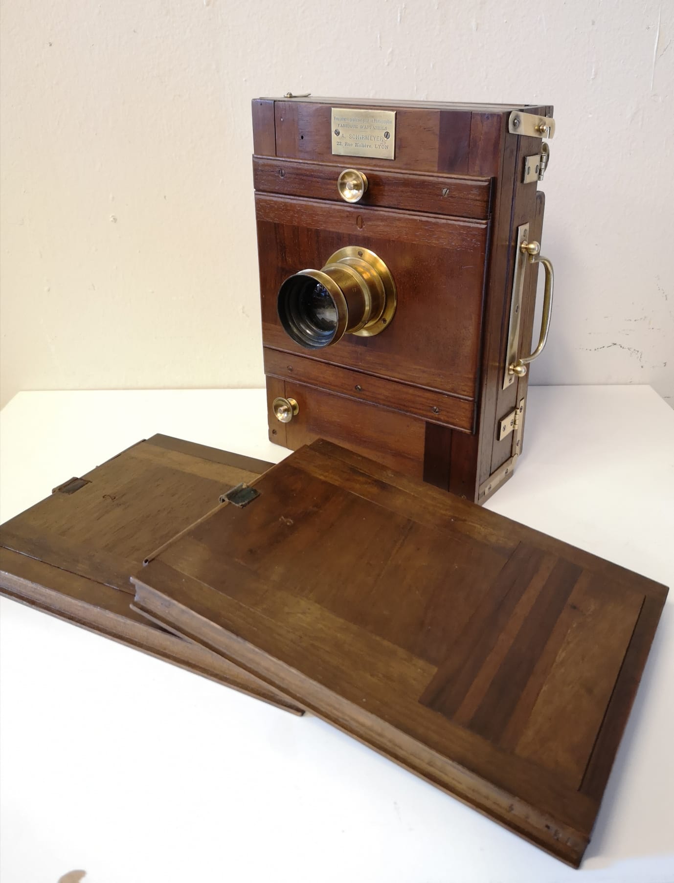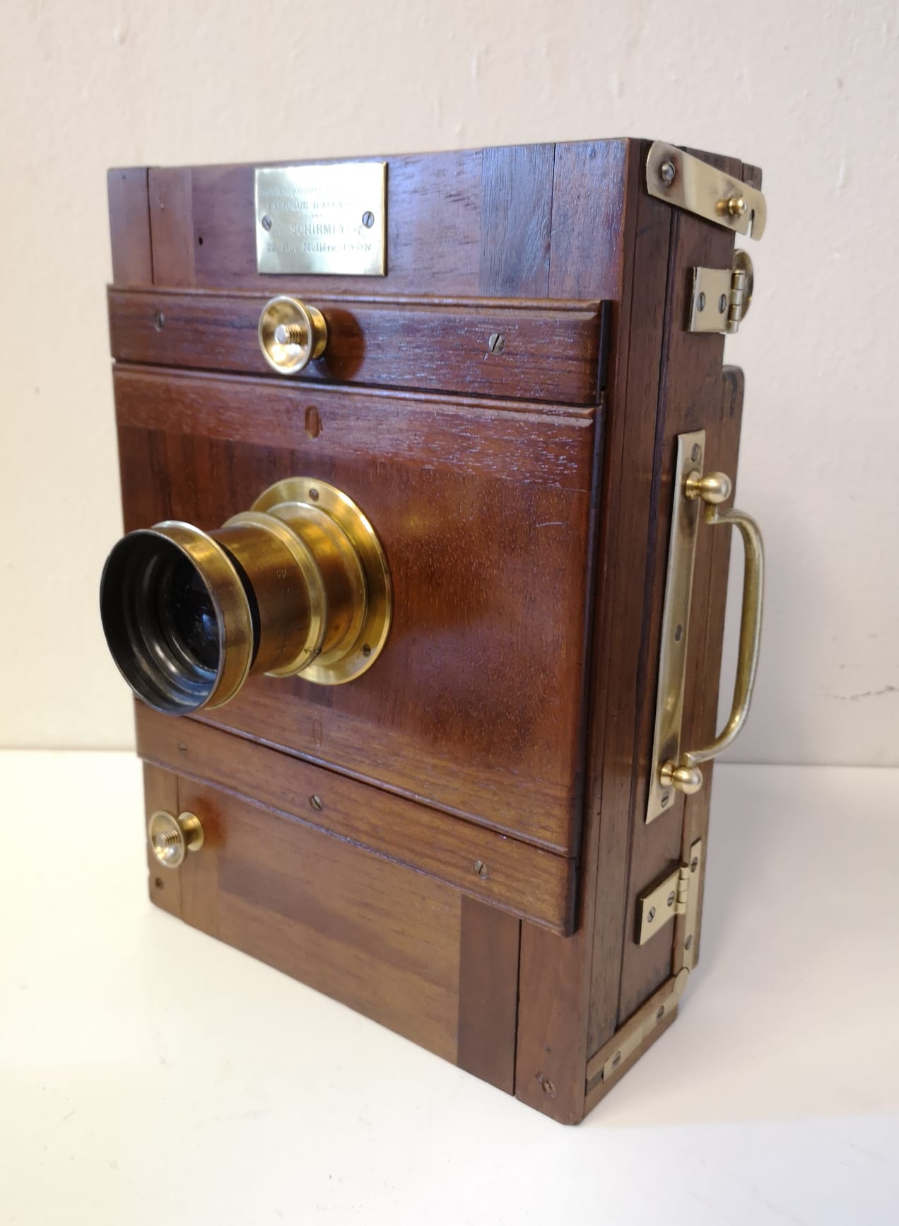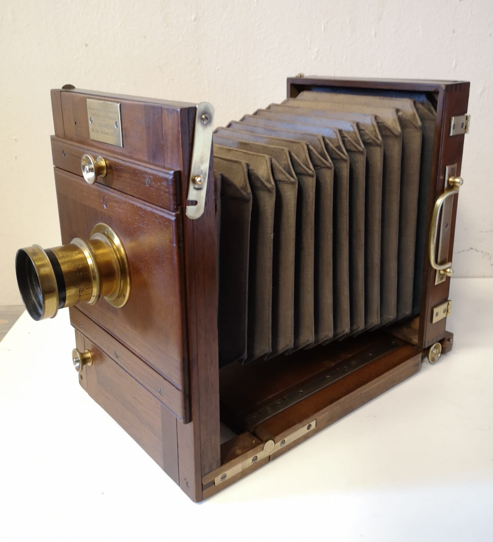 Cámara de fotos campaña madera fuelle de fabricación francesa, Lyon, hacia el año 1900 en excelente estado de conservación, tanto de su preciosa madera de teka, su herraje, como su fuelle (entero), como de su objetivo que conserva hasta su dorado original.