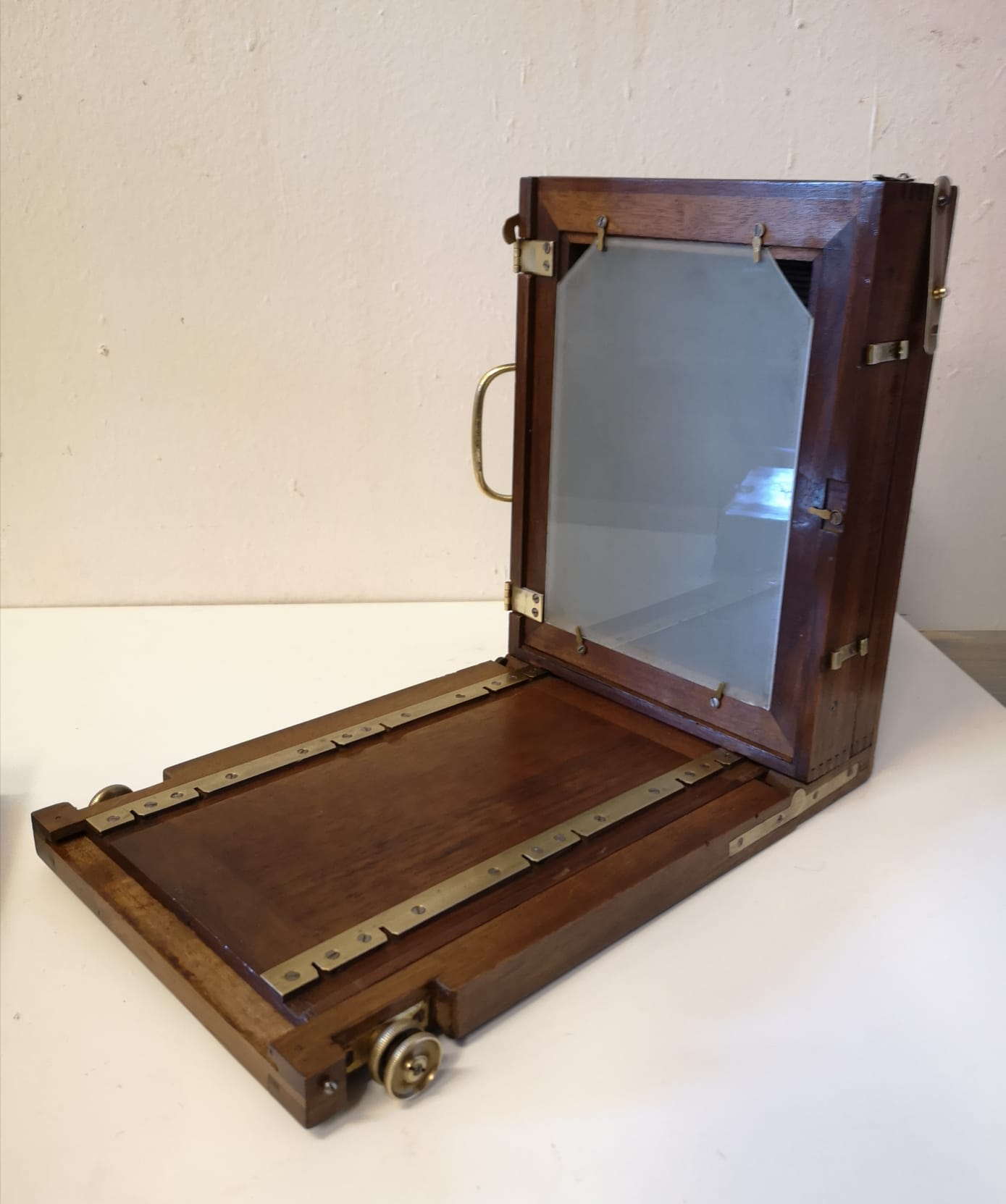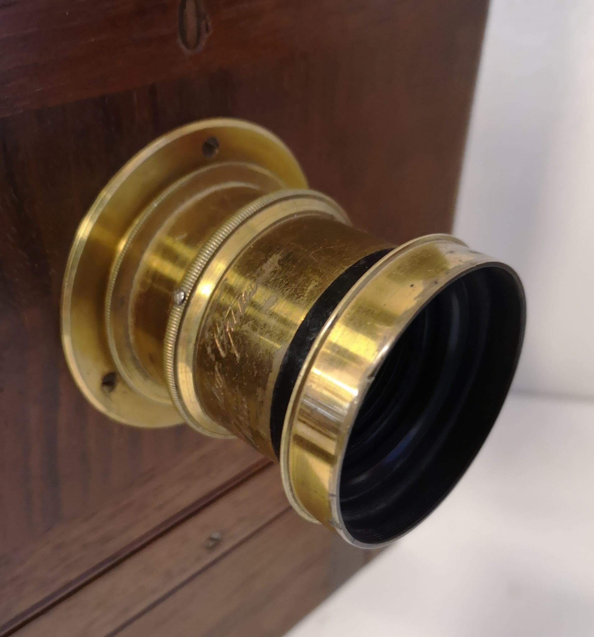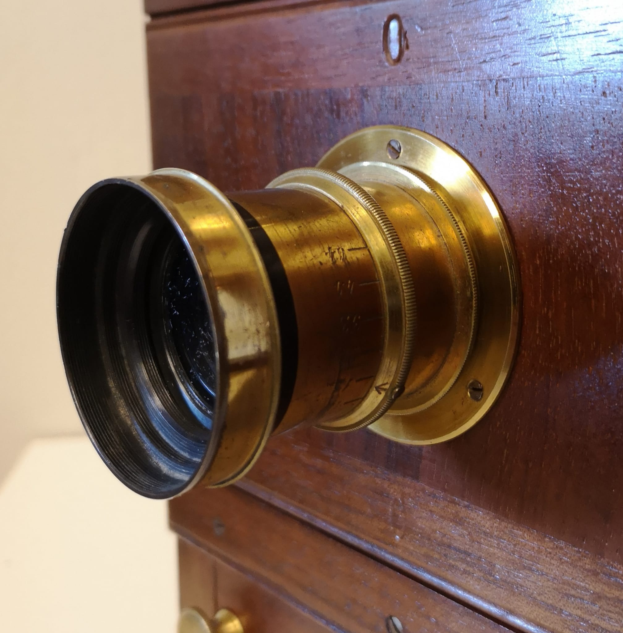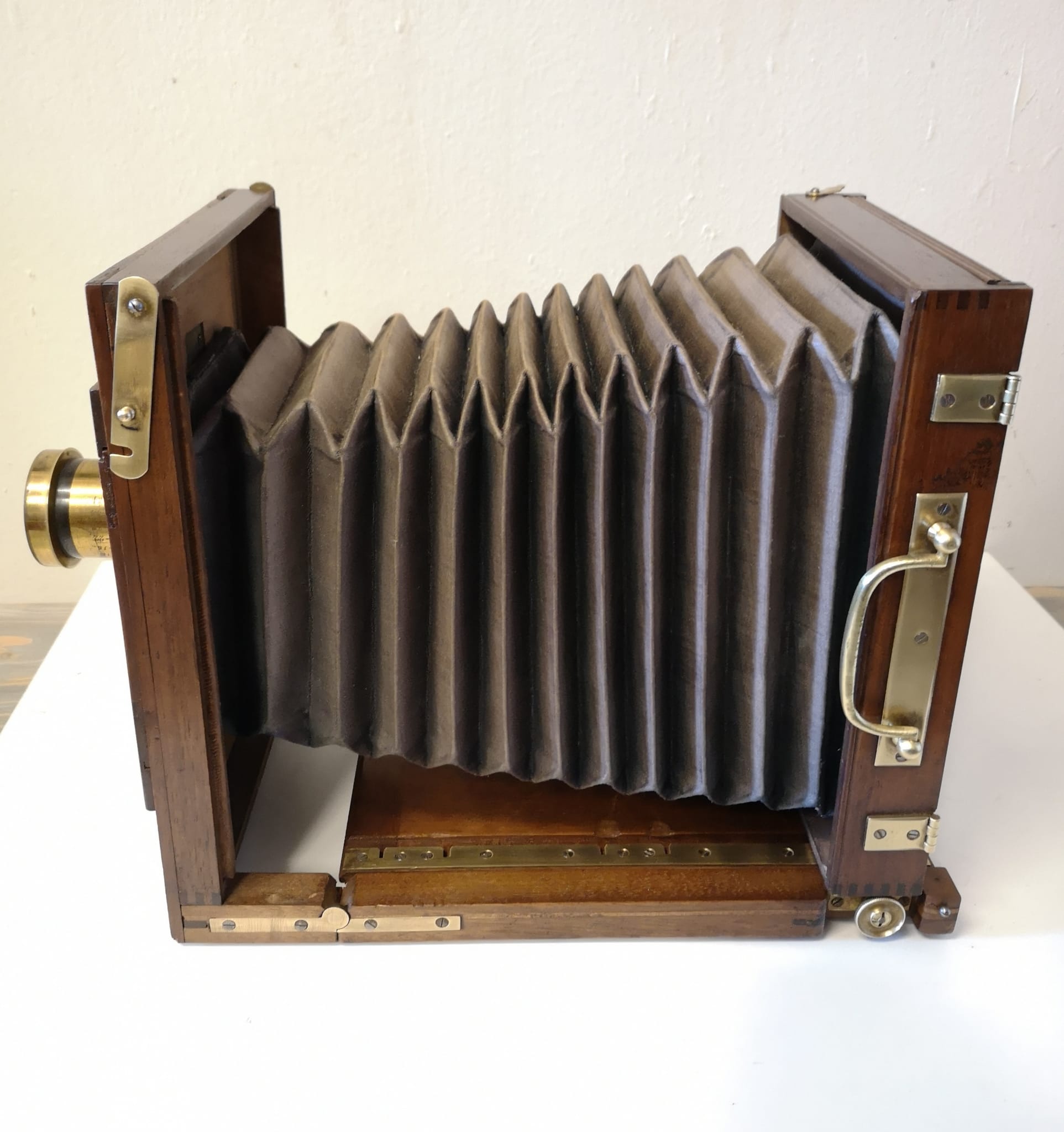 Cámara de fotos campaña madera fuelle de fabricación francesa, Lyon, hacia el año 1900 en excelente estado de conservación, tanto de su preciosa madera de teka, su herraje, como su fuelle (entero), como de su objetivo que conserva hasta su dorado original.
