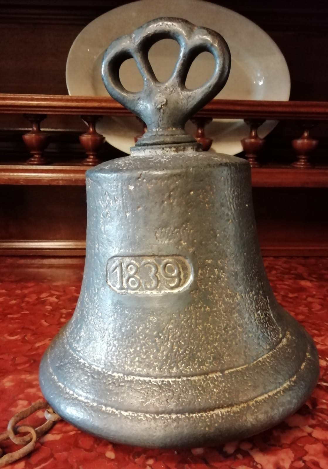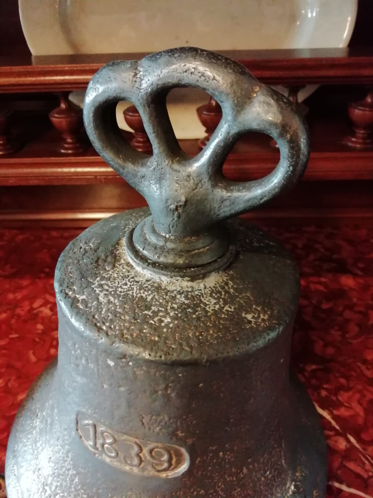 Campana bronce 1839, de fundición actual. Cadena en el badajo para el toque.
