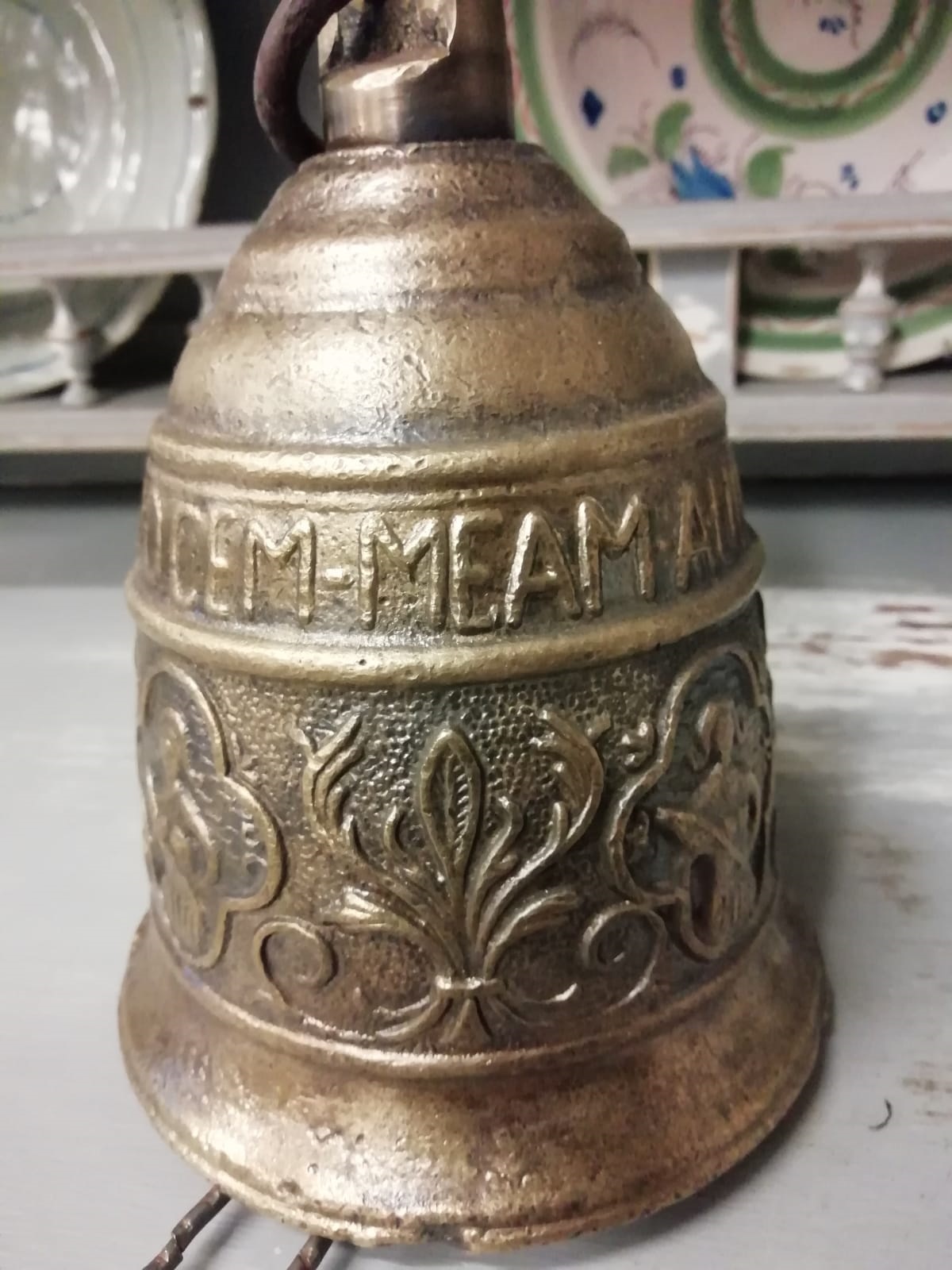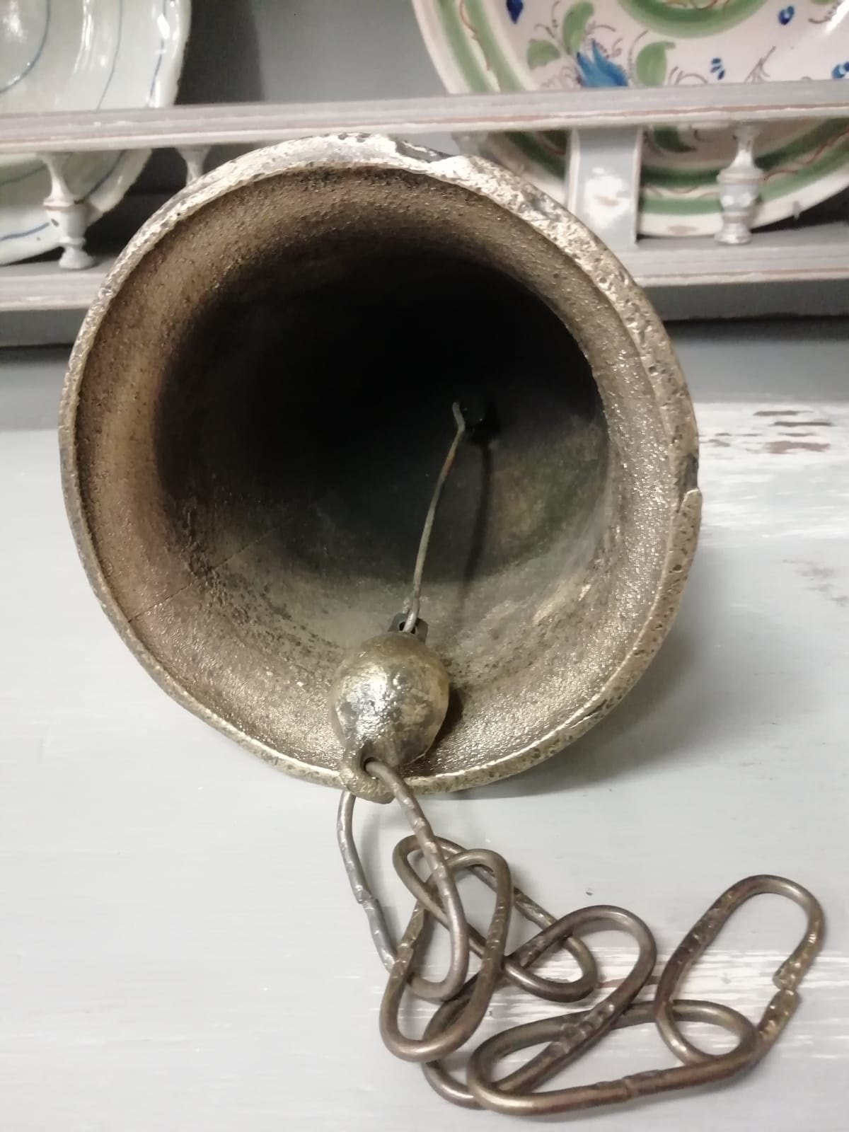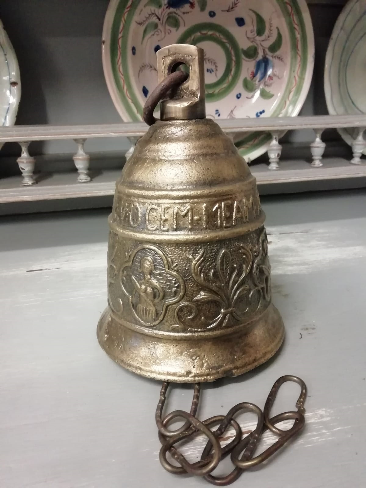 Campana bronce modelo de convento de fundición actual con inscripciones en latín y cadena en el badajo para el toque.