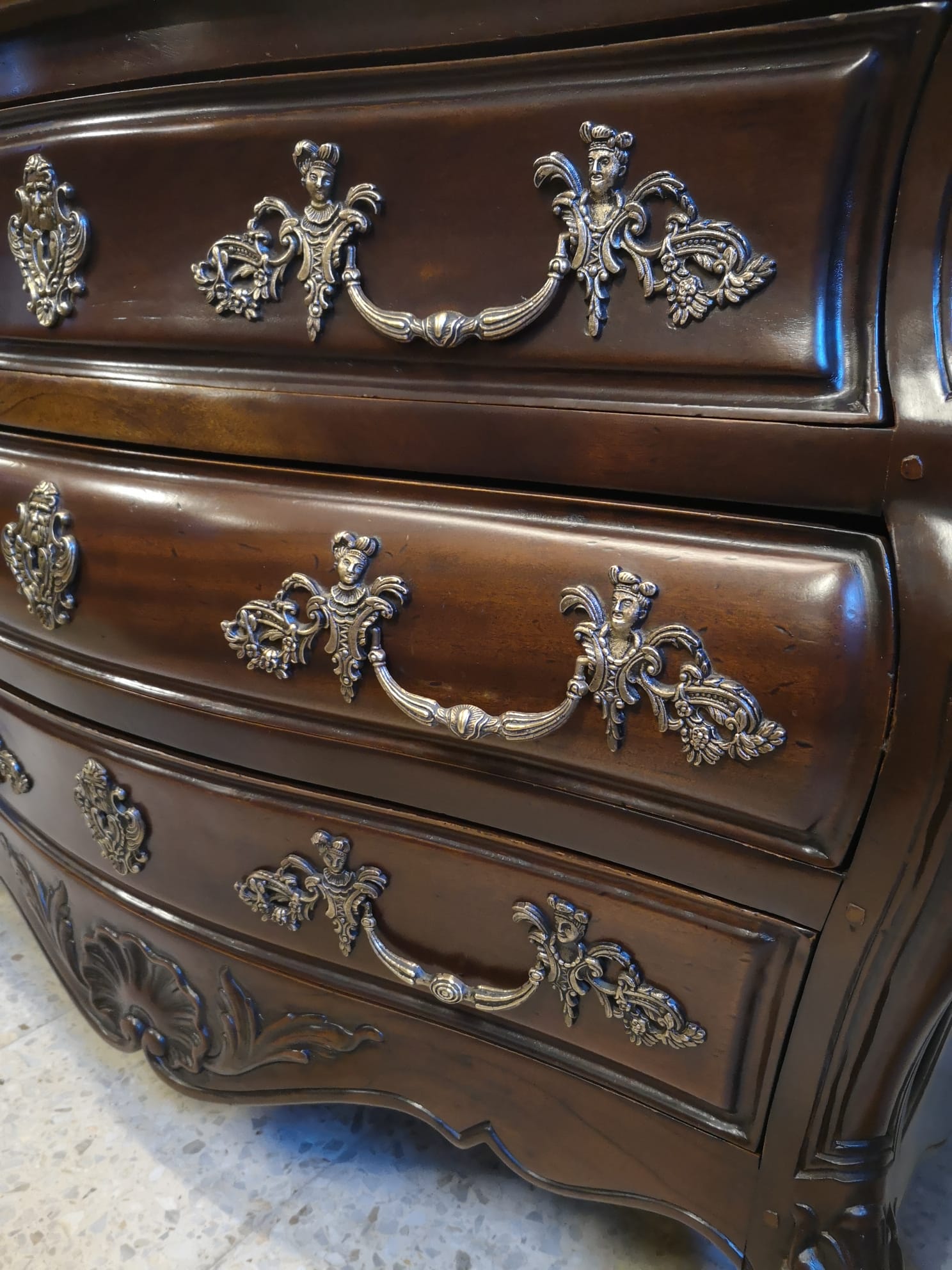 Cómoda bombé estilo Luis XV en madera de Sapeli con herrajes originales. Perfecto estado.