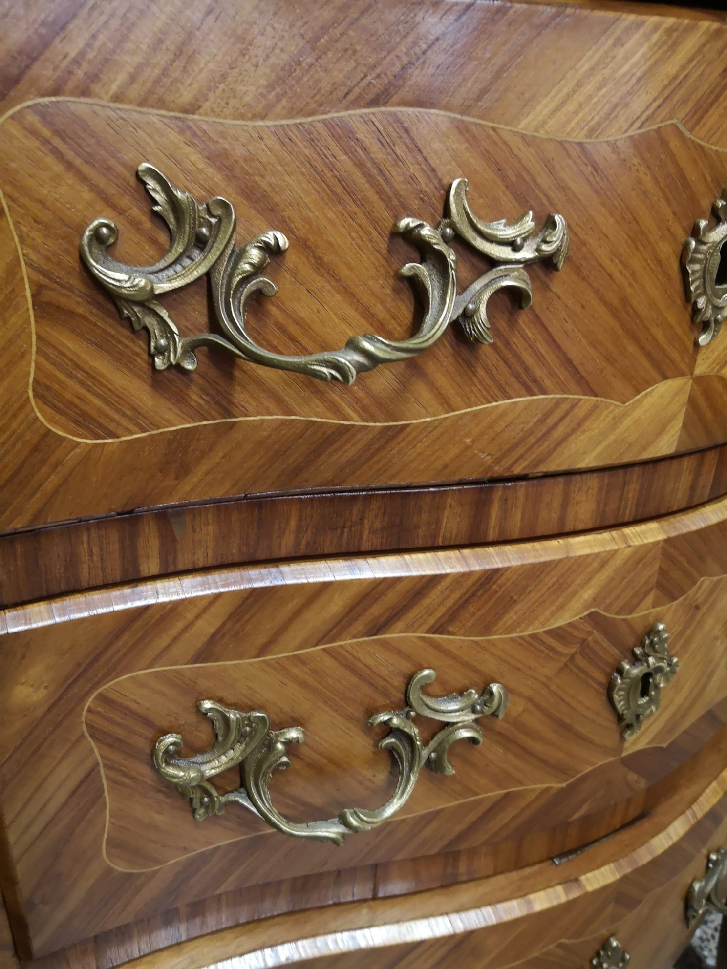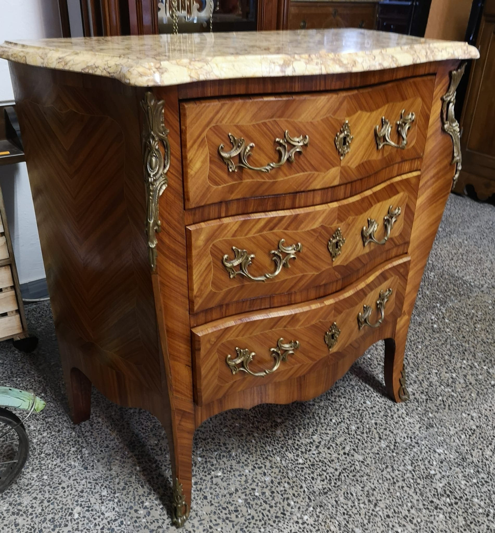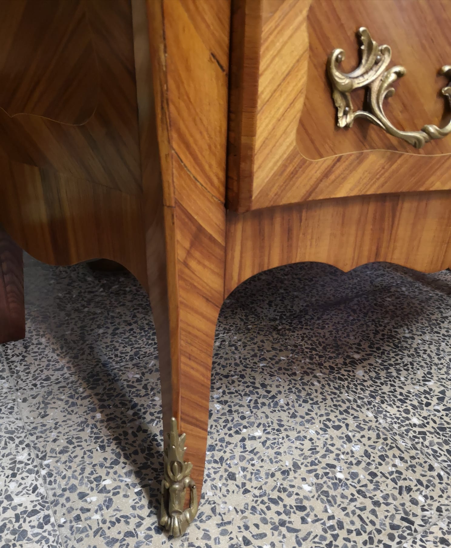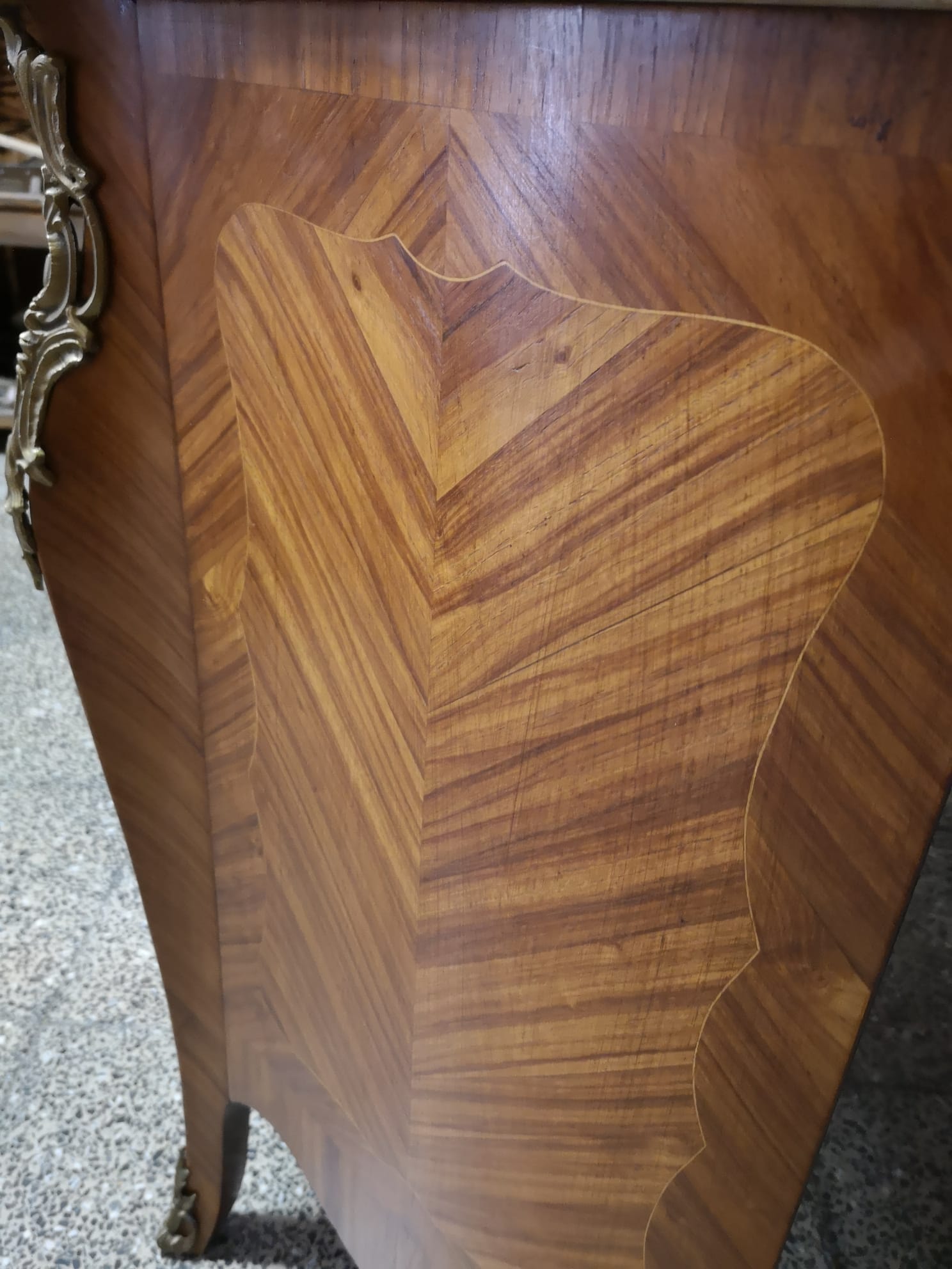 Cómoda estilo Luis XV ff S XIX – pp S XX realizada en marquetería de diferentes maderas nobles (palo santo, palo rosa, palisandro)trabajadas a plumilla. Interior en roble.