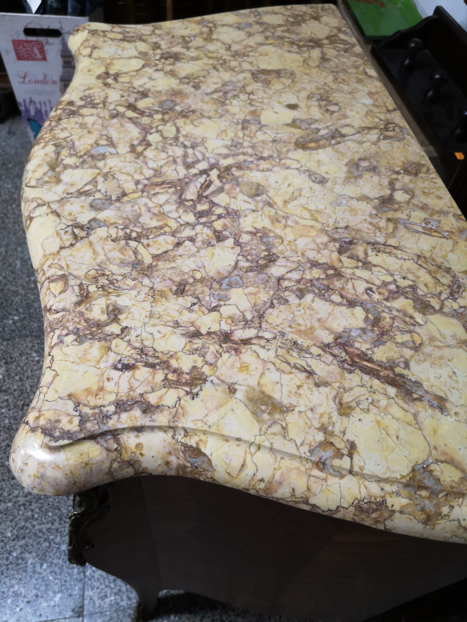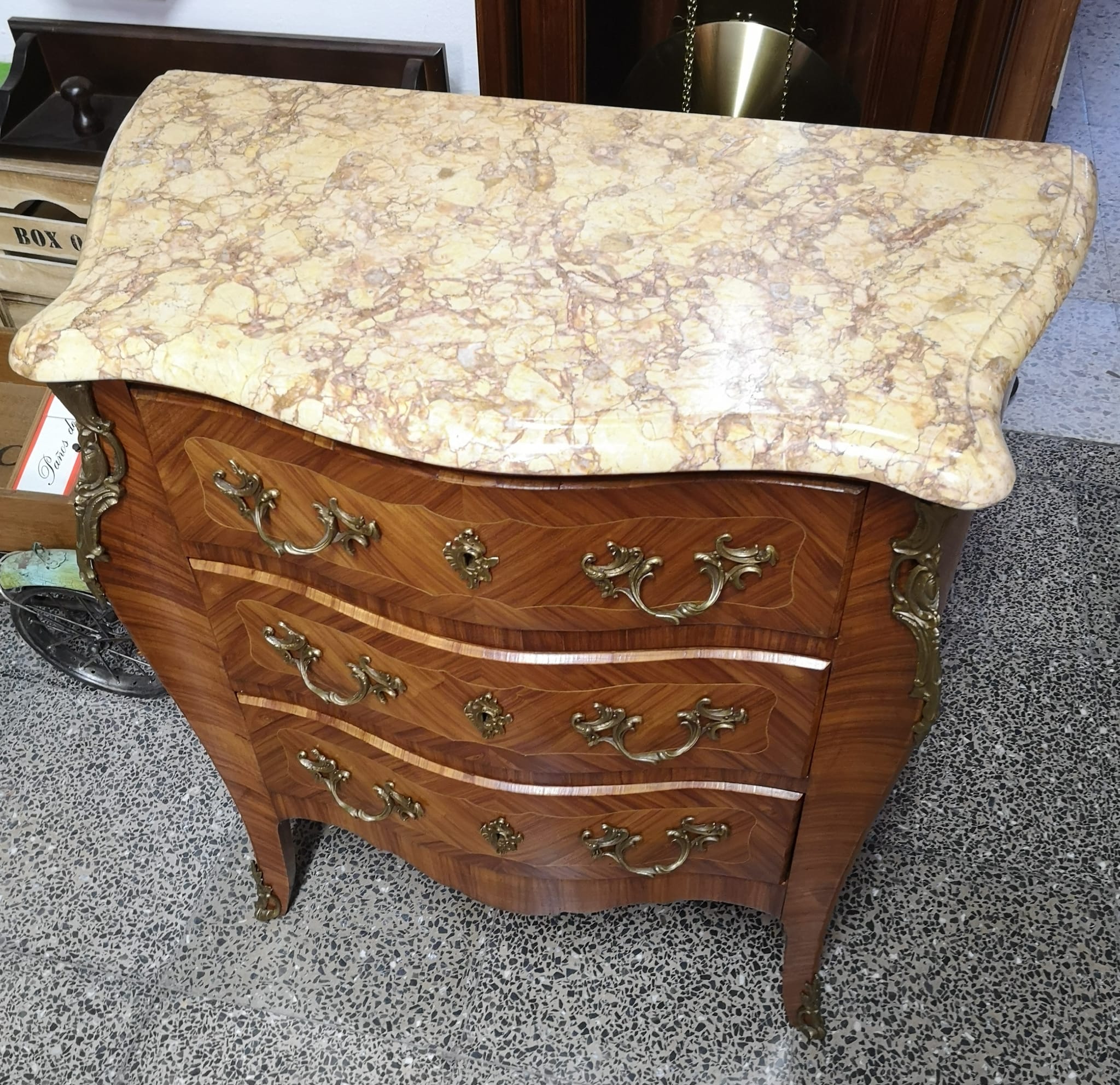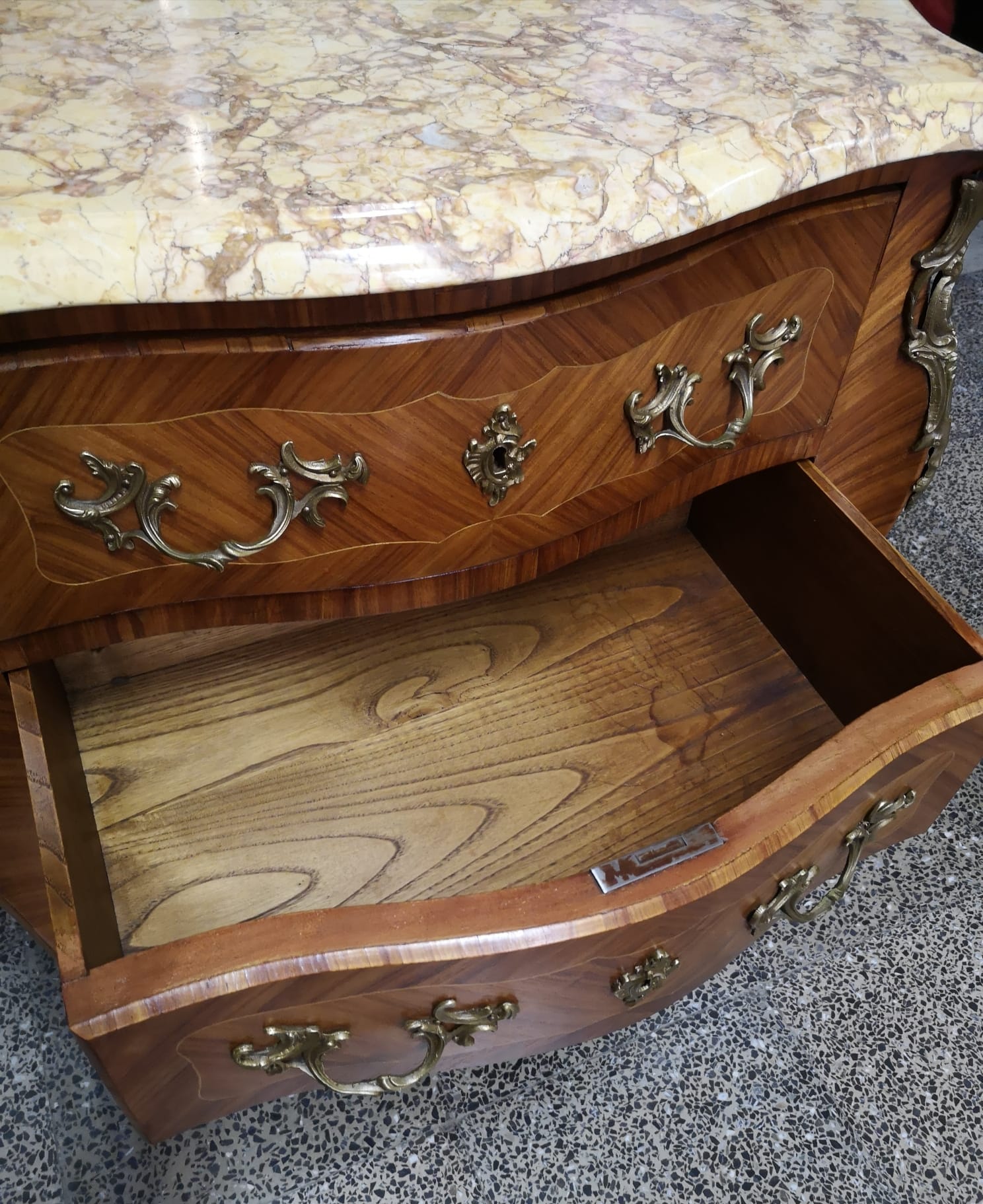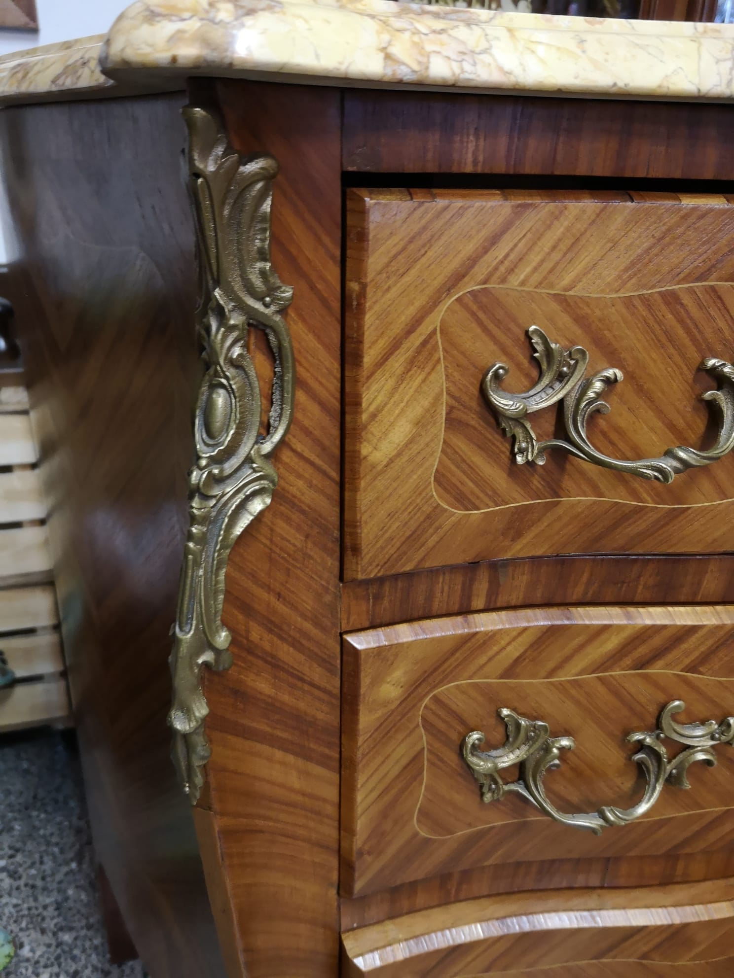 Cómoda estilo Luis XV ff S XIX – pp S XX realizada en marquetería de diferentes maderas nobles (palo santo, palo rosa, palisandro)trabajadas a plumilla. Interior en roble.