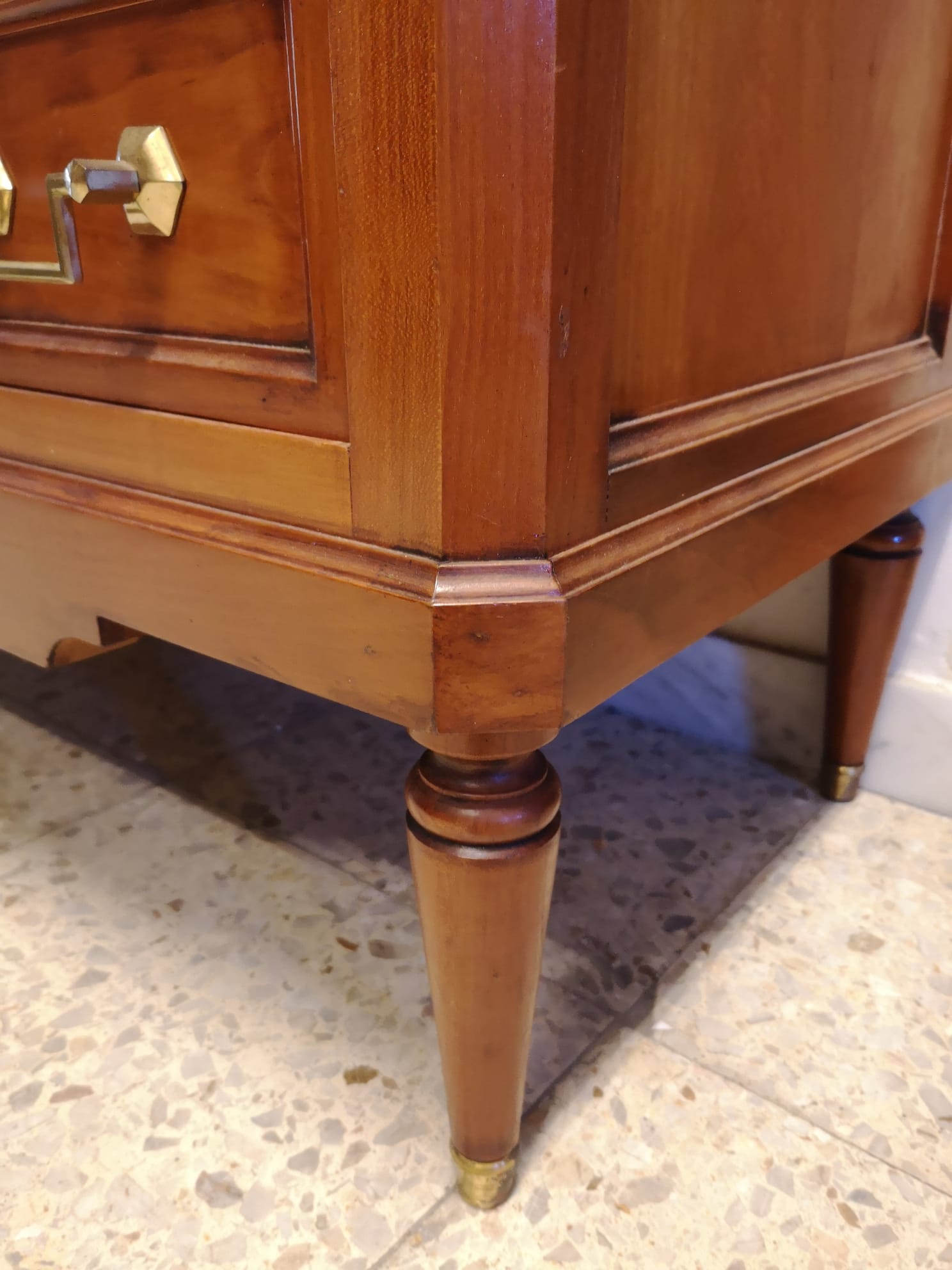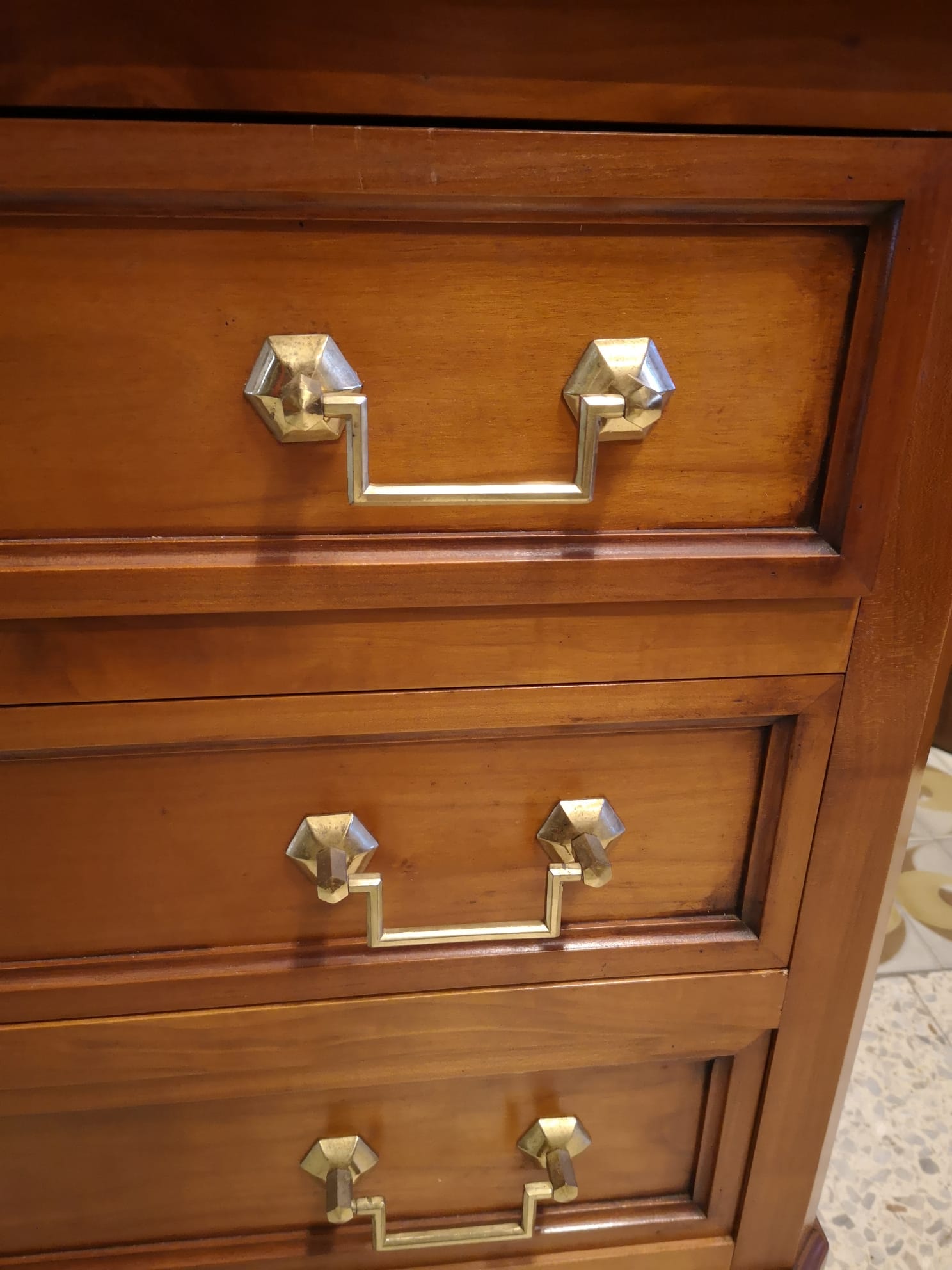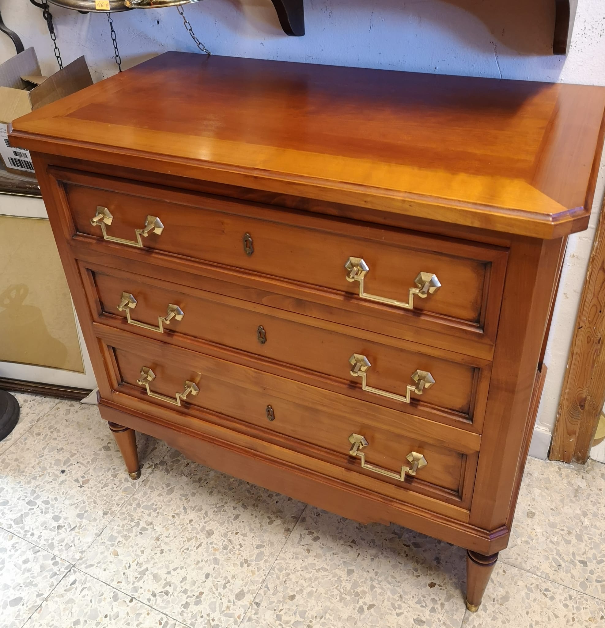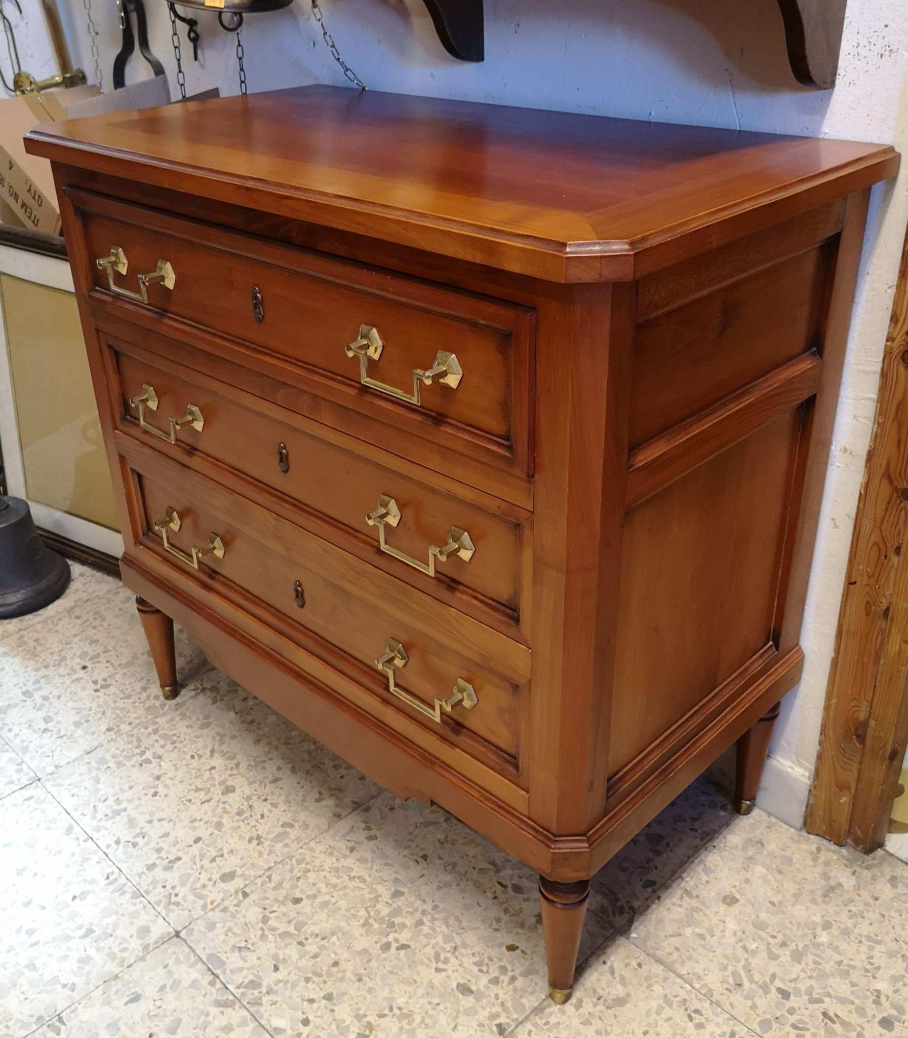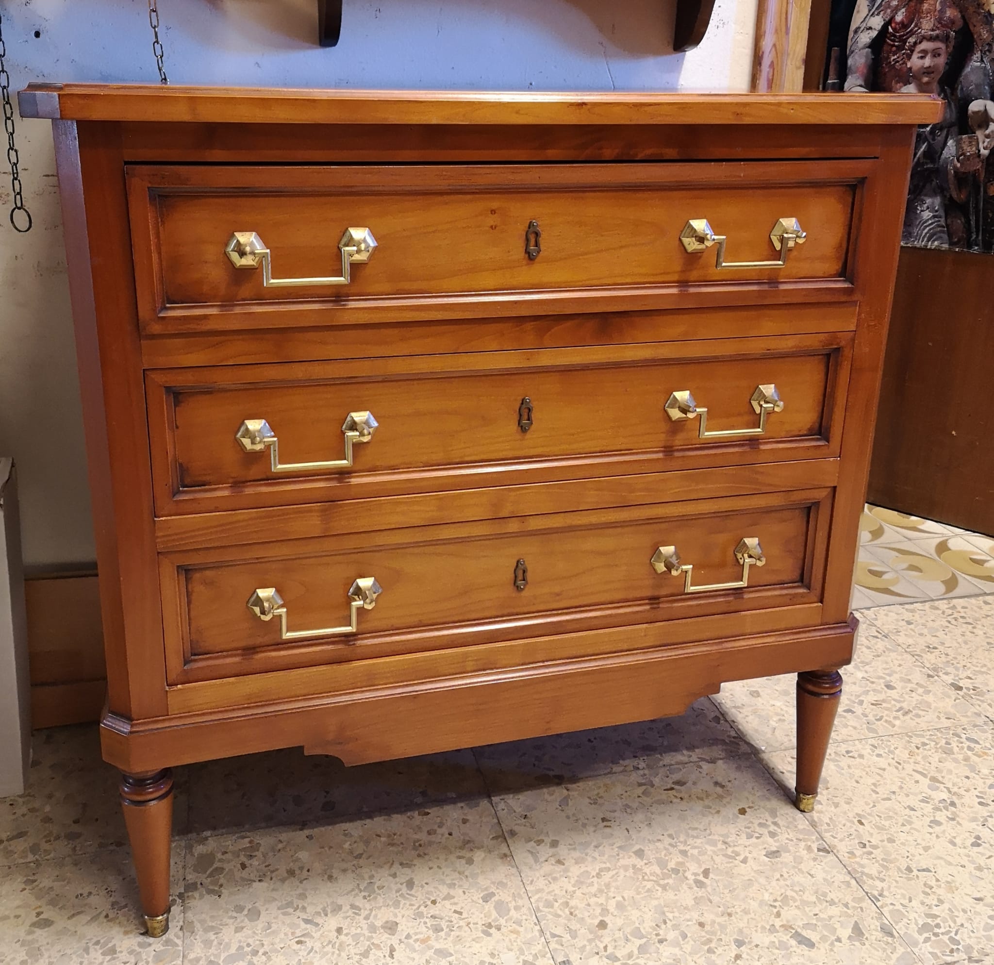 Bonita cómoda de tamaño pequeño de tres cajones y patas tronco cónicas.