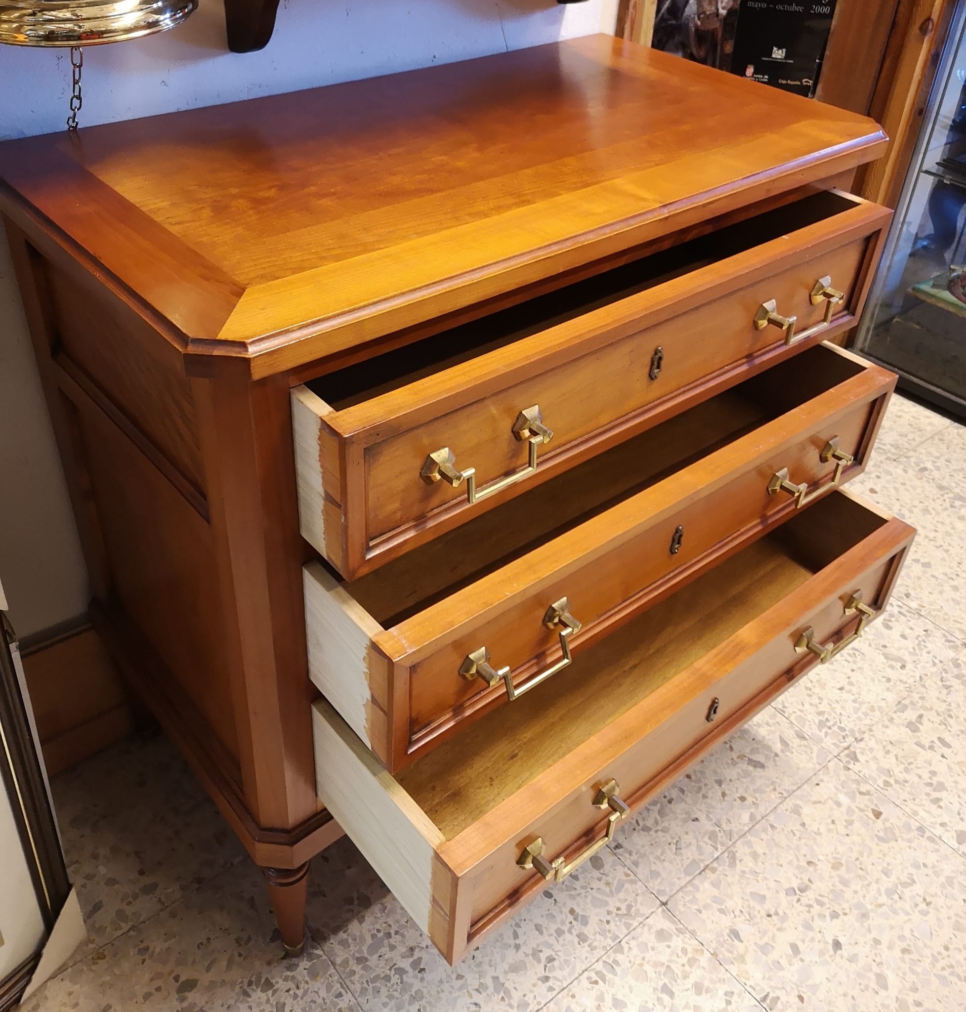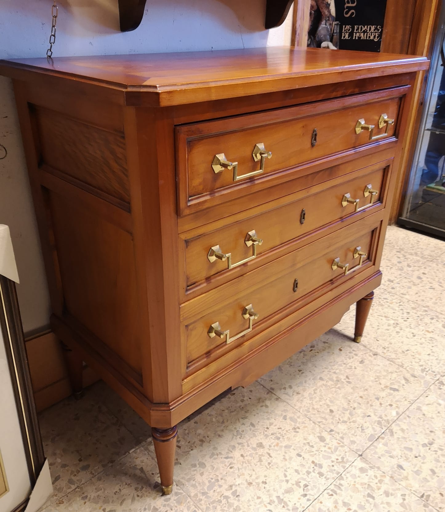 Cómoda de tamaño pequeño de tres cajones y patas tronco cónicas.
