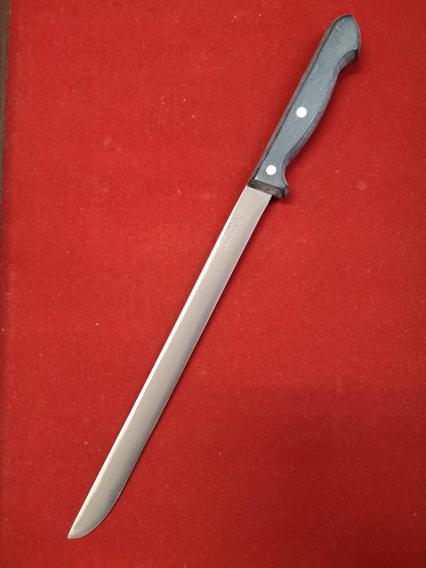 Cuchillo Jamonero artesano de Taramundi, Asturias, realizada manualmente por maestro artesano Martín Lombardia, firmado en su hoja de 25 cm en Acero Inox Mova 420.