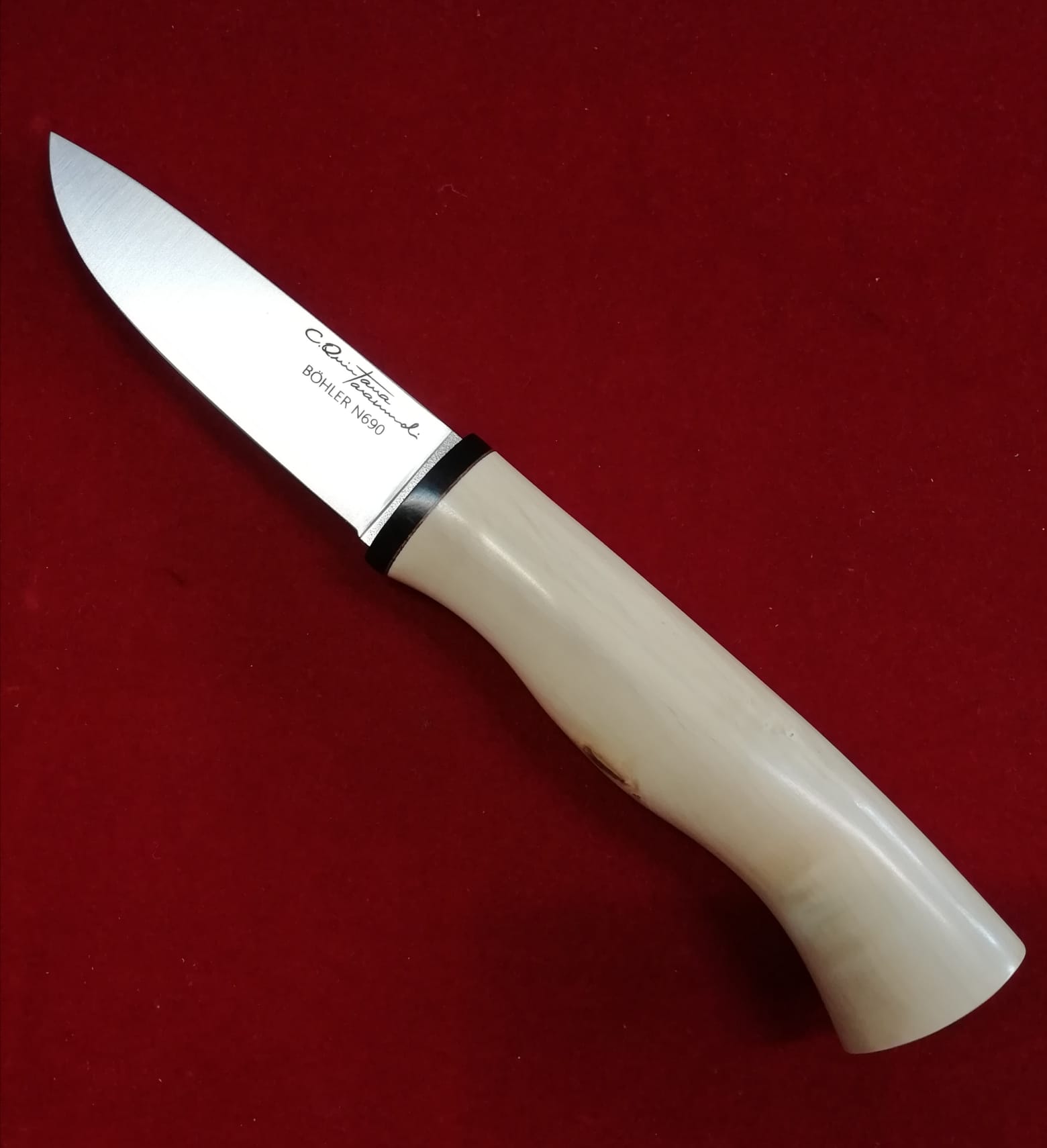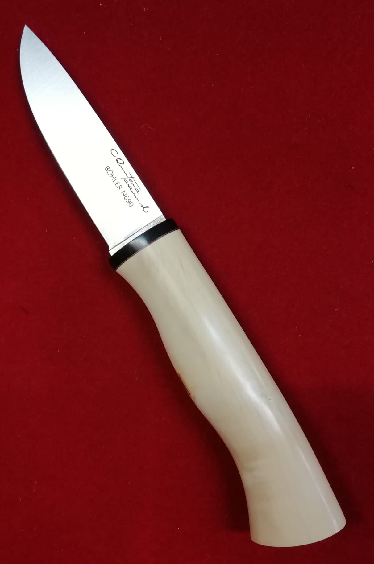 Su hoja está forjada en acero Bohler N695 pulido y tiene una medida de 9 cm.
