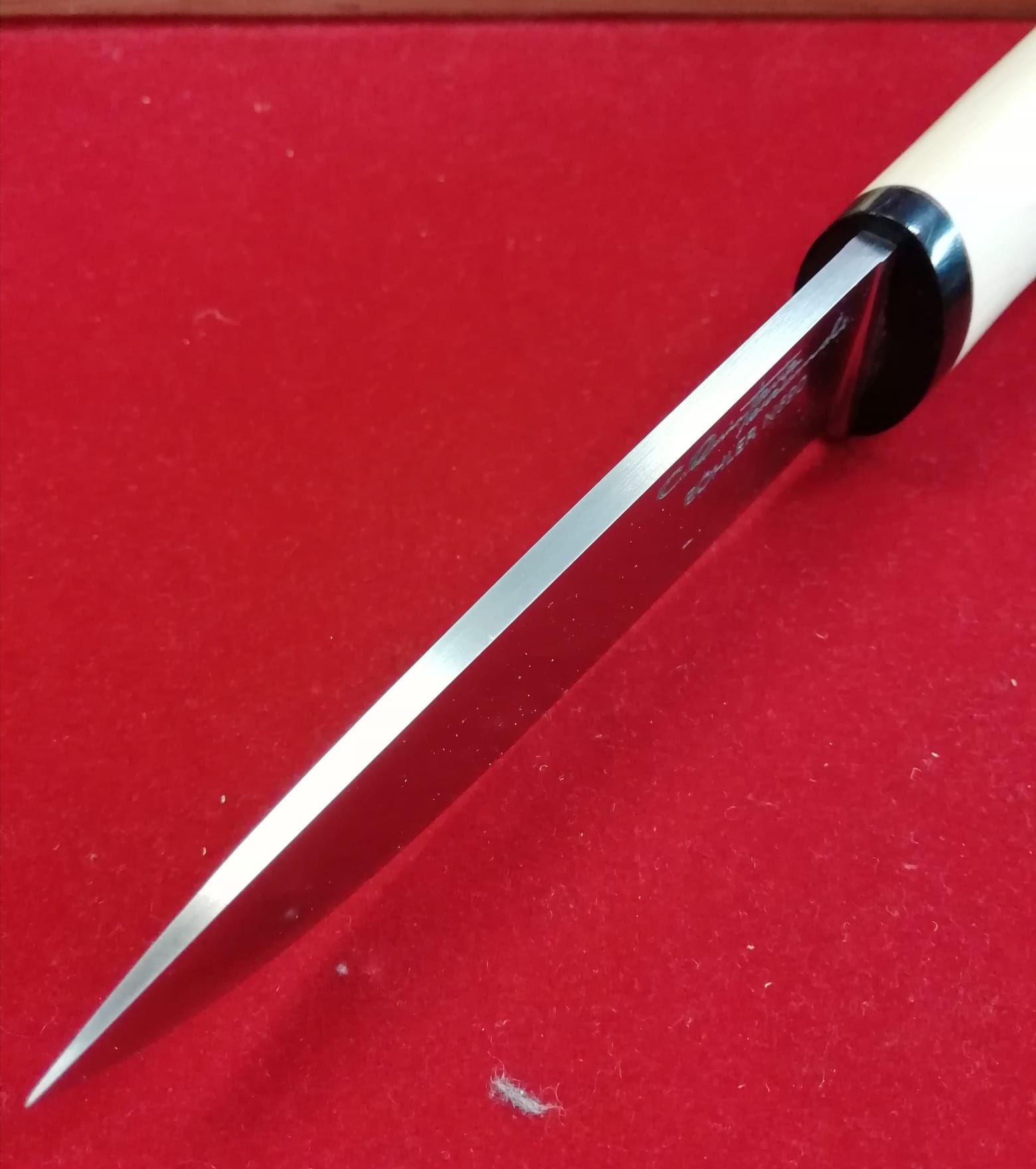 El mango recto está hecho enteramente de madera de boj con guarda de embellecido en madera de Granadillo.