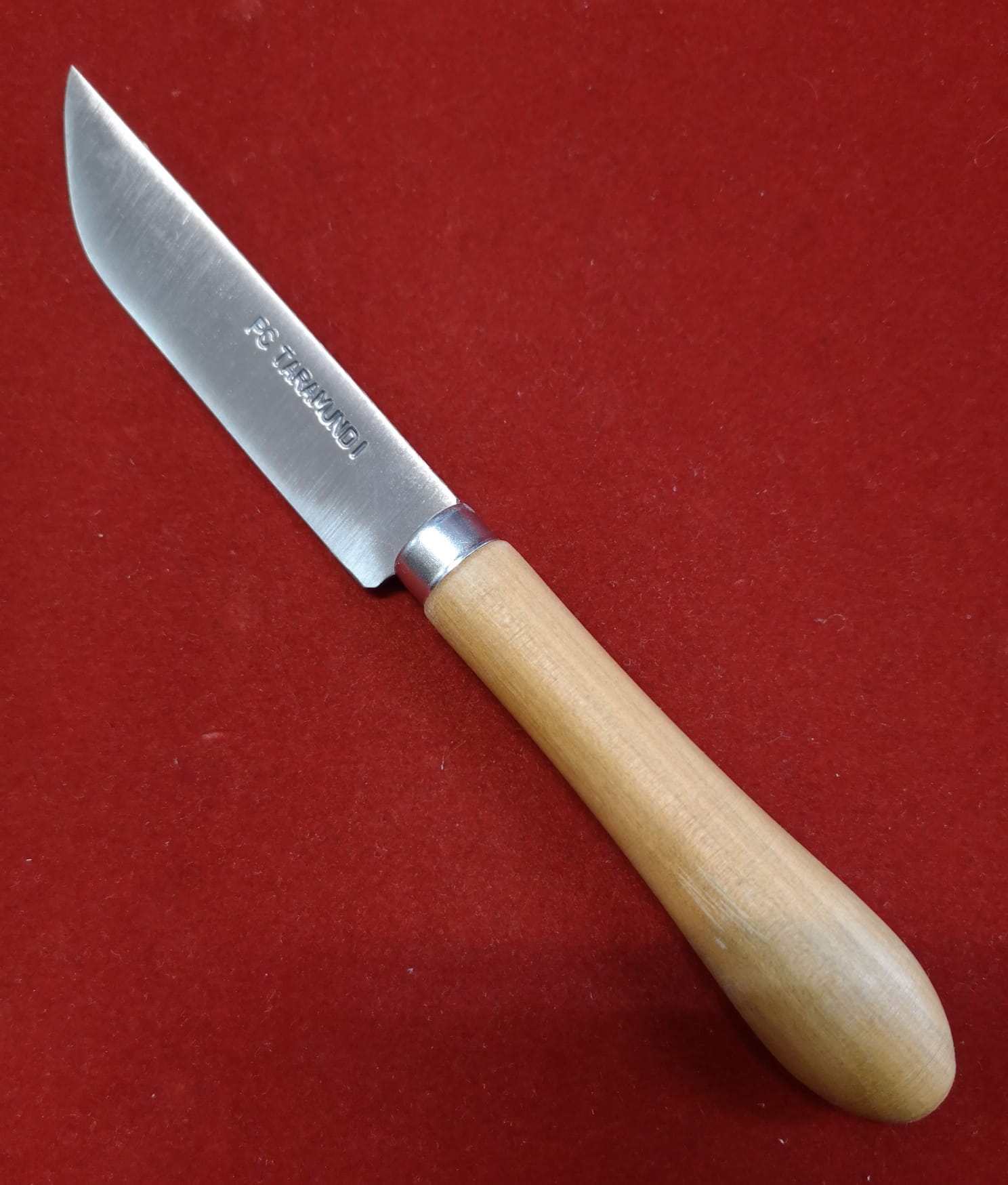 Cuchillo de mesa artesano de Taramundi, Asturias, realizado manualmente por maestro artesano cuchillero Pedro Conde Bermúdez, firmado PC en su hoja de 9,5 cm de punta vuelta.
