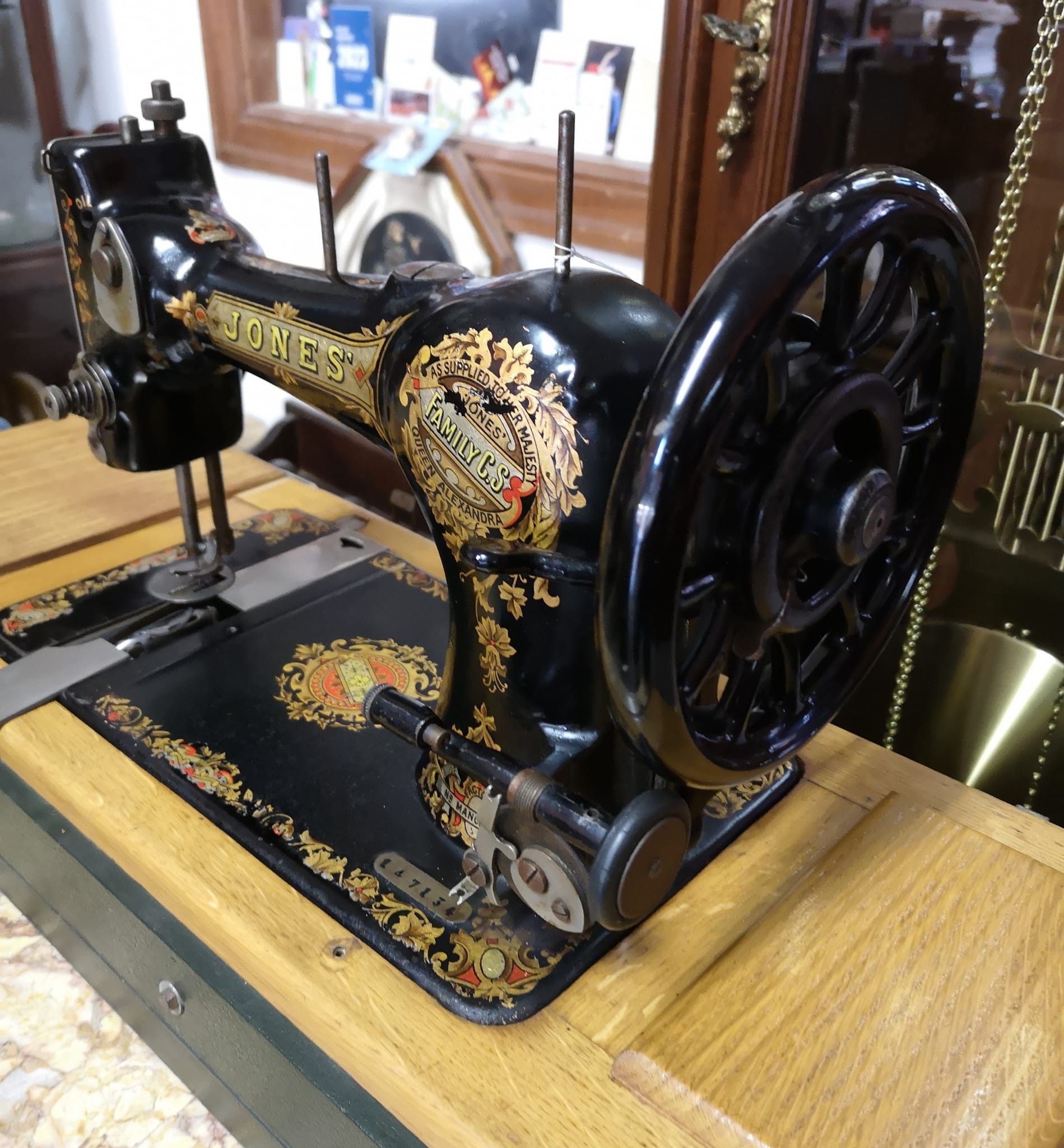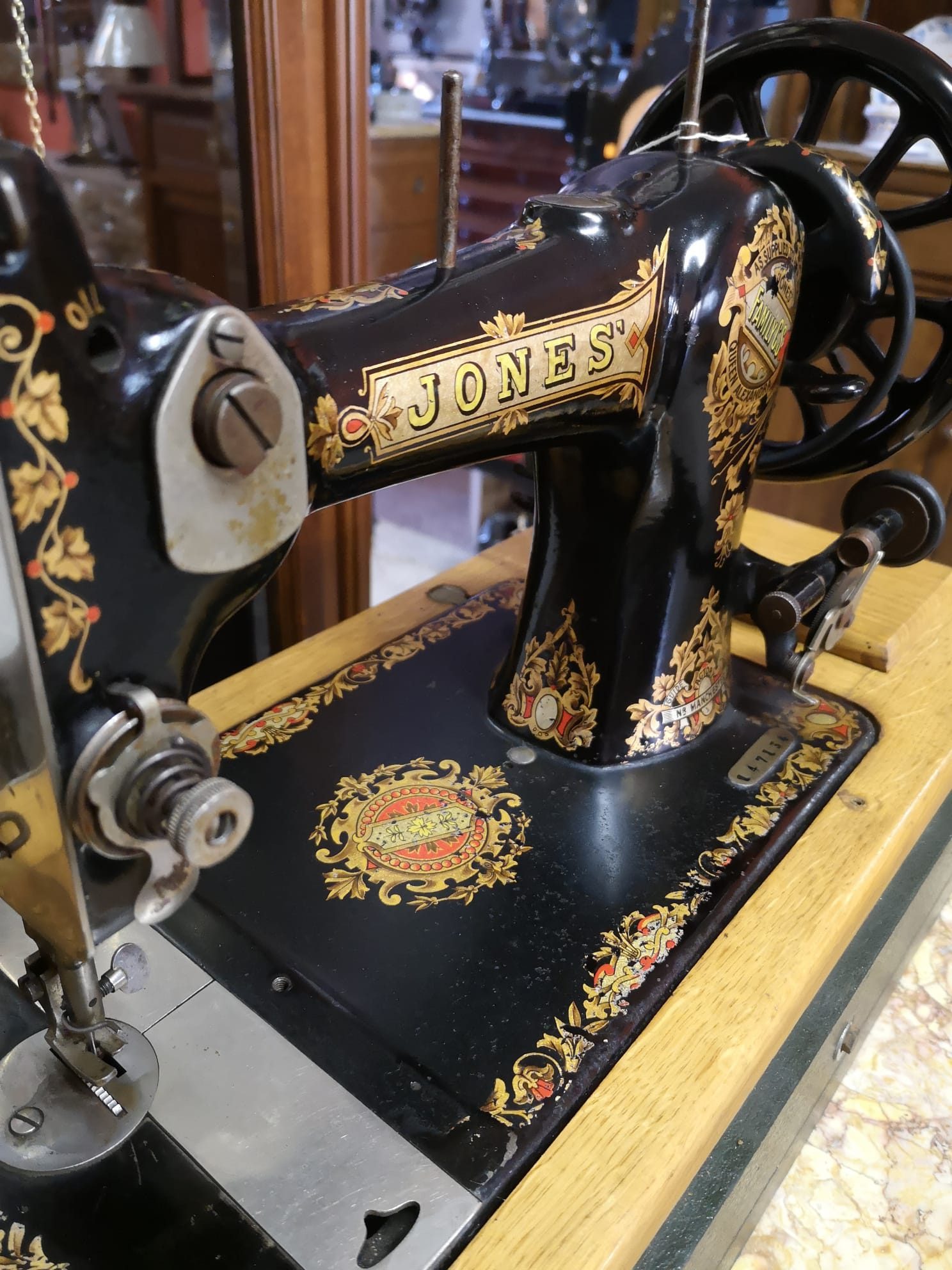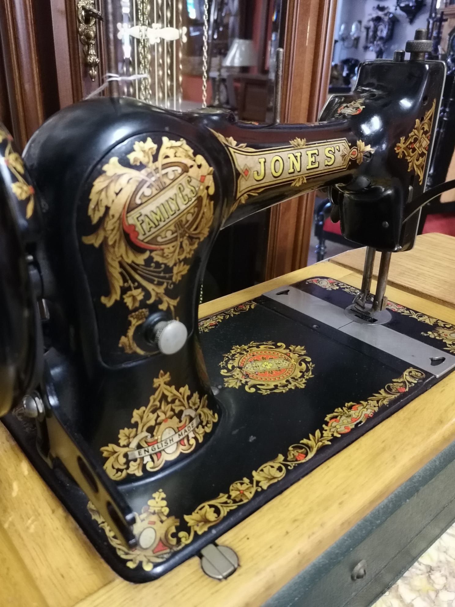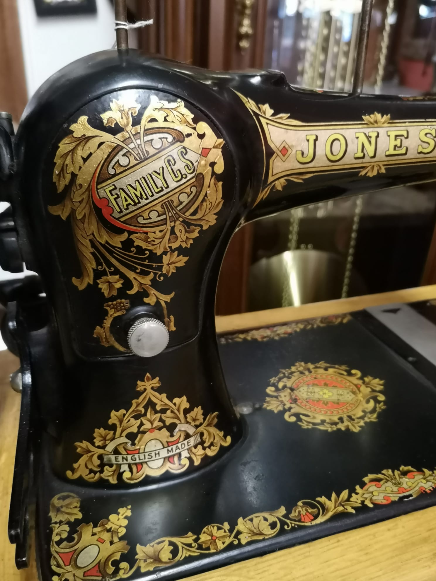 Máquina de coser inglesa Jones, modelo Family., año 1915-20, en excelente estado de conservación, con todos sus dibujos y logotipos en perfecto estado.