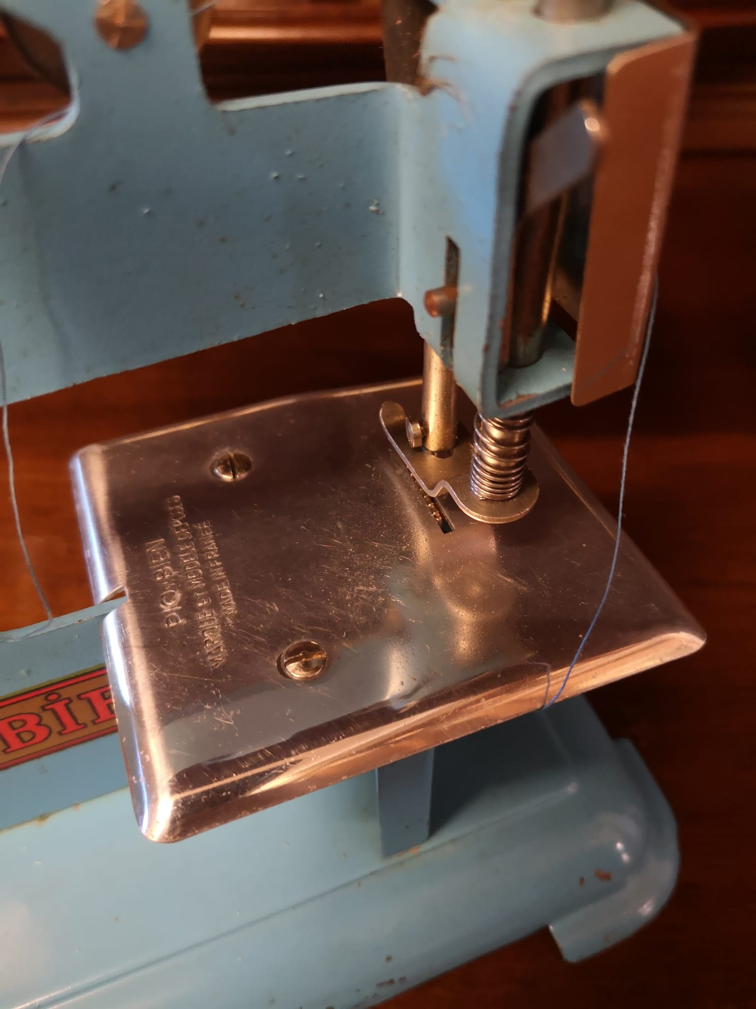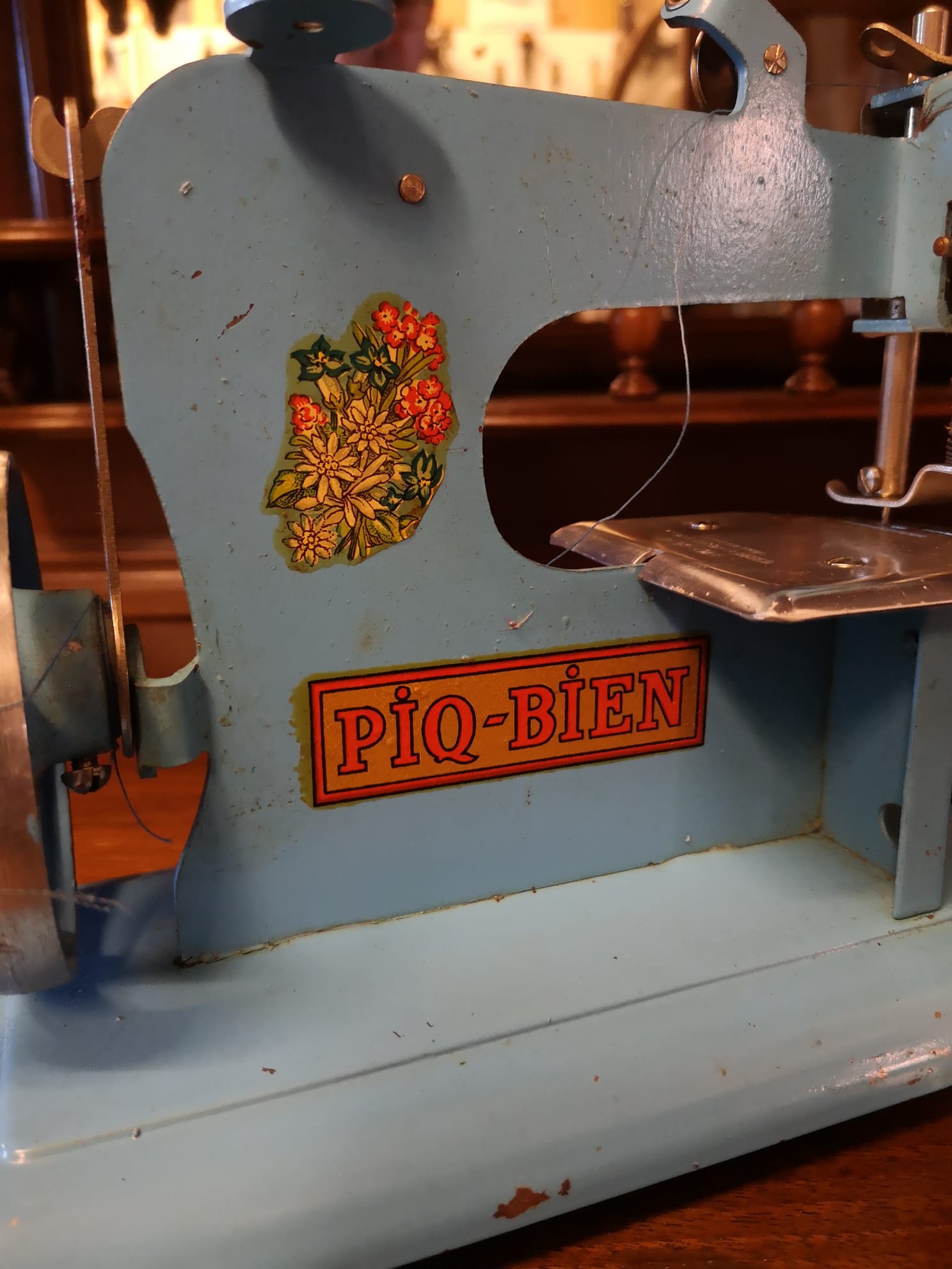 Maquina de coser antigua Piq-bien para niños de fabricación francesa durante la década de 1940.