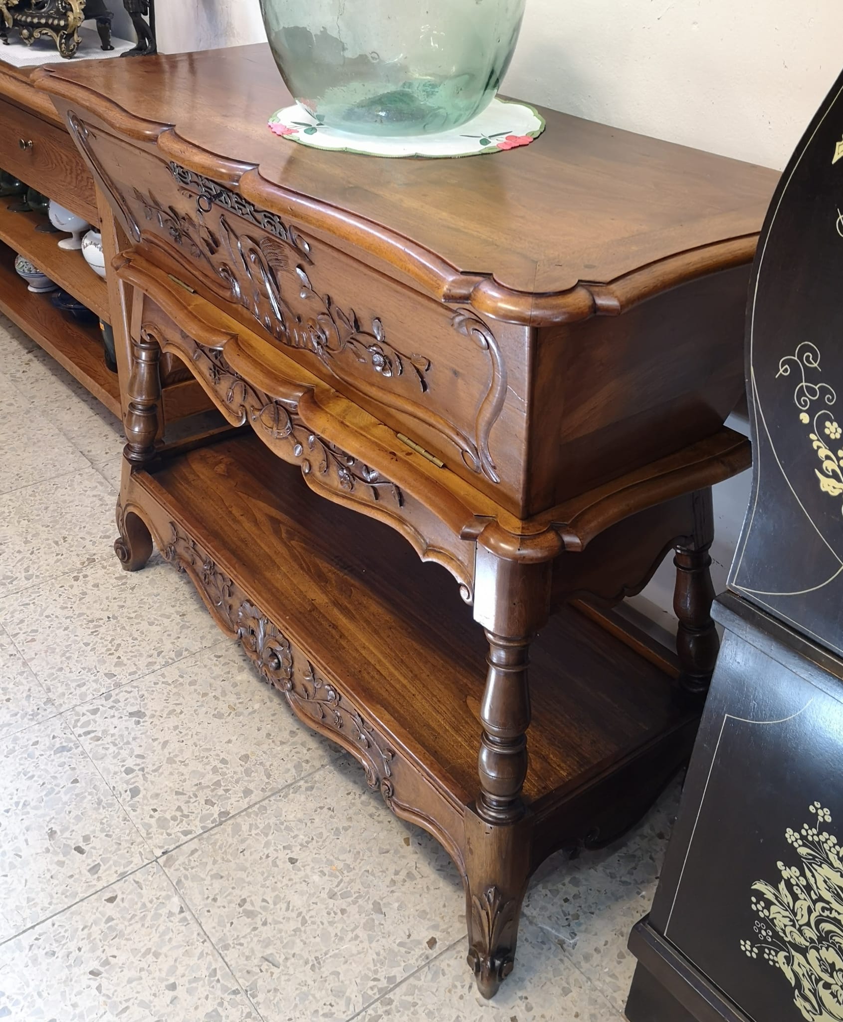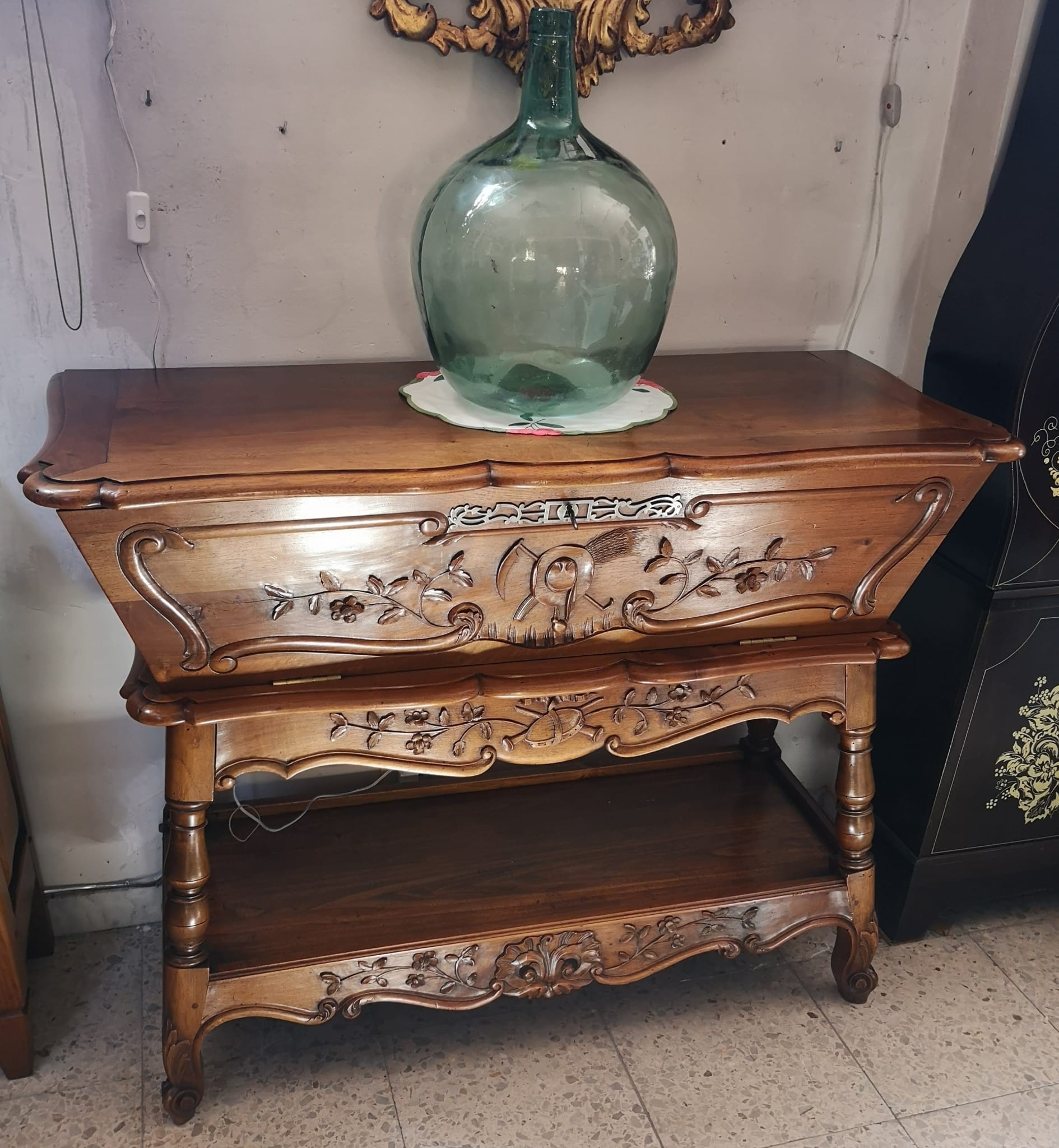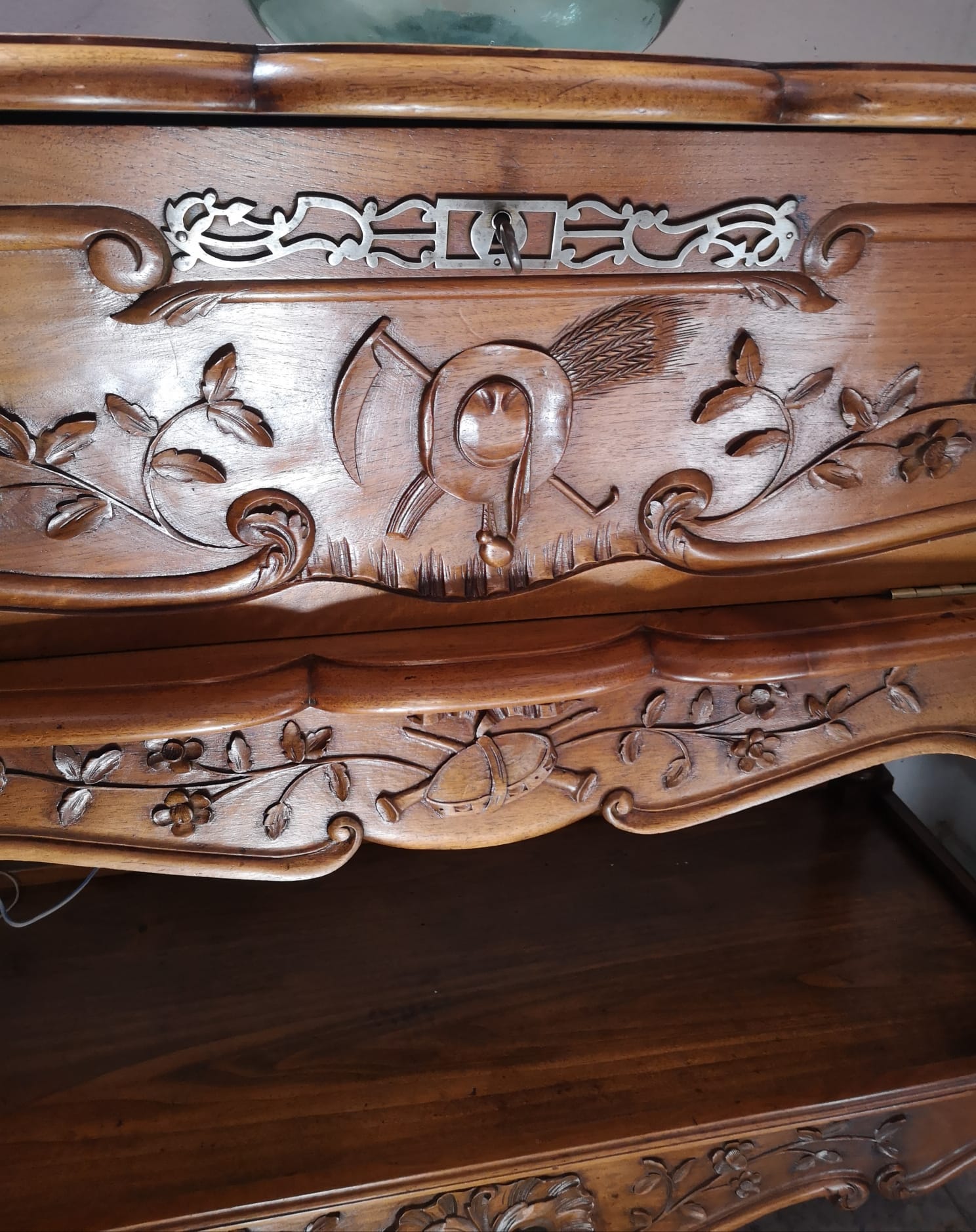 Antigua Masera o panera S XIX en madera de nogal con puerta abatible. Tallados detalles relacionados como el trigo, la guadaña y el sombrero.