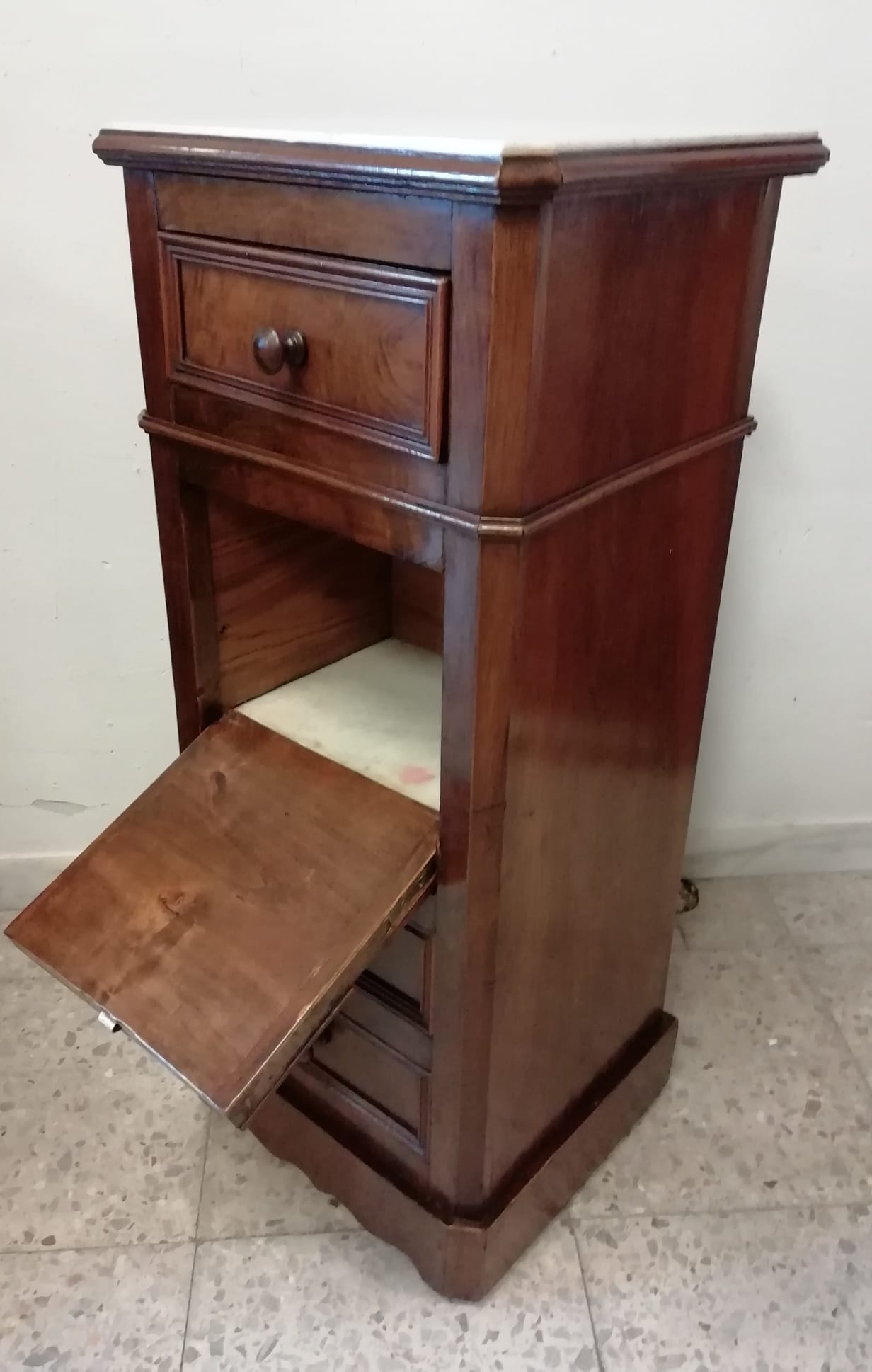 Mesita antigua en madera de palma de Caoba y encimera en mármol blanco.