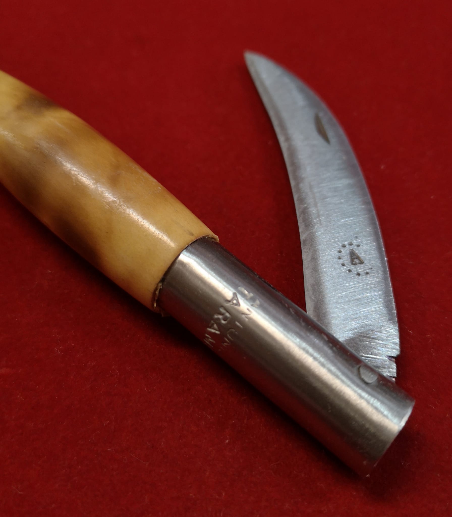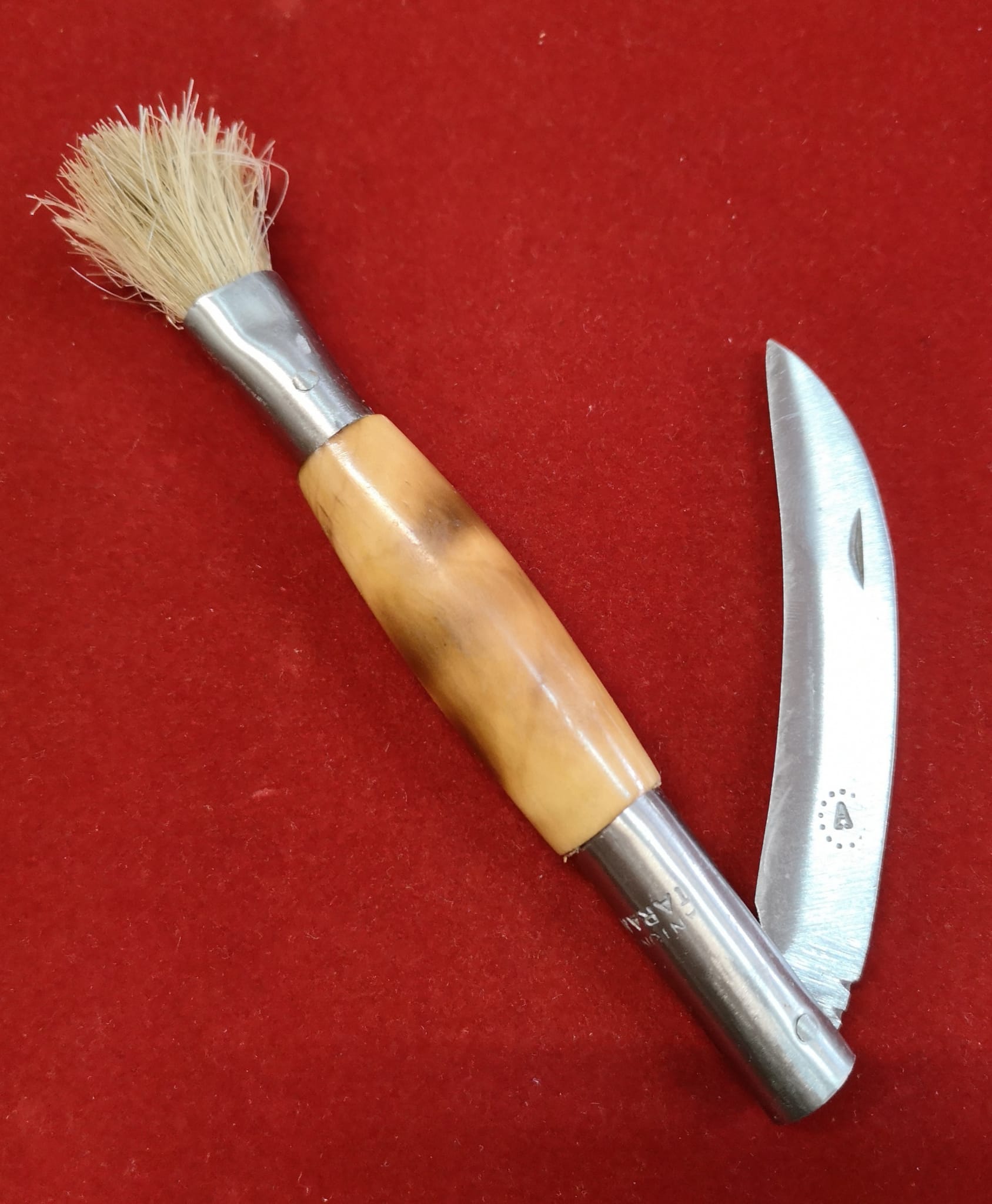 Navaja Artesana de Taramundi, Asturias, realizada manualmente por maestro artesano Antonio Díaz Bermúdez, firmada con una A en su hoja curva especial para SETAS de 8 cm ACERO INOX Mova forjada totalmente a mano.