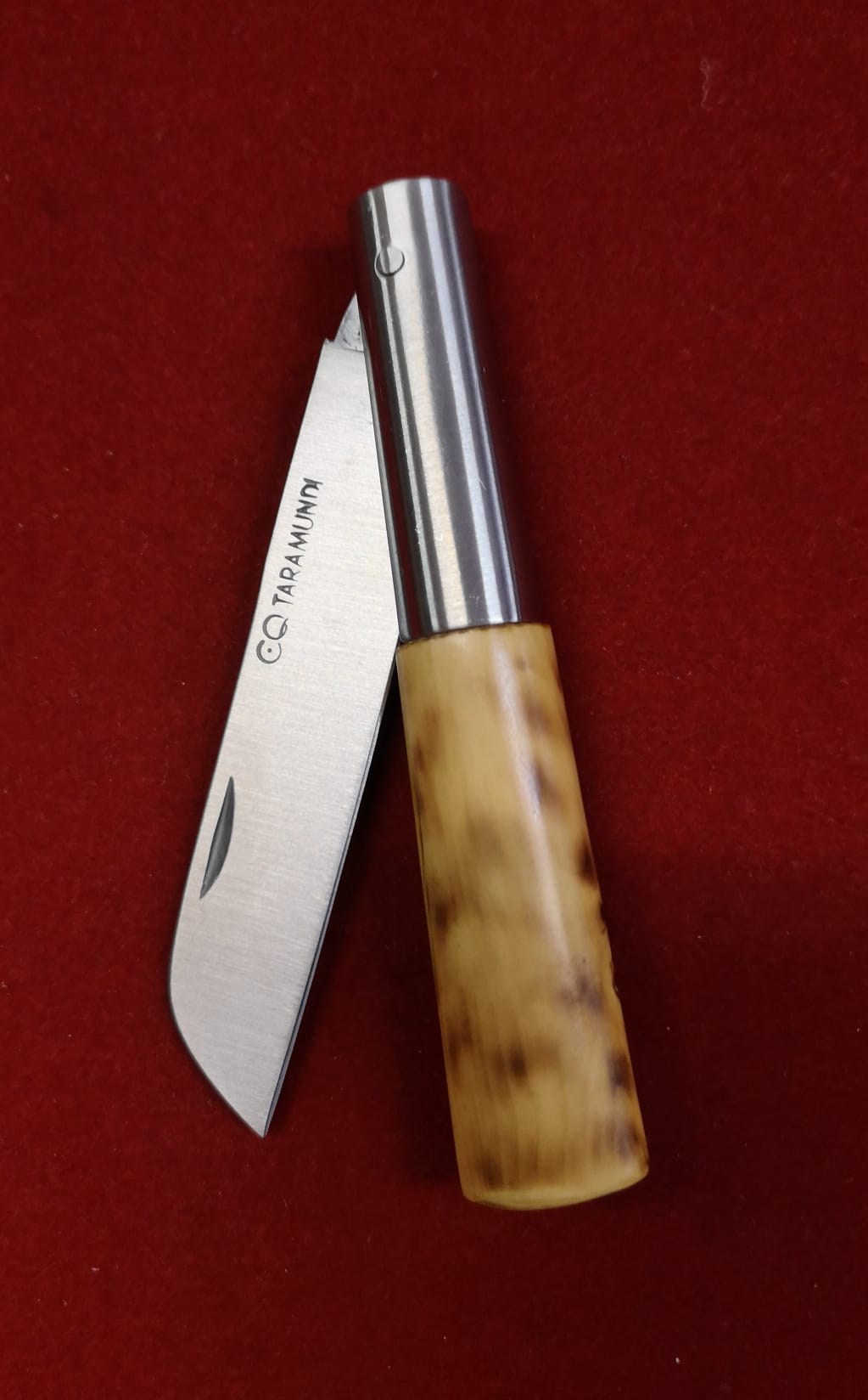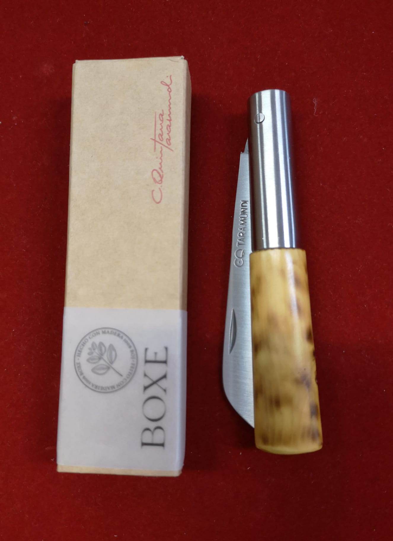 Navaja Artesana de Taramundi, Asturias, realizada manualmente por maestro artesano Carlos Quintana, firmada CQ en su hoja de 8,2 cm en acero Inox ACX390 con sistema de BLOQUEO.