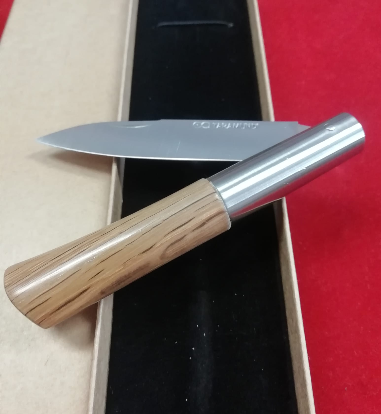 Pertenece a las navajas de categoría PREMIUM, gama alta, realizada en madera de ROBLE y hoja en exclusivo acero INOX Sandvid 14C18N con sistema de BLOQUEO.