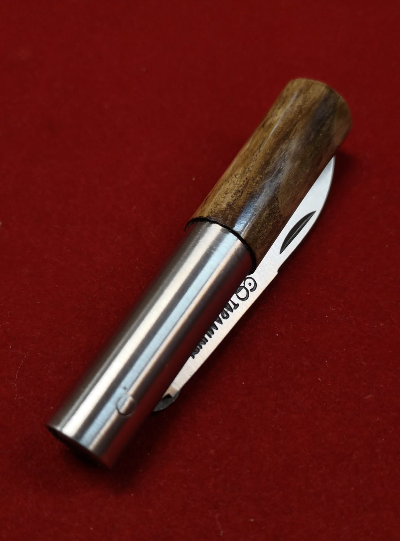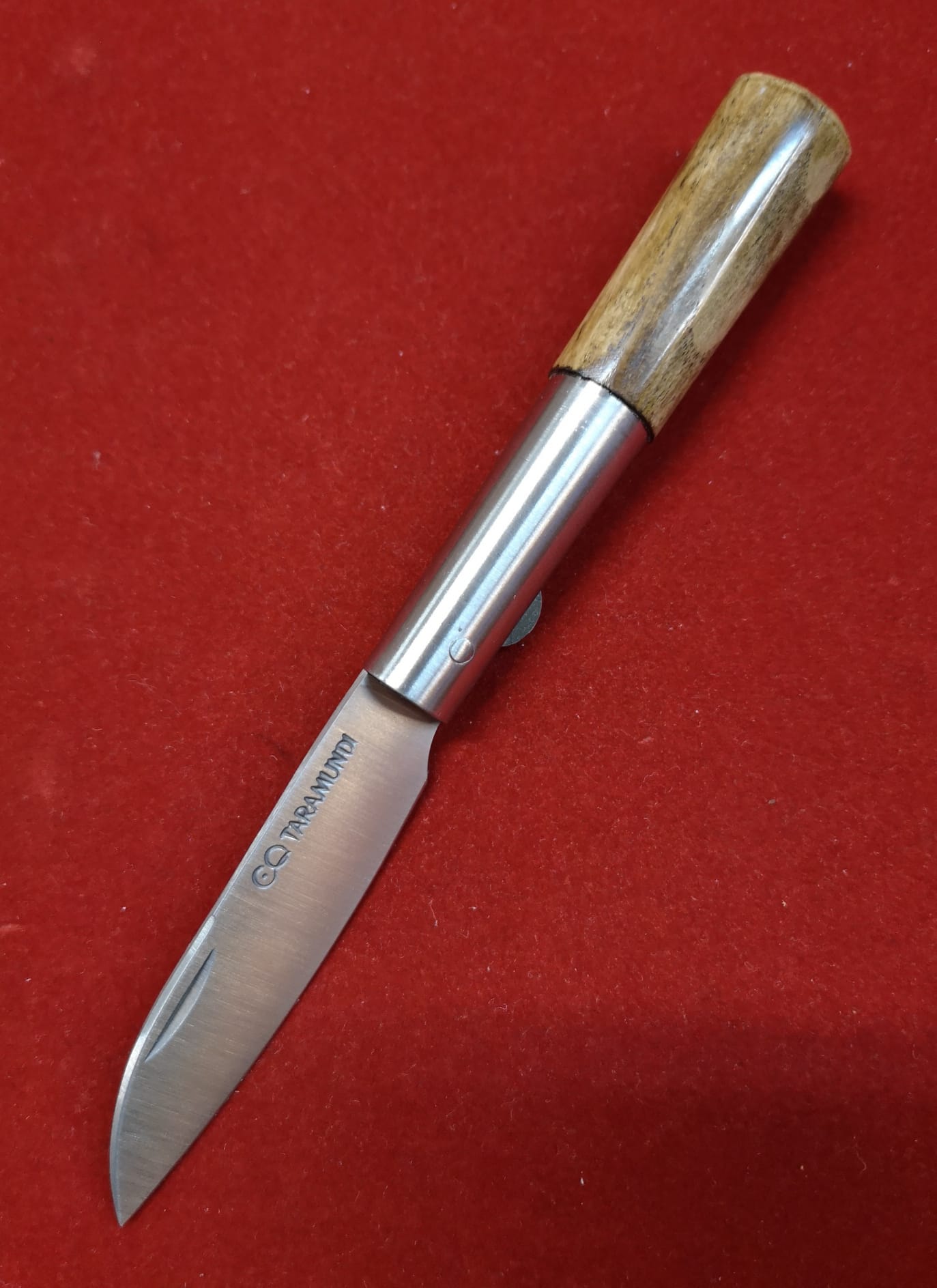 Hoja en ACERO INOX ACX390, comúnmente conocido como acero quirúrgico, con sistema de BLOQUEO.
