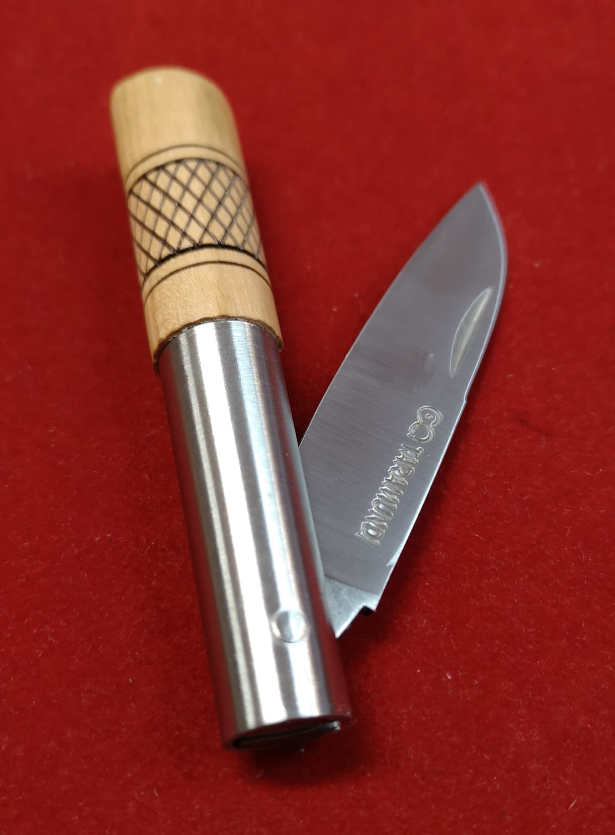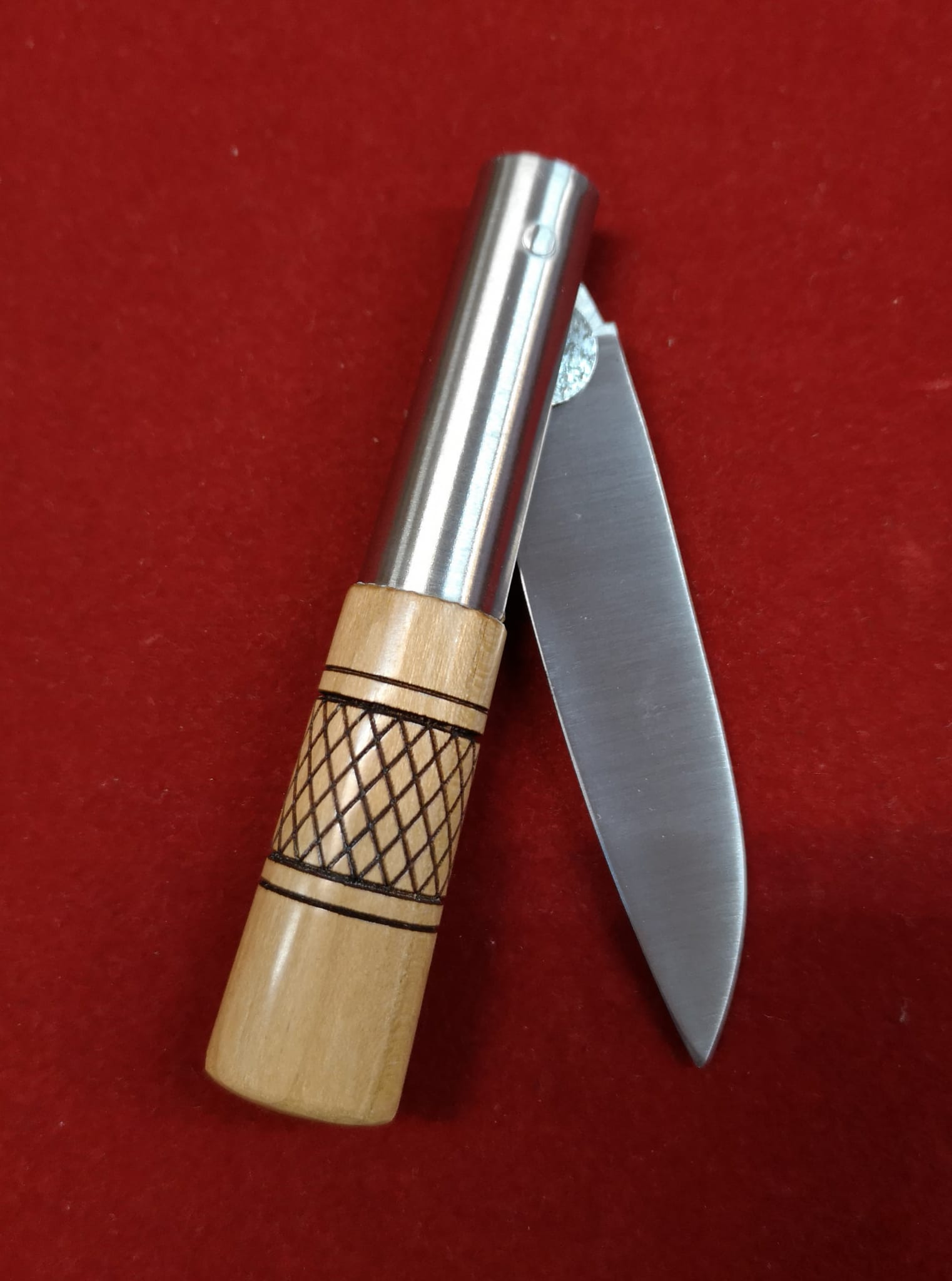 Mango en madera de CEREZO con decoración tradicional de CRUZADILLO y hoja en ACERO INOX ACX390 con sistema de BLOQUEO, comúnmente conocido como acero quirúrgico.