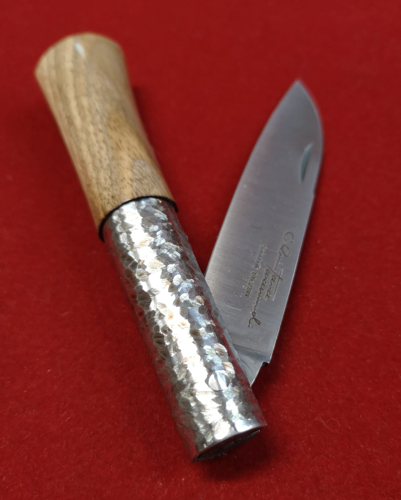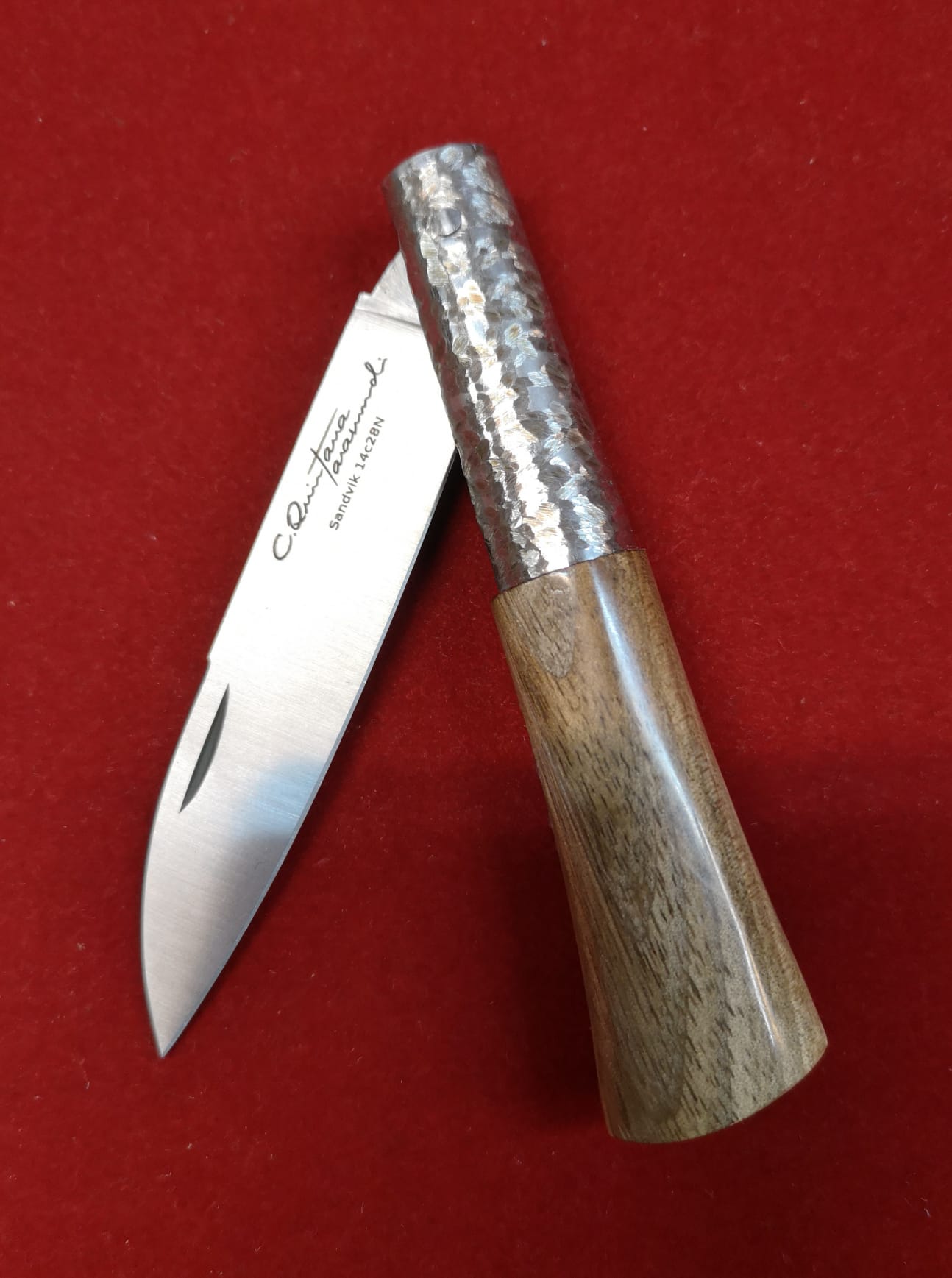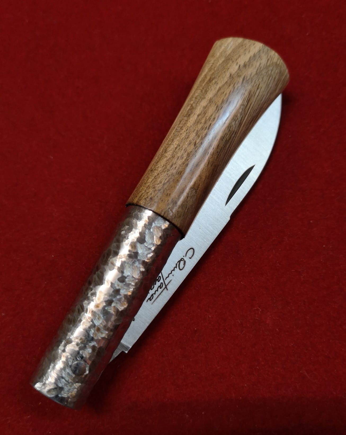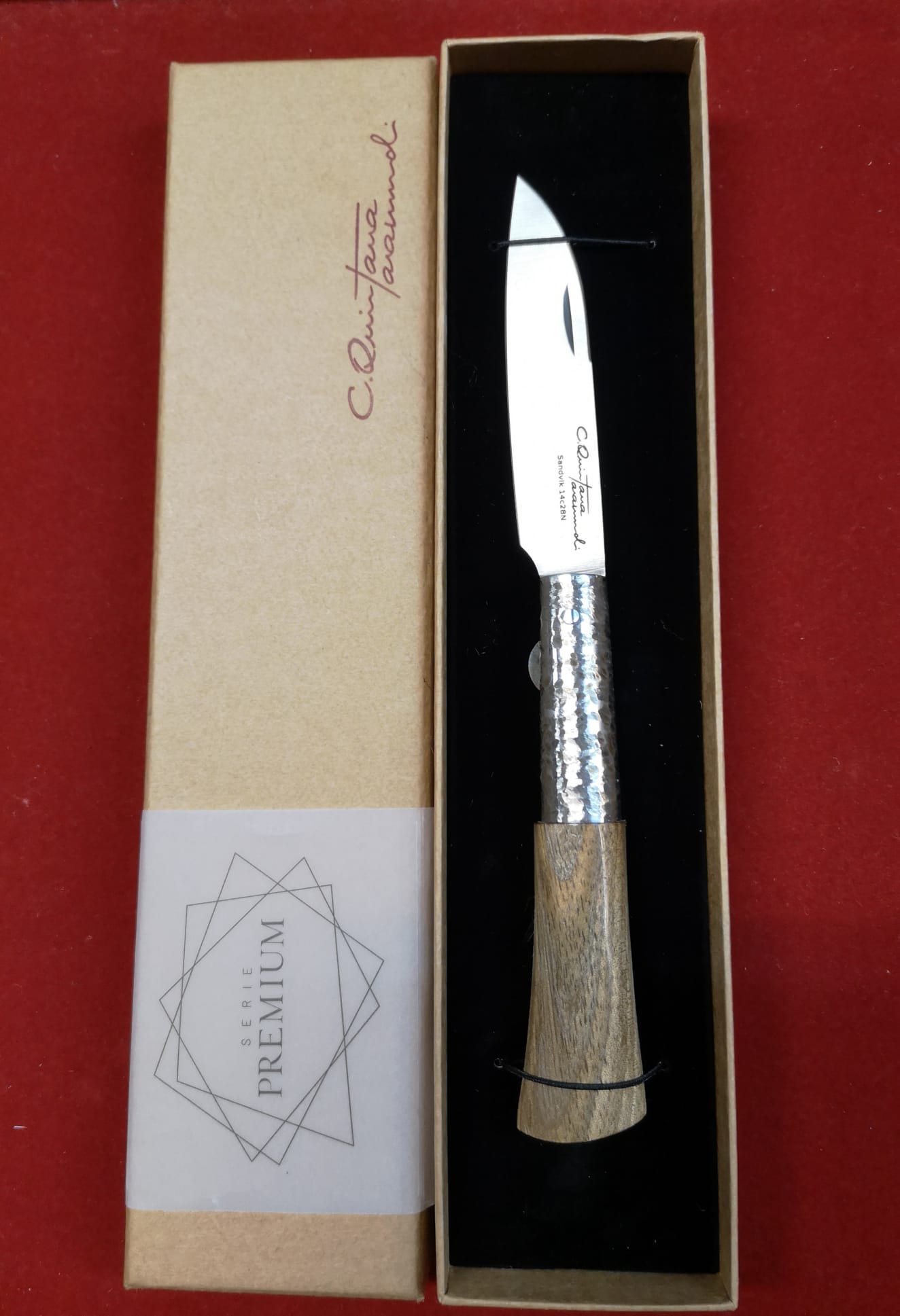 Pertenece a las navajas de categoría PREMIUM, gama alta, realizada en madera noble de NOGAL, virola acero Inox TEXTURIZADA y exclusiva hoja en ACERO INOX 14C28N con sistema de BLOQUEO.