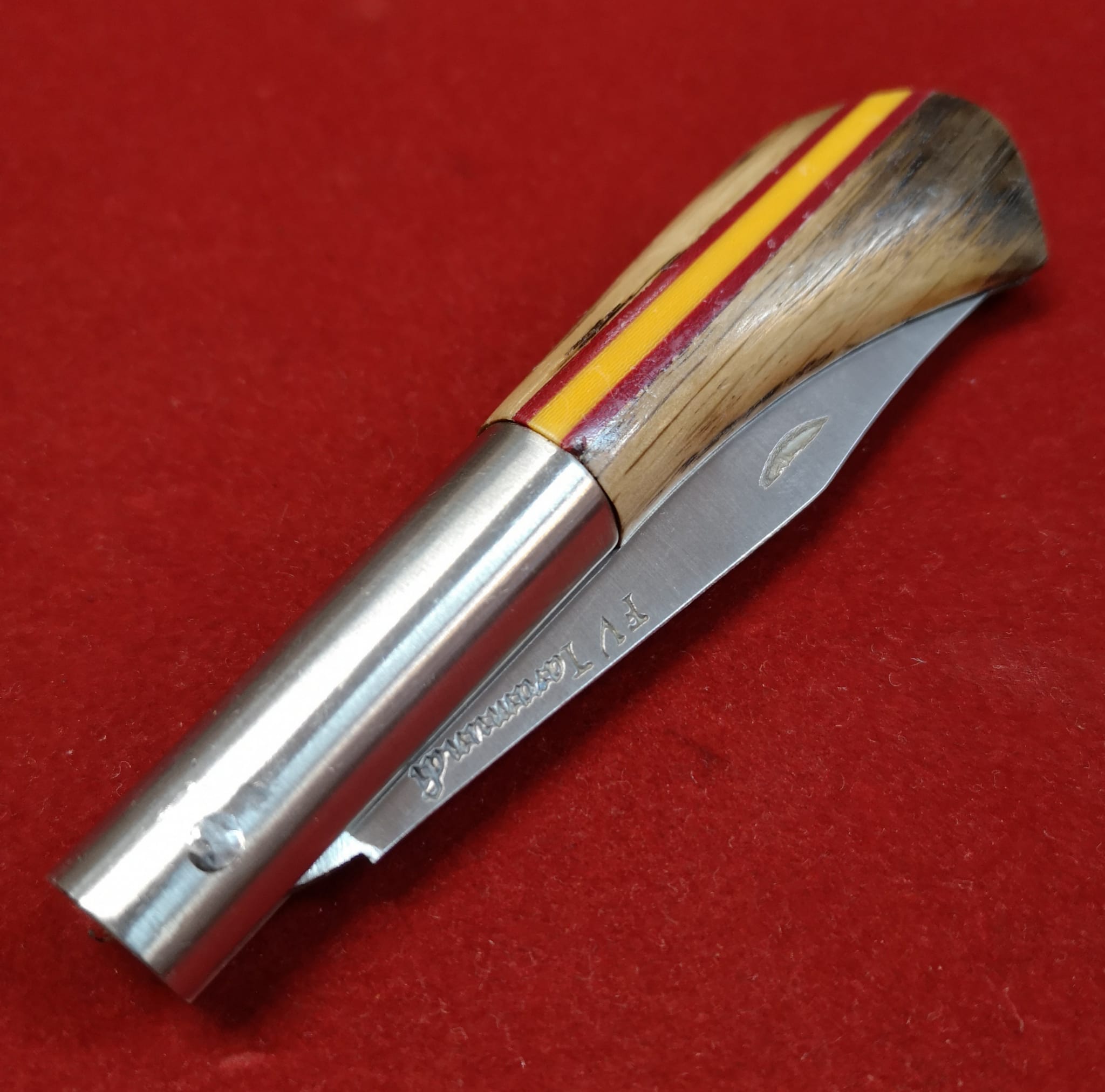 Navaja Artesana de Taramundi, Asturias, realizada manualmente por maestro artesano Francisco Vega, firmada FV en su hoja de 8 cm de punta vuelta.