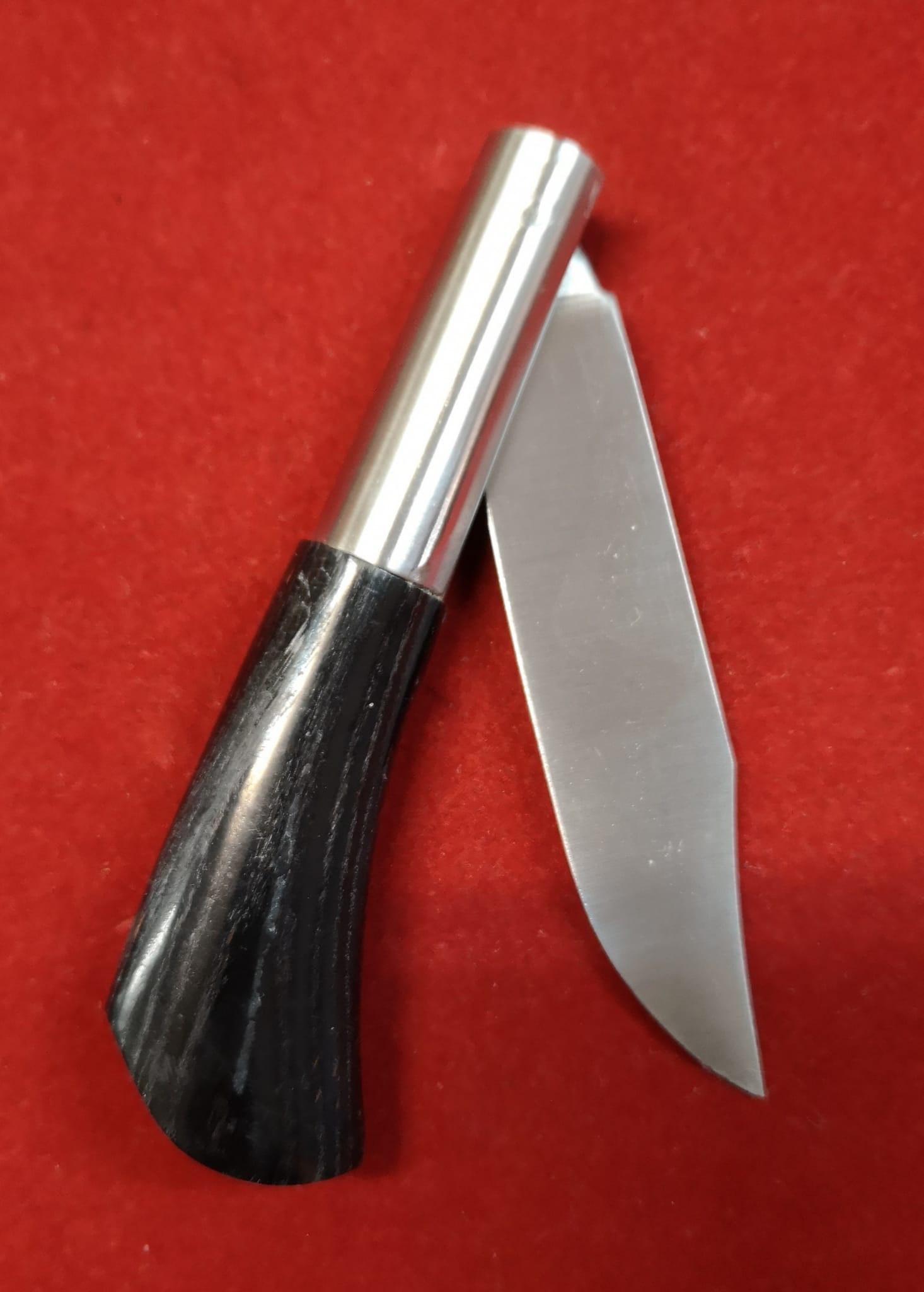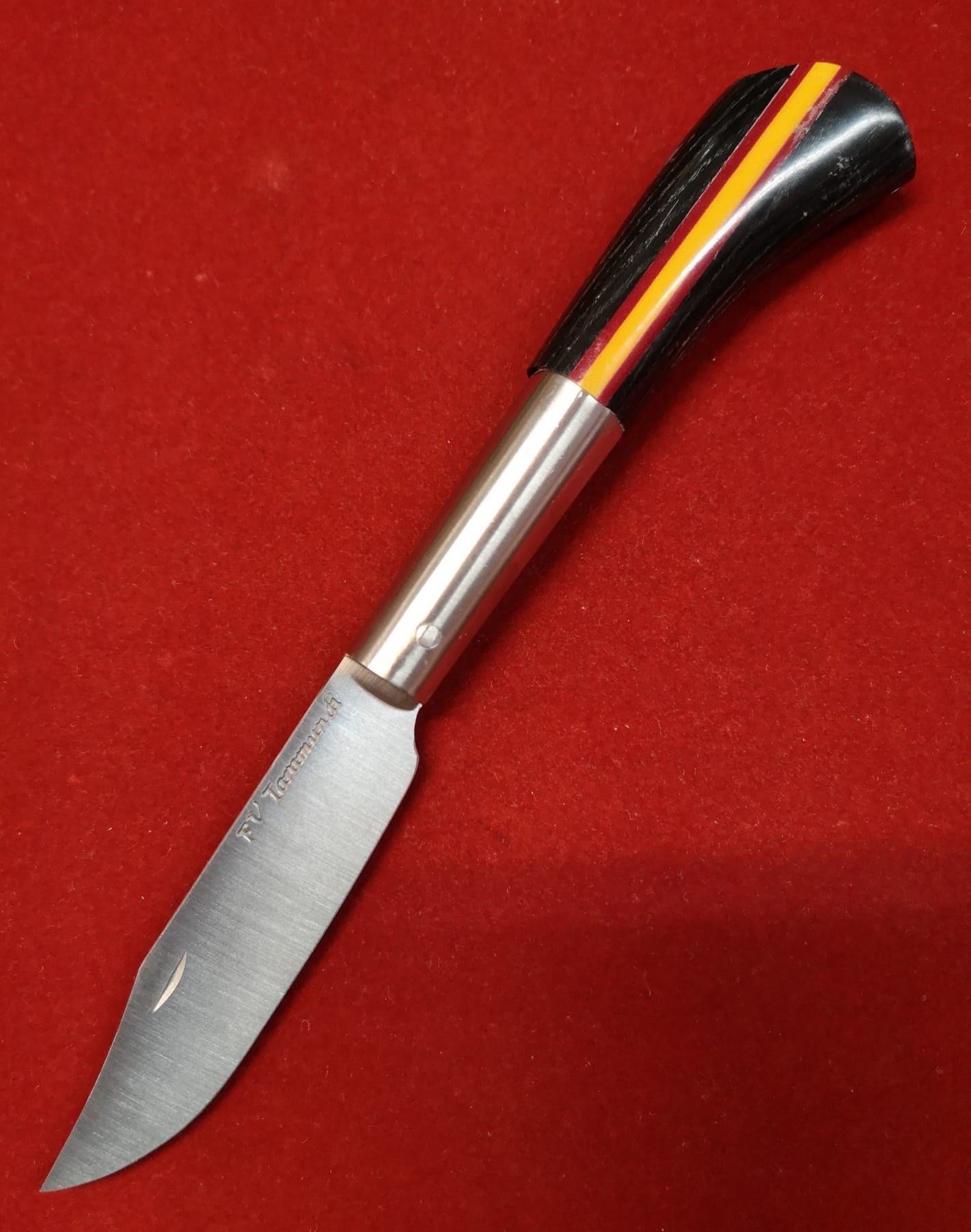 Navaja Artesana de Taramundi, Asturias, realizada manualmente por maestro artesano Francisco Vega, firmada FV en su hoja de 8 cm de punta vuelta.