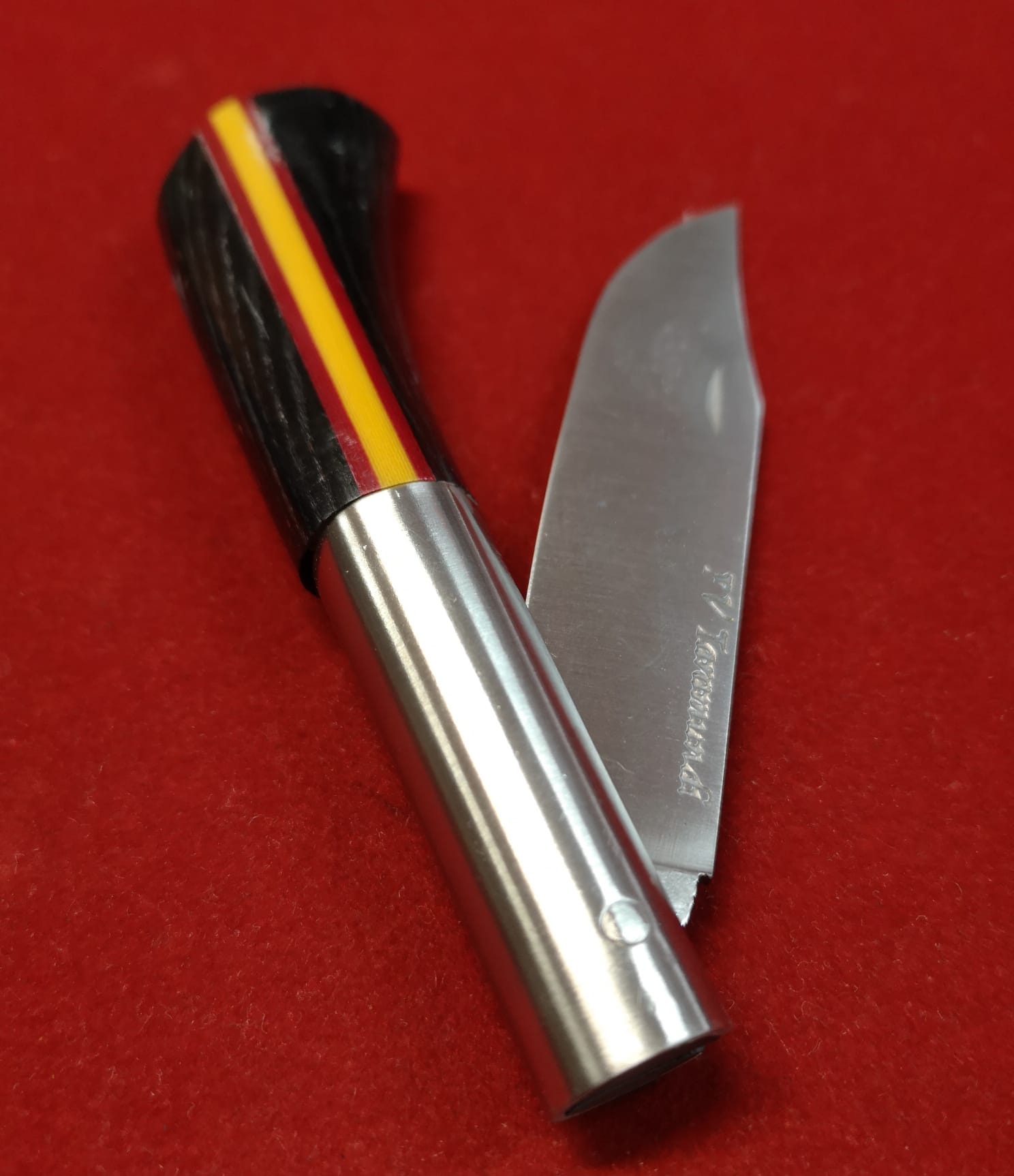 Mango en micarta negra con incrustacion de bandera de España.