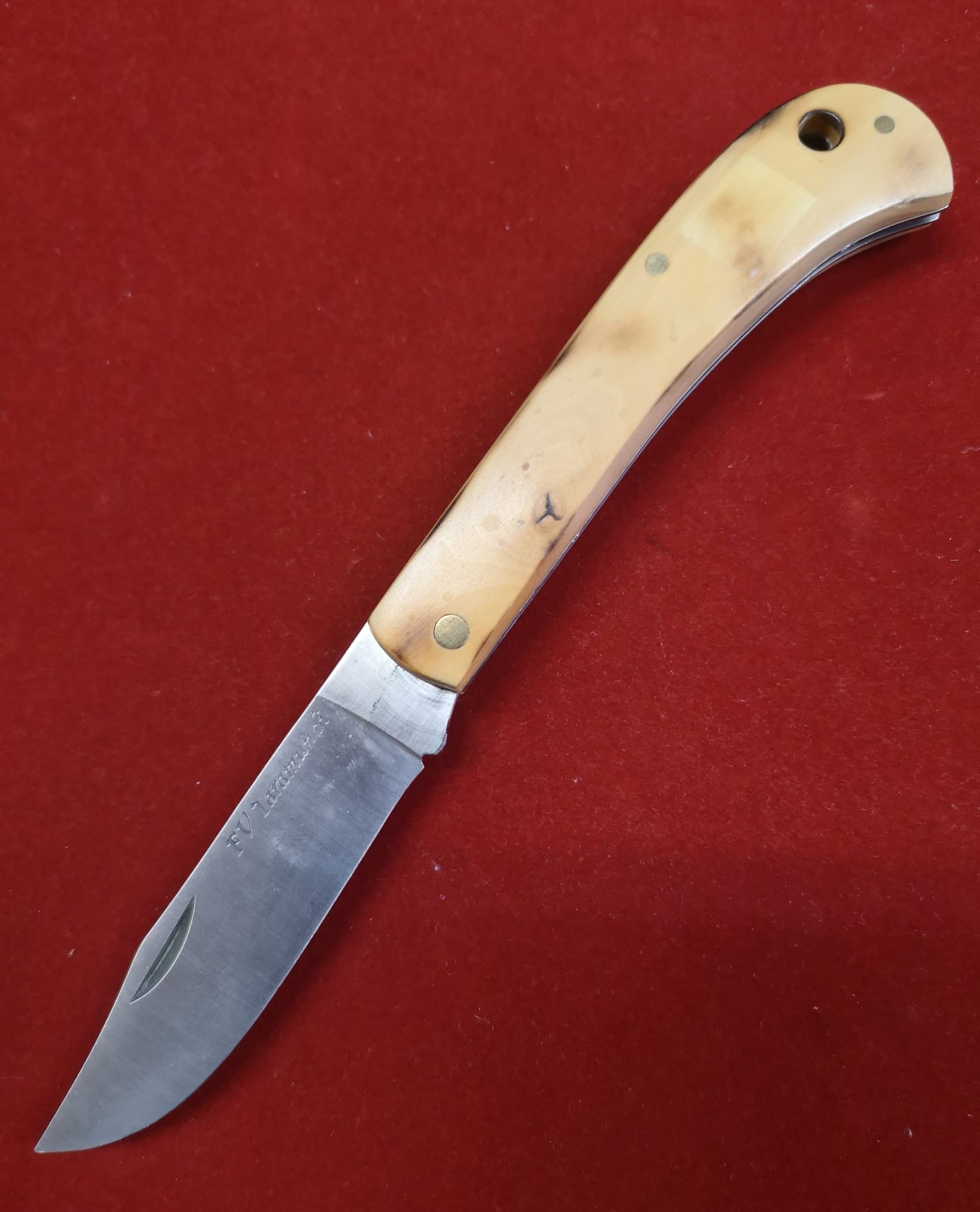 Navaja Artesana de Taramundi, Asturias, realizada manualmente por maestro artesano Carlos Francisco Vega, firmada FV en su hoja de 8 cm de punta vuelta.