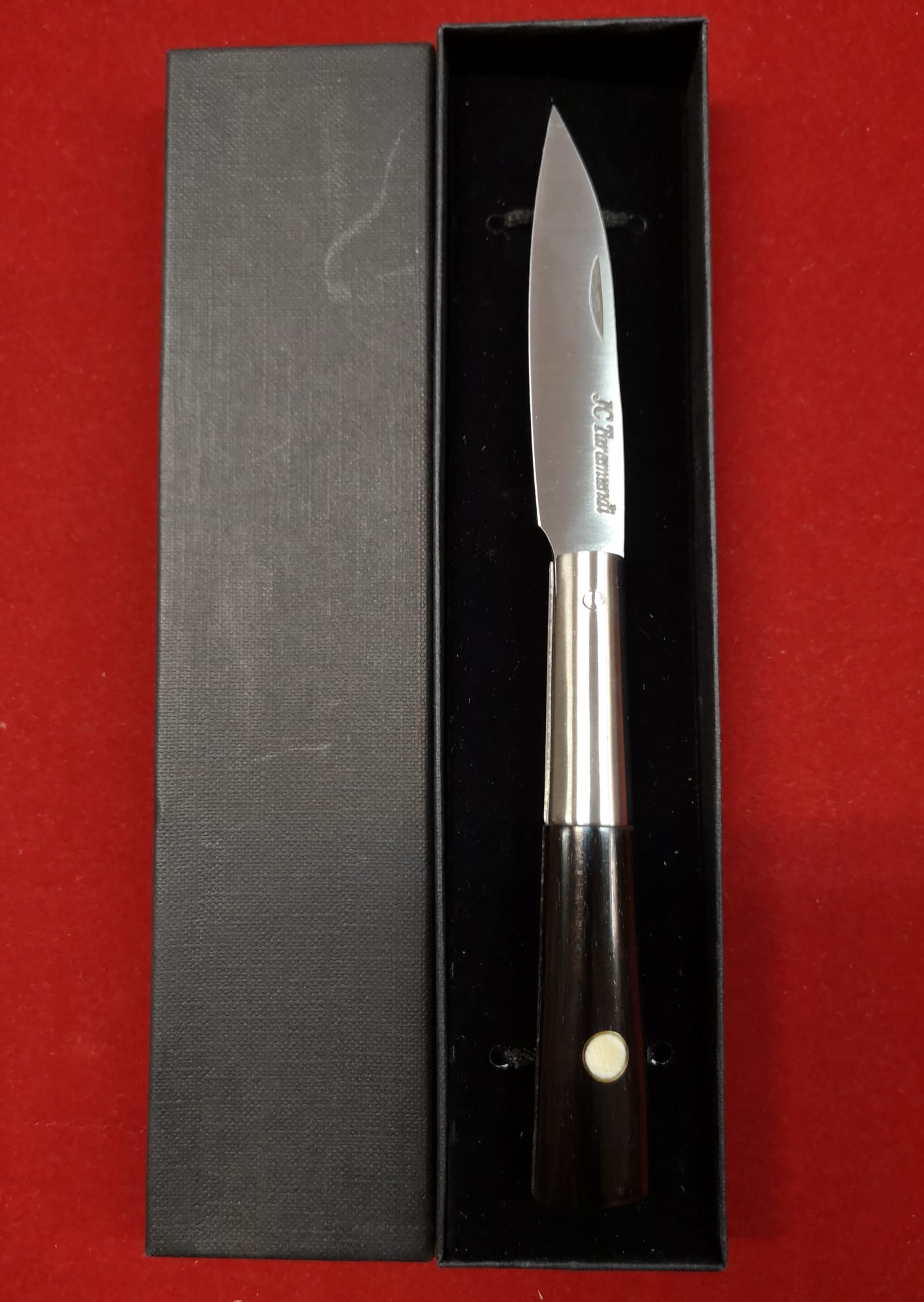 Pertenece a las navajas de categoría PREMIUM, gama alta, realizada en madera noble de GRANADILLO con incrustación de punto en hueso blanco en carillo de latón por ambos lados.
