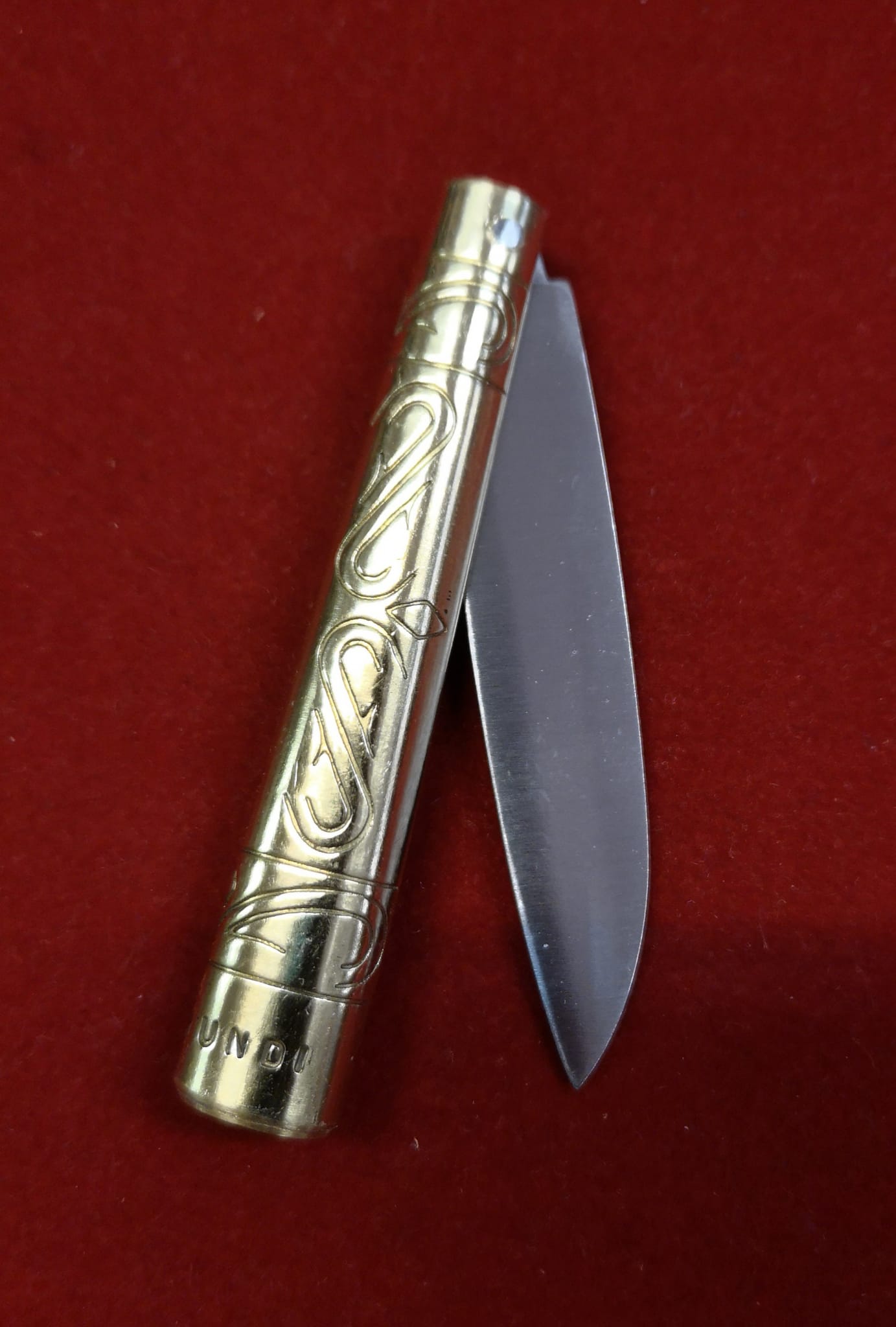 Navaja Latón grabado M. Lombardía. Navaja Artesana de Taramundi, Asturias, realizada manualmente por maestro artesano M. Lombardía firmada en su hoja.