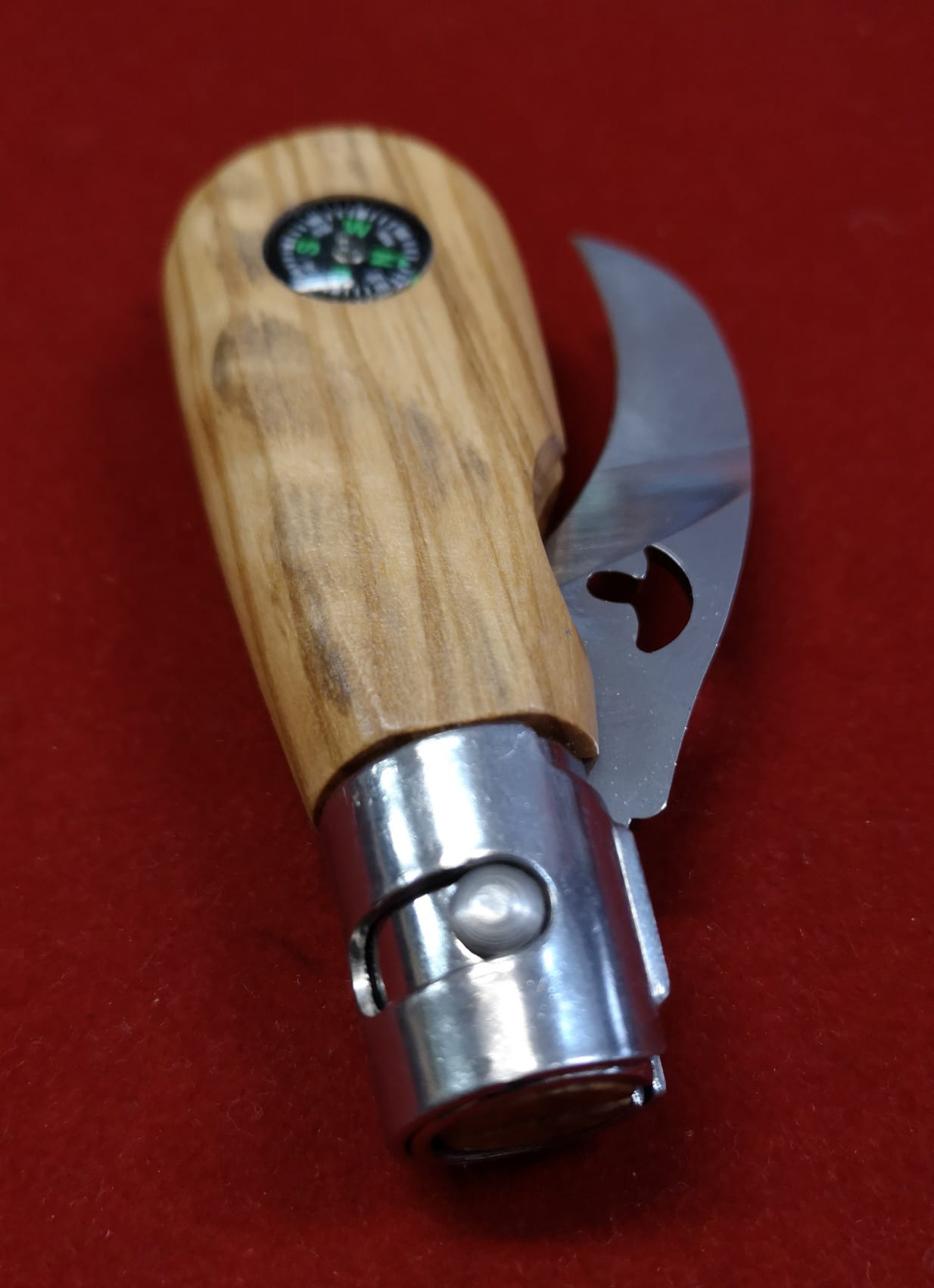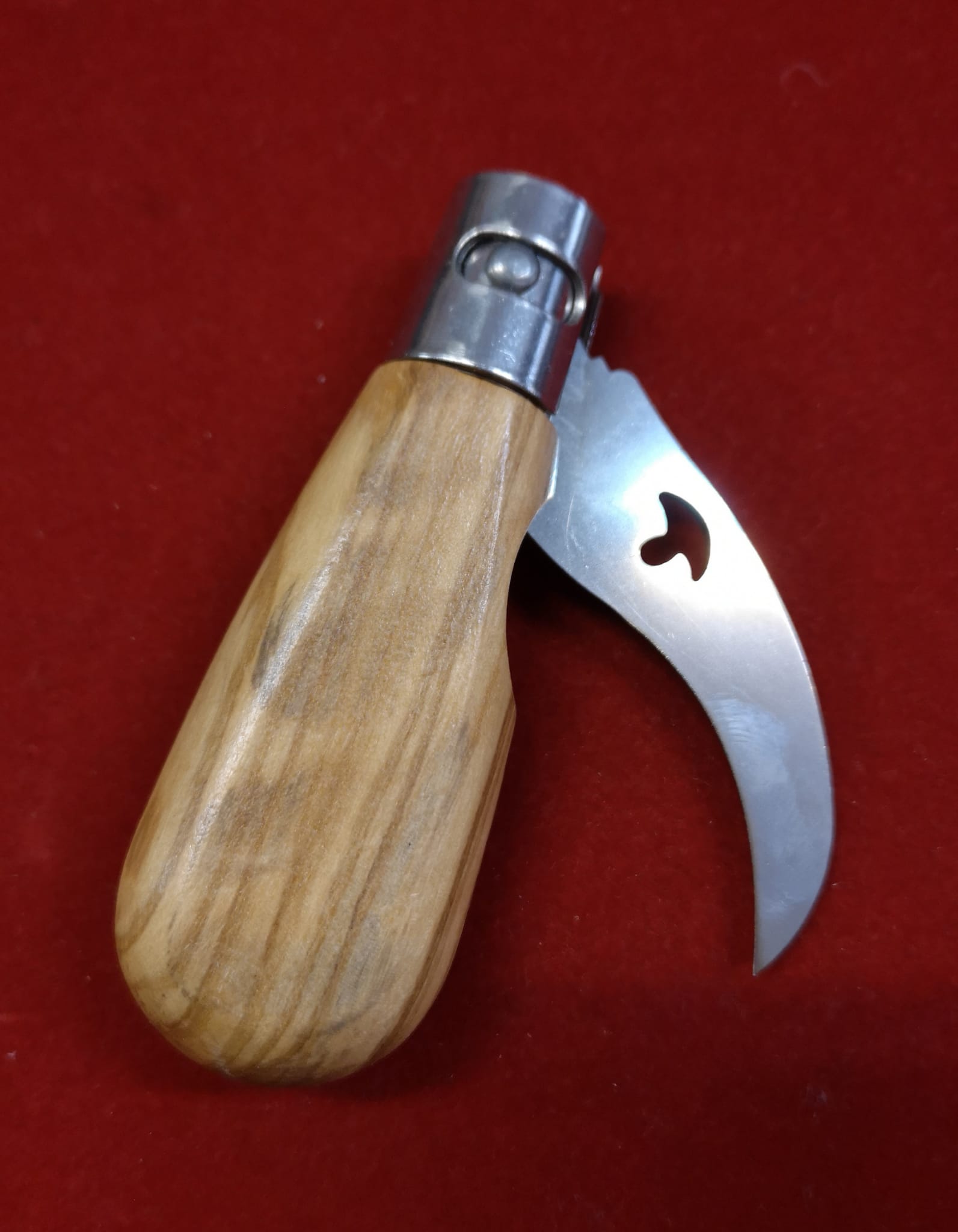 Bonita y original navaja de fabricación francesa para setas en preciosa madera de Olivo con brújula. Hoja curva con distintas aguas y logo calado de setas.