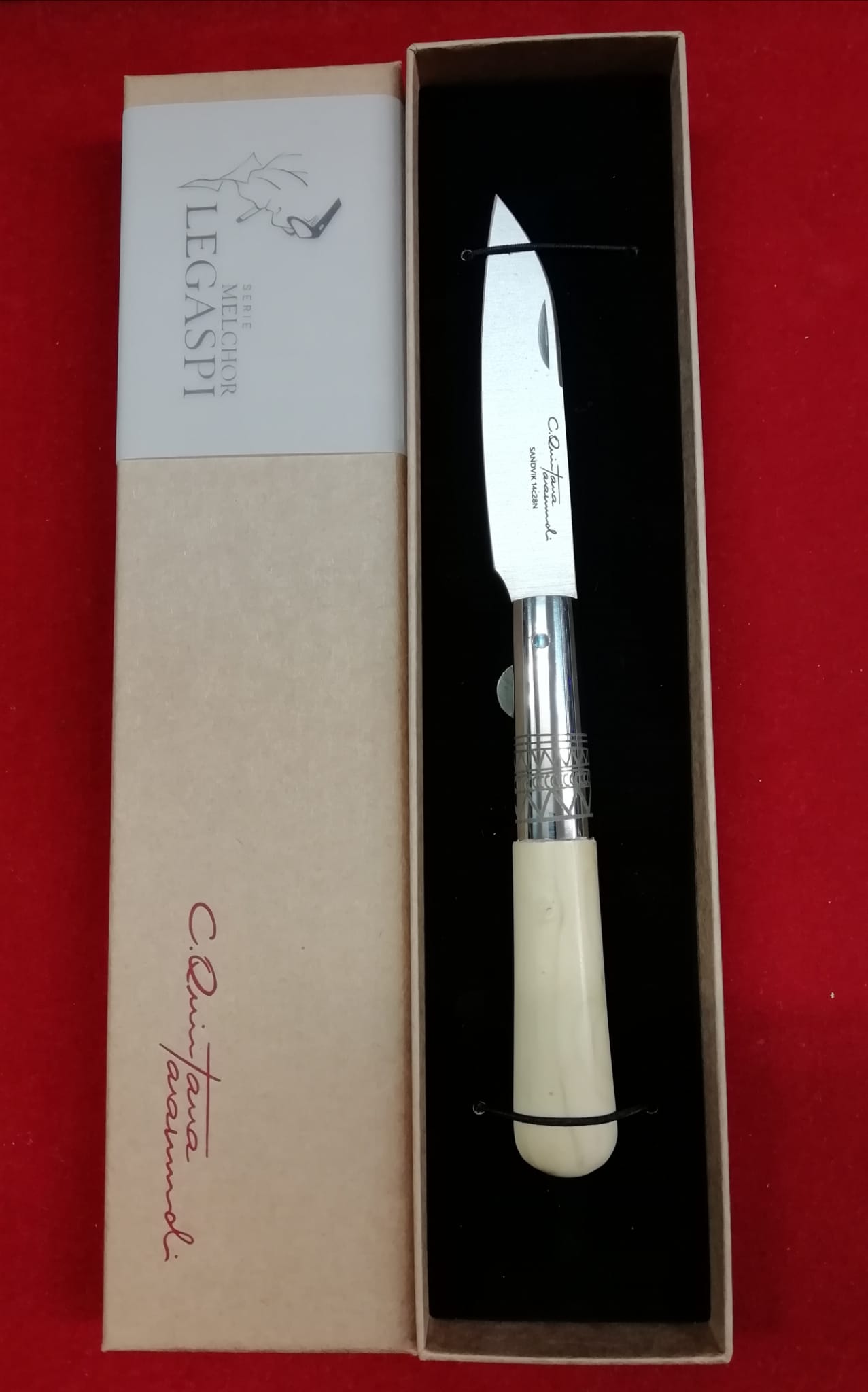 Pertenece a las navajas de categoría PREMIUM, gama alta, realizada al estilo de Melchor Legaspi en madera de BOJ, virola INOX decorada y hoja en exclusivo acero INOX Sandvid 14C18N con sistema de BLOQUEO.