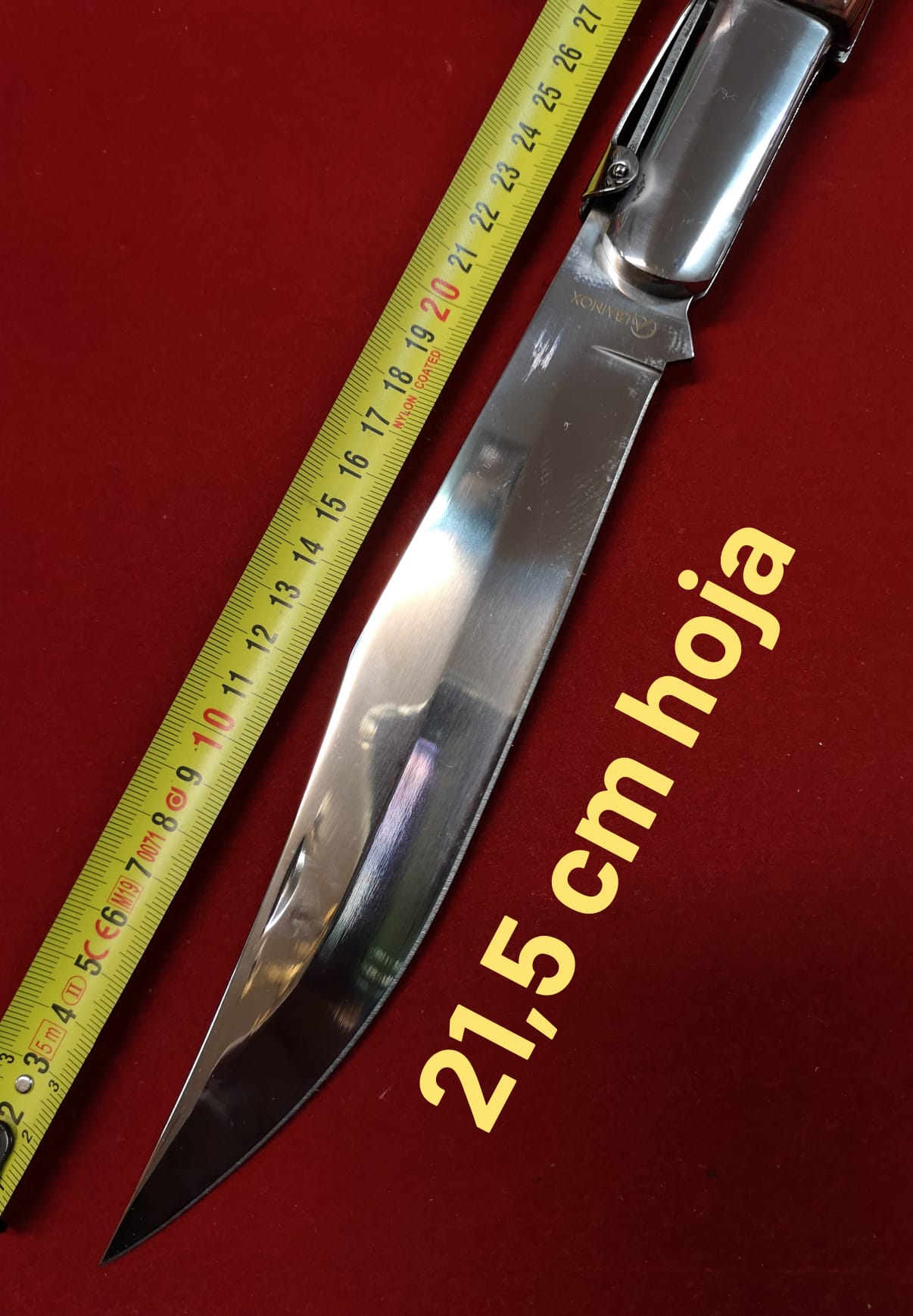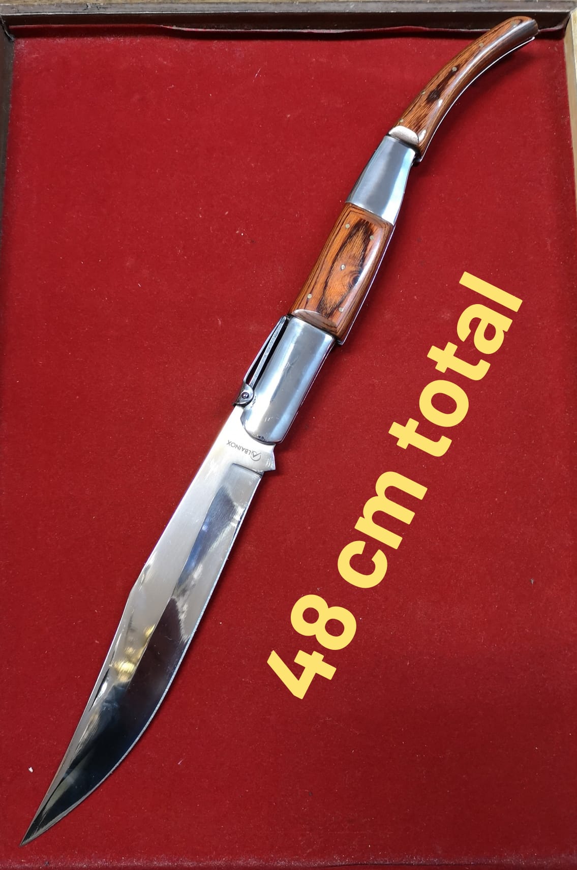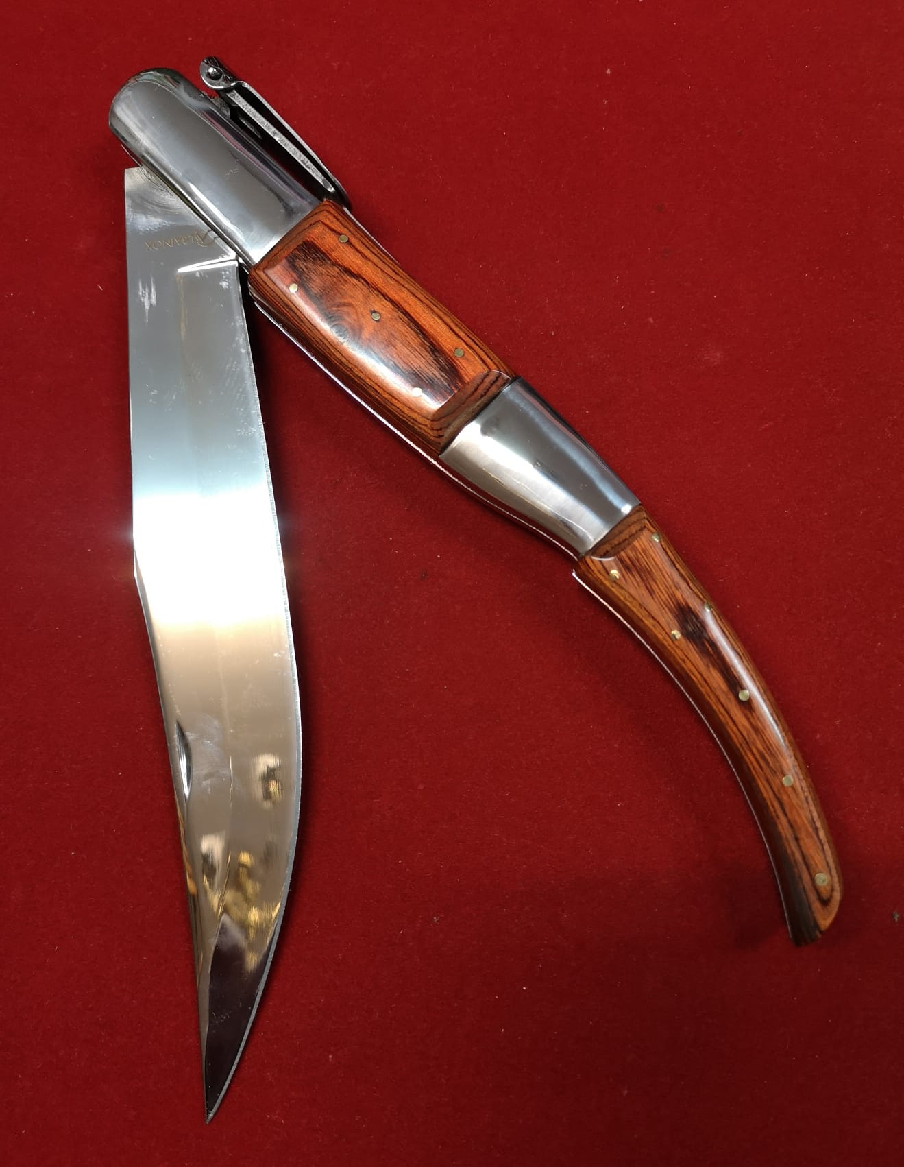 Navaja Albacete Martínez Albainox Carraca, 6 muelles, modelo ÁRABE, tamaño XXL, Gigante. Hoja acero inox de 21,8 cm con seguro. Medida abierta 47 cm. Mango stamina madera.