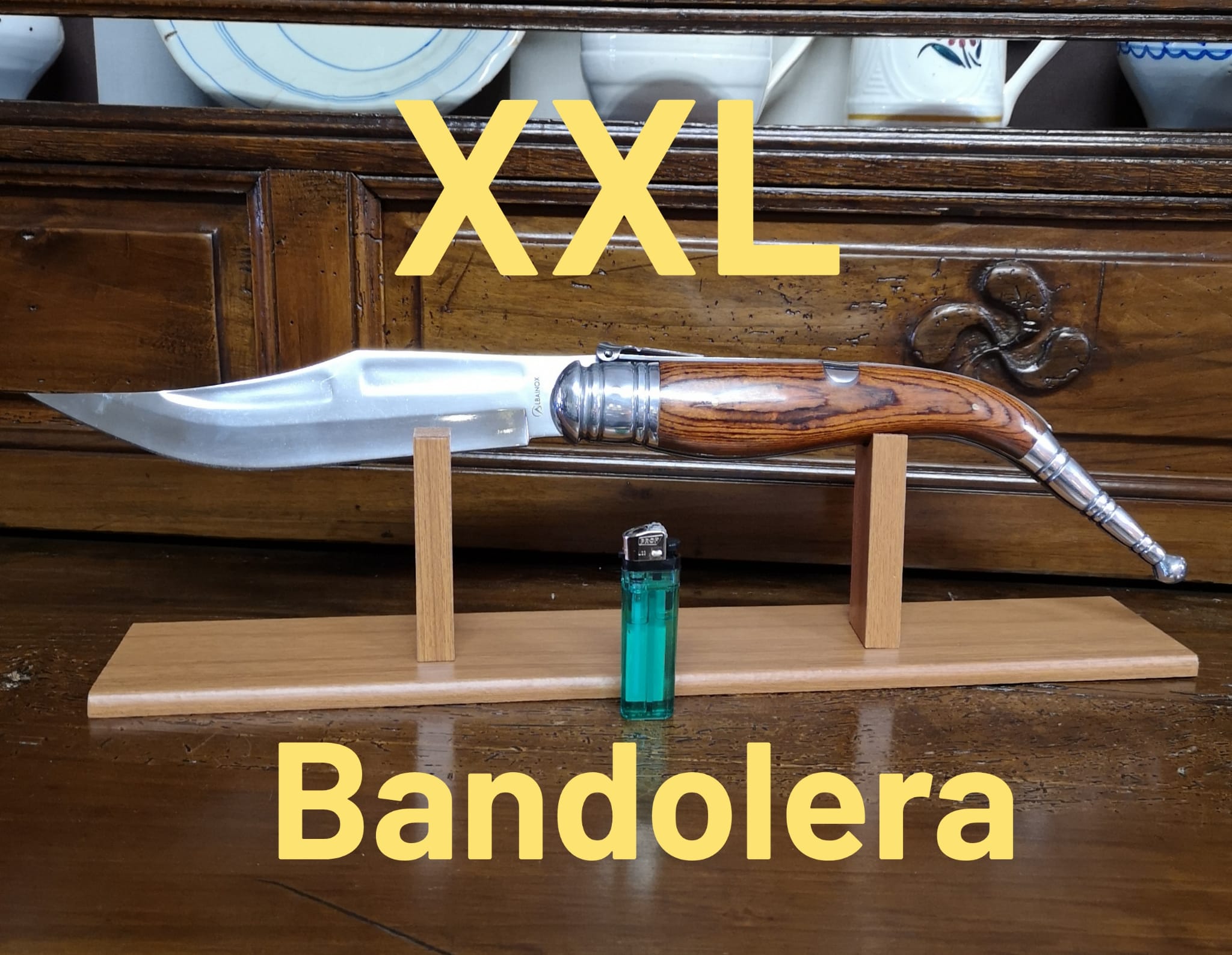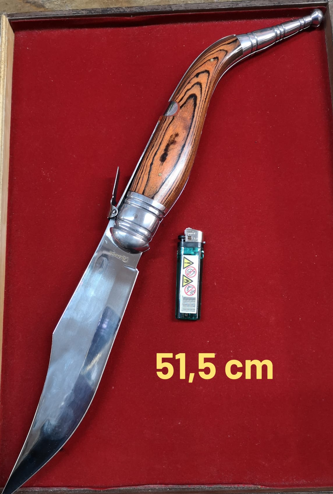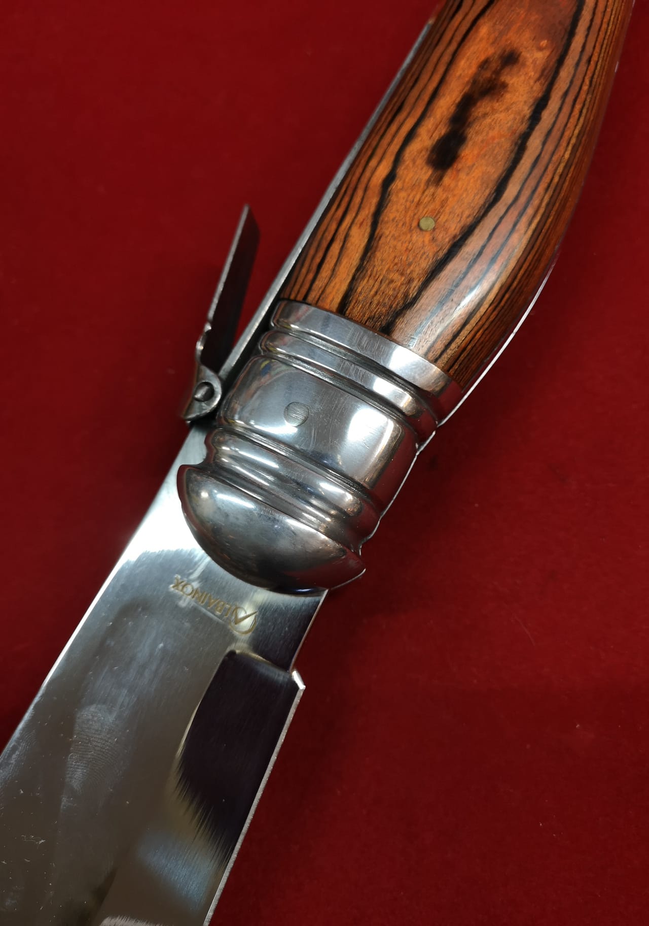 Navaja Albacete Martínez Albainox Carraca, 6 muelles, modelo BANDOLERA Carraca XXL, Gigante. Hoja acero inoxidable con seguro de 22 cm. Medida abierta 52 cm. Mango en stamina madera. Virola aluminio.