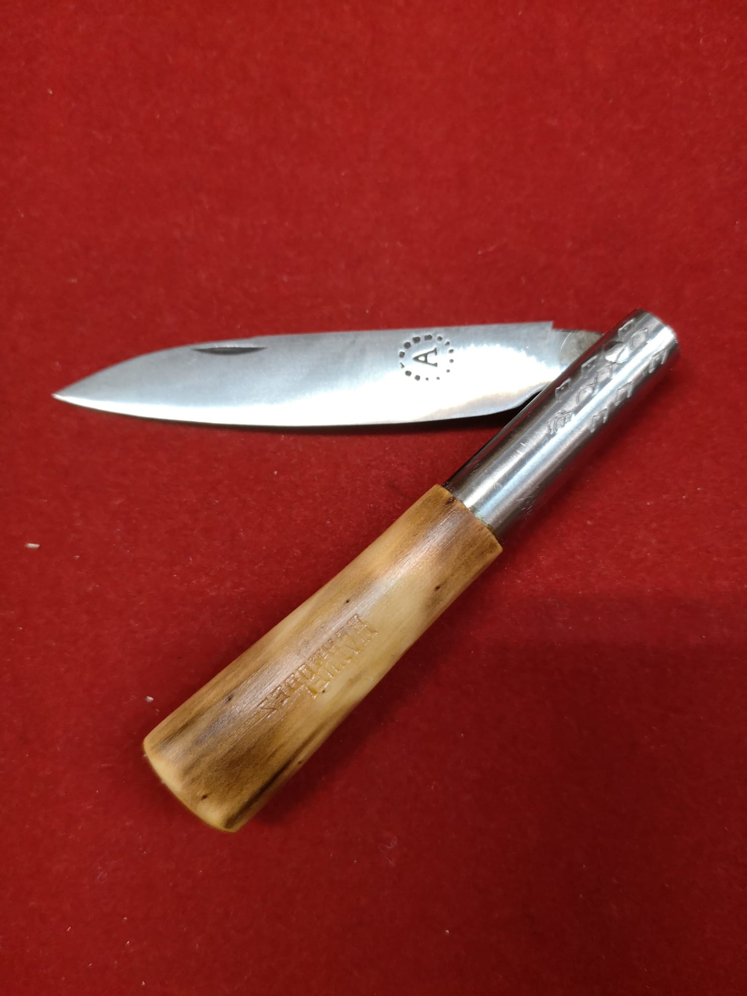 Navaja Artesana de Taramundi, Asturias, realizada manualmente por maestro artesano José Luis Bermúdez, firmada con una A en círculo en su exclusiva hoja en ACERO CARBONO de punta recta de 9 cm.