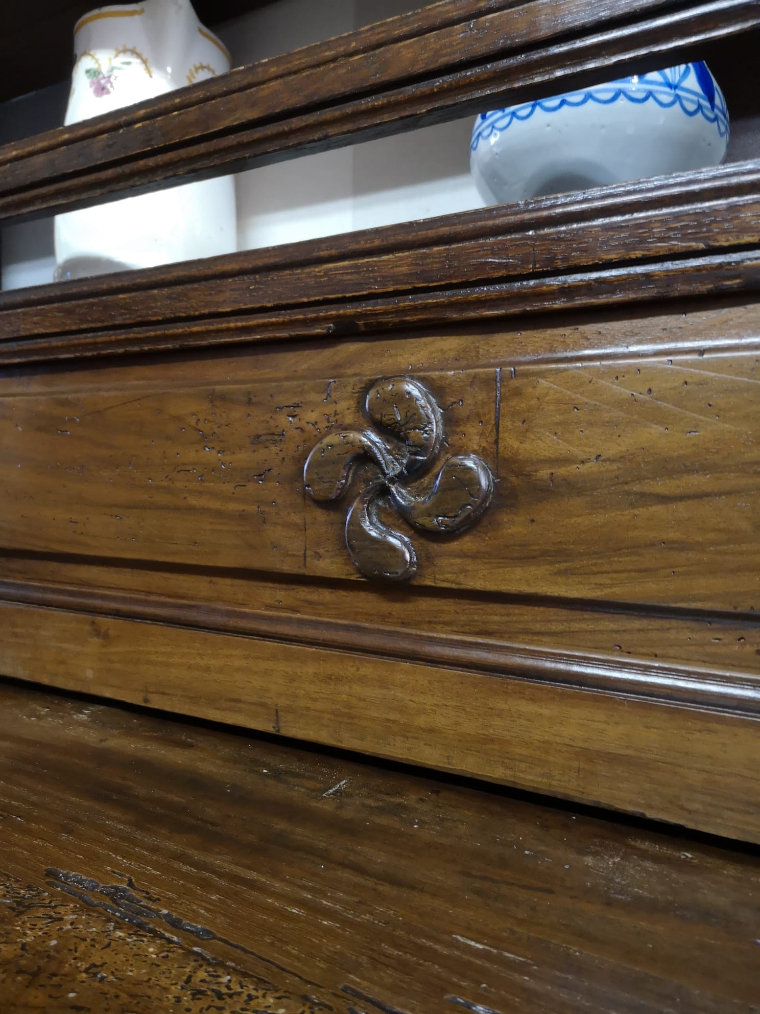 Herraje original y panera y cajón con talla de tetratrisquel o lauburu,. Muy raro.