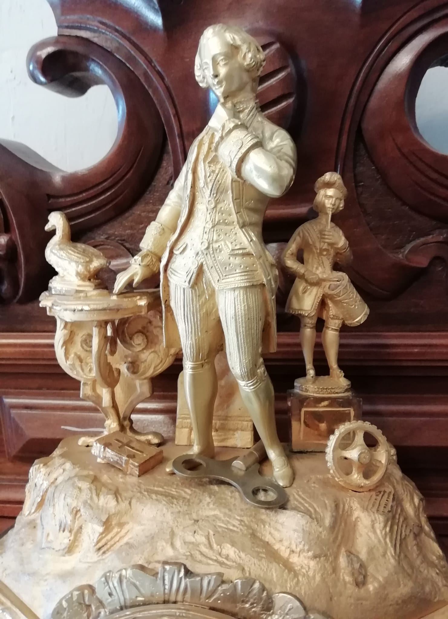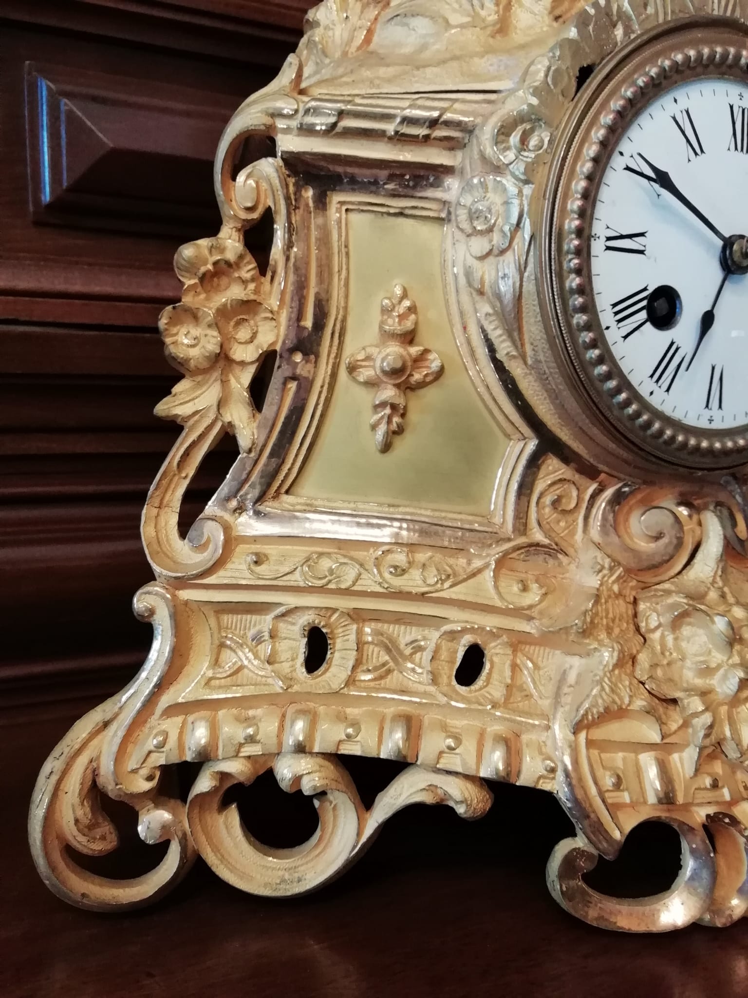 Reloj de sobremesa en bronce dorado al mercurio, S XIX, en muy buen estado. Combina oro mate con oro bruñido con brillo realzando su belleza.