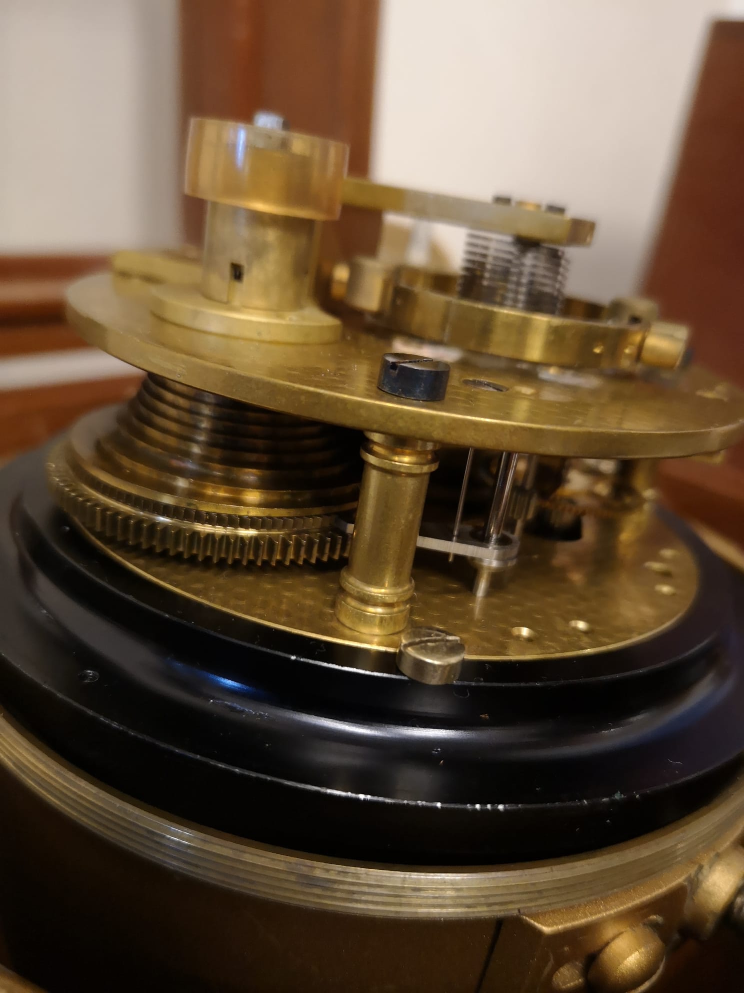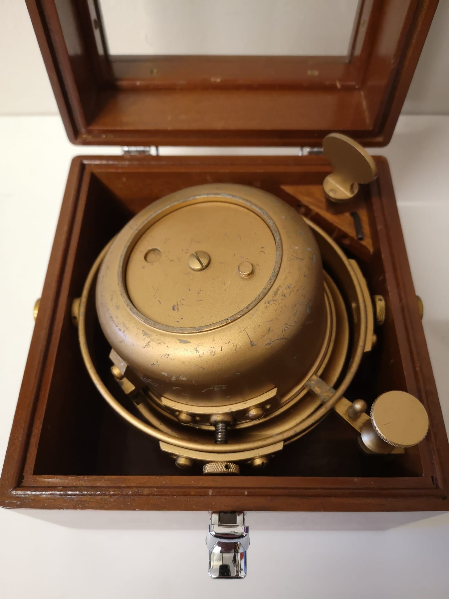 La caja alberga el movimiento en latón sobre cardan, como es habitual para que no sufra con el oleaje.