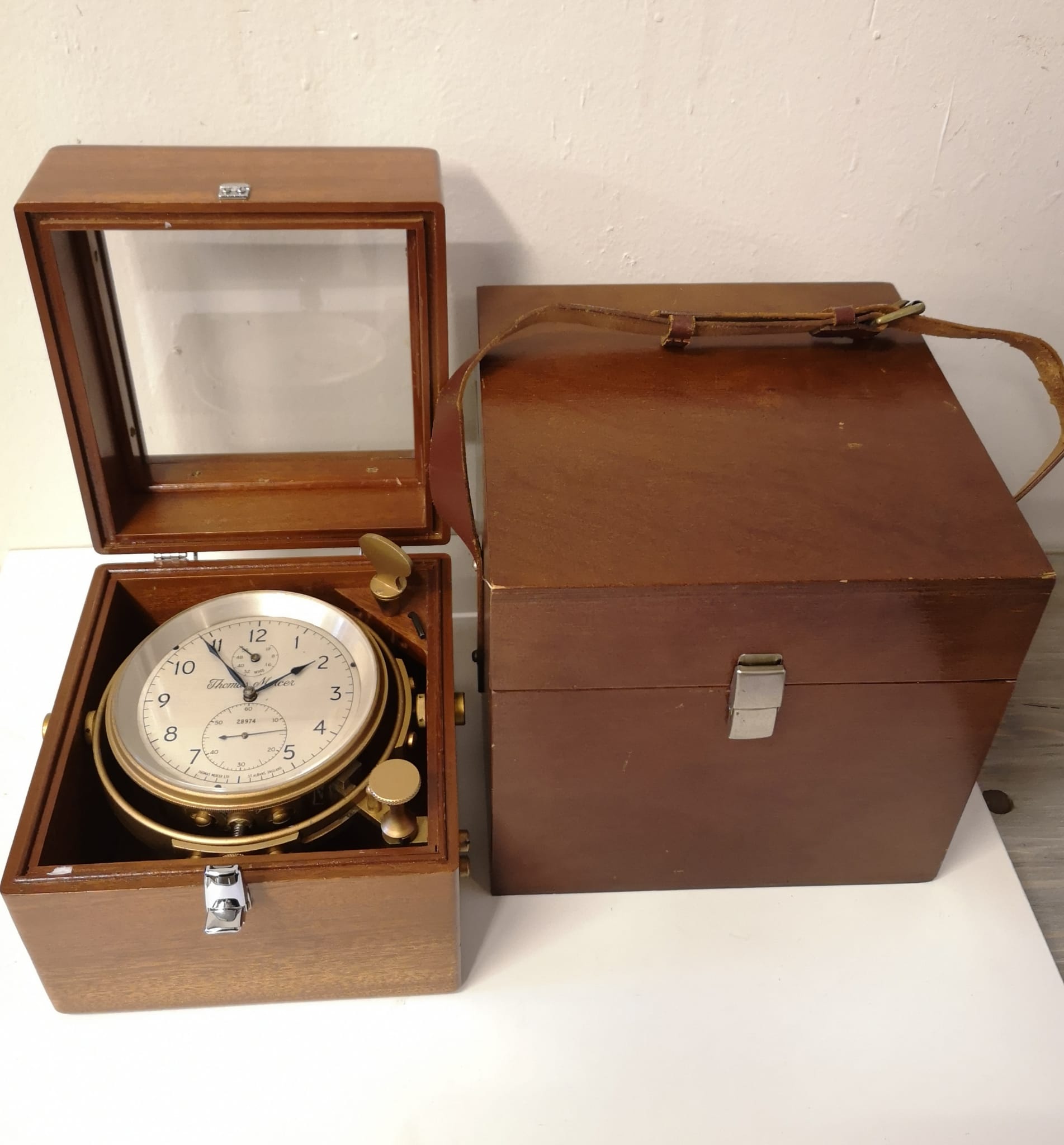 Caja realizada en madera de caoba con tapa de cristal, cuenta también con su segunda caja para transportarlo, q no siempre conservan estos relojes.