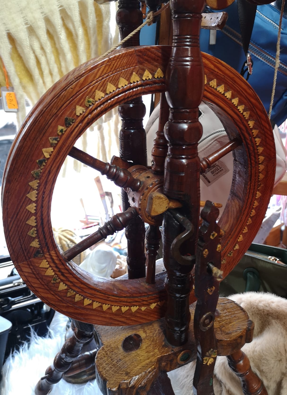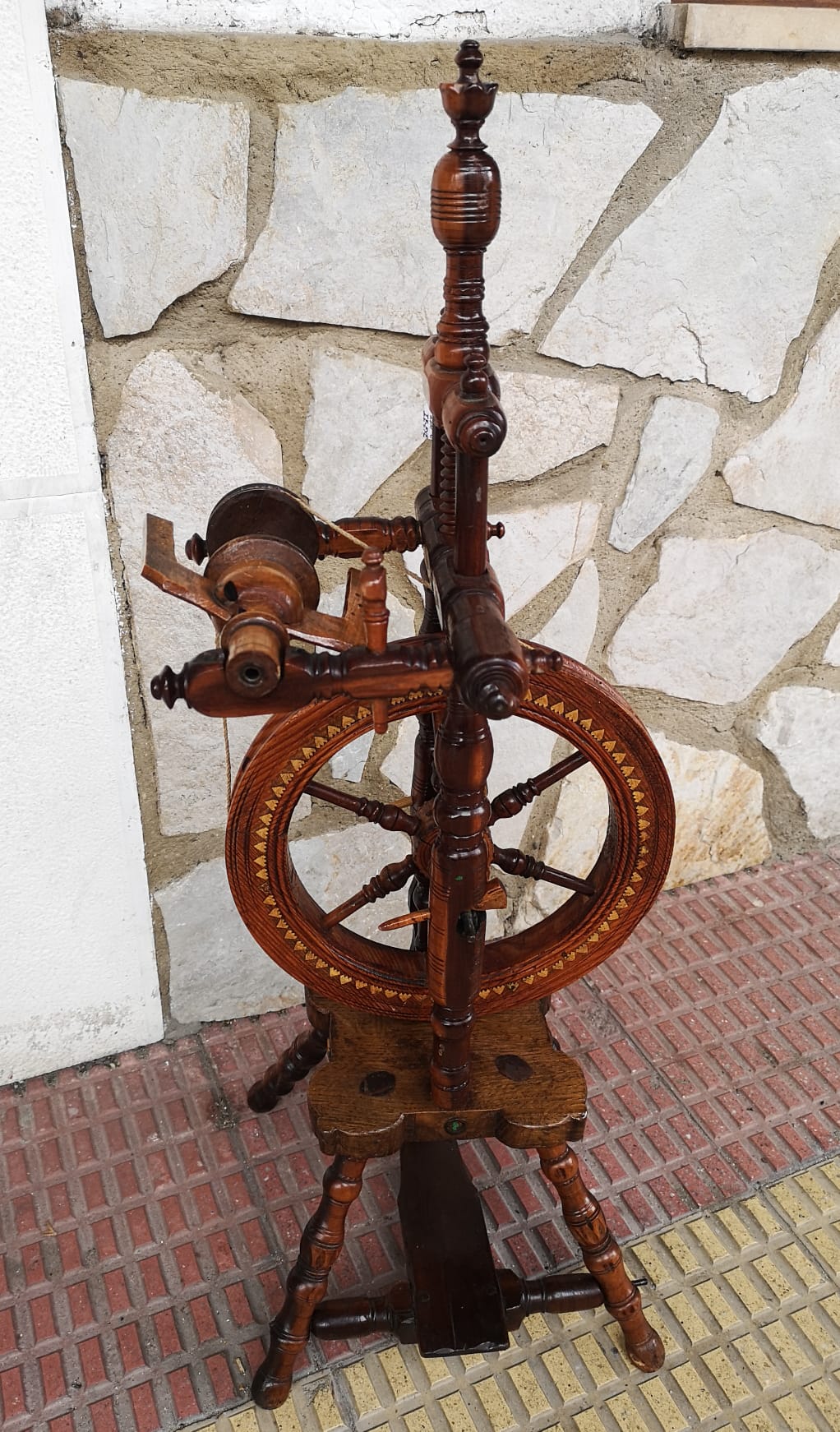Antiguo torno de hilar o rueca con decoración tradicional. Perfecto estado.