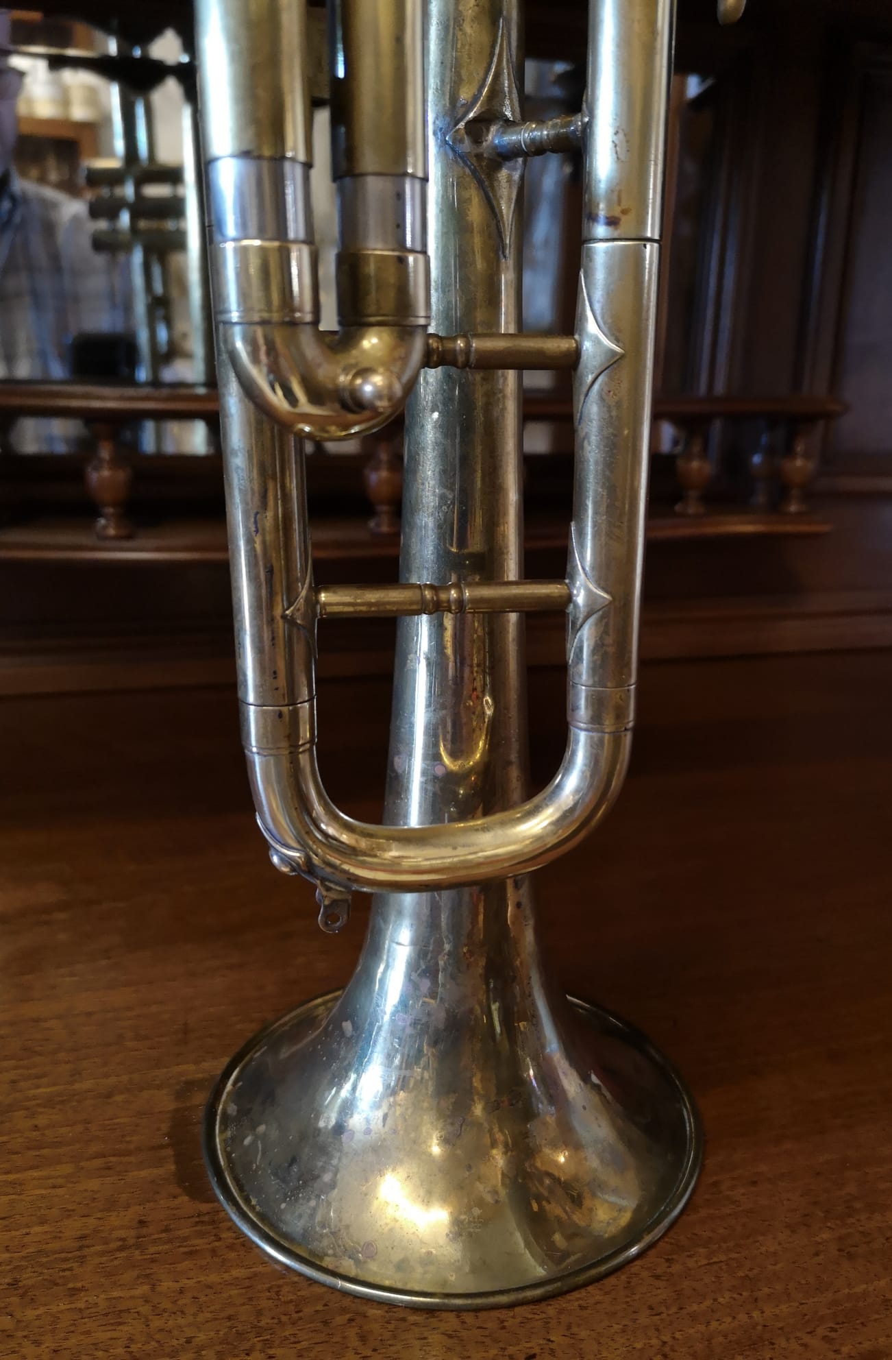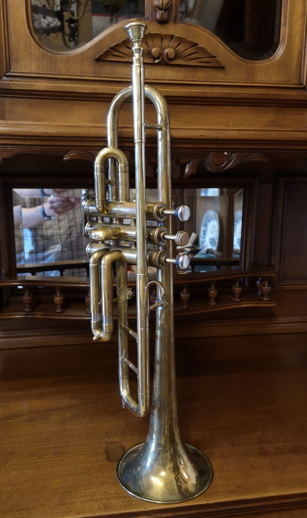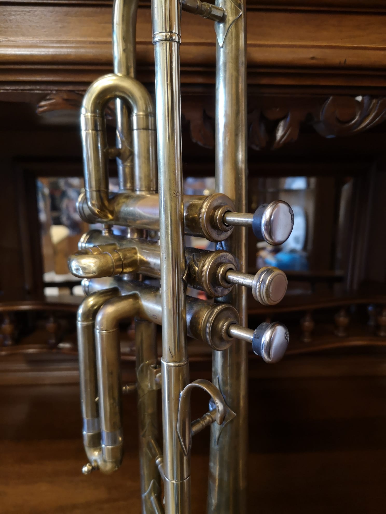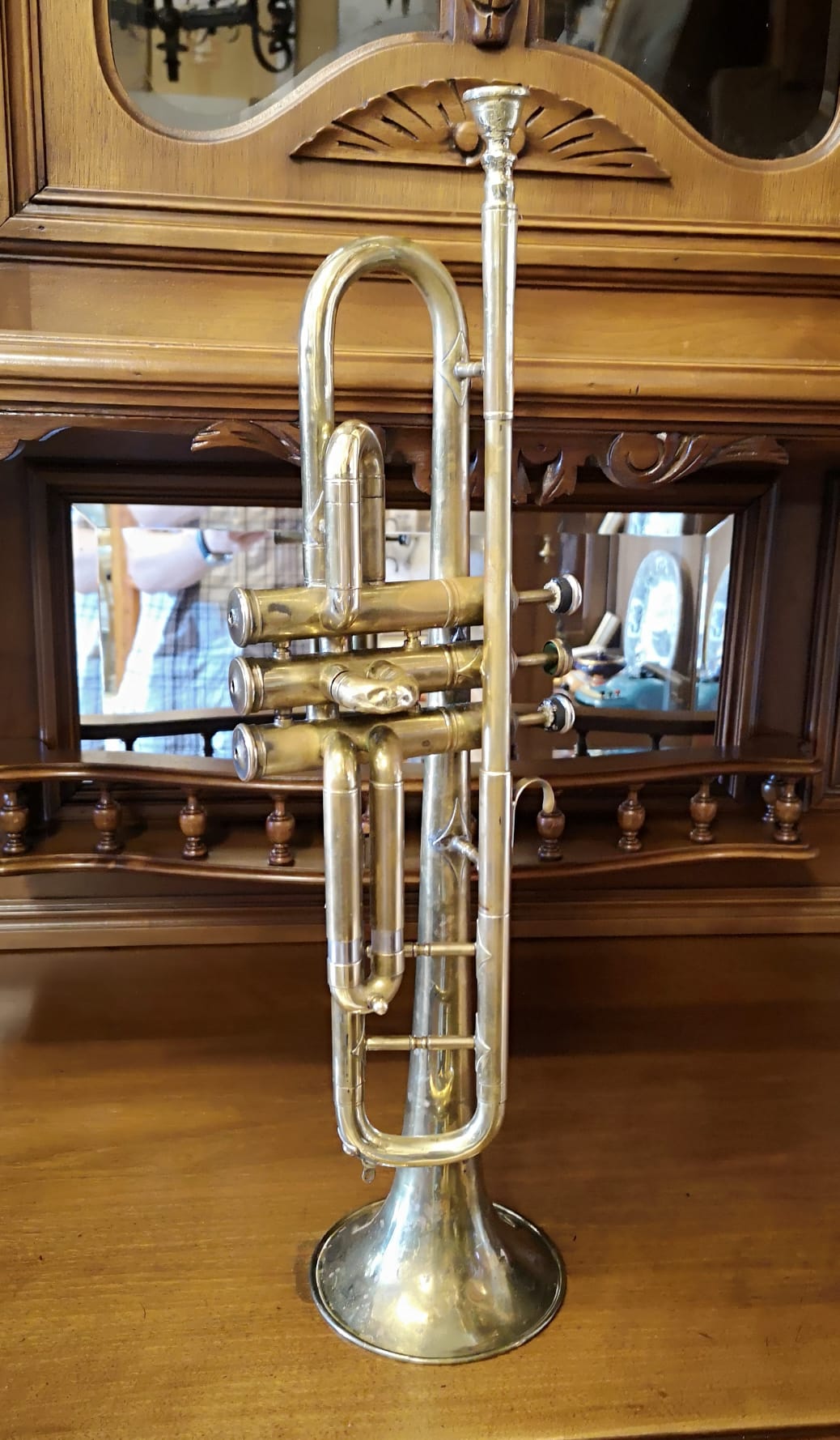 Trompeta antigua con señales del paso del tiempo pero en bastante buen estado general.